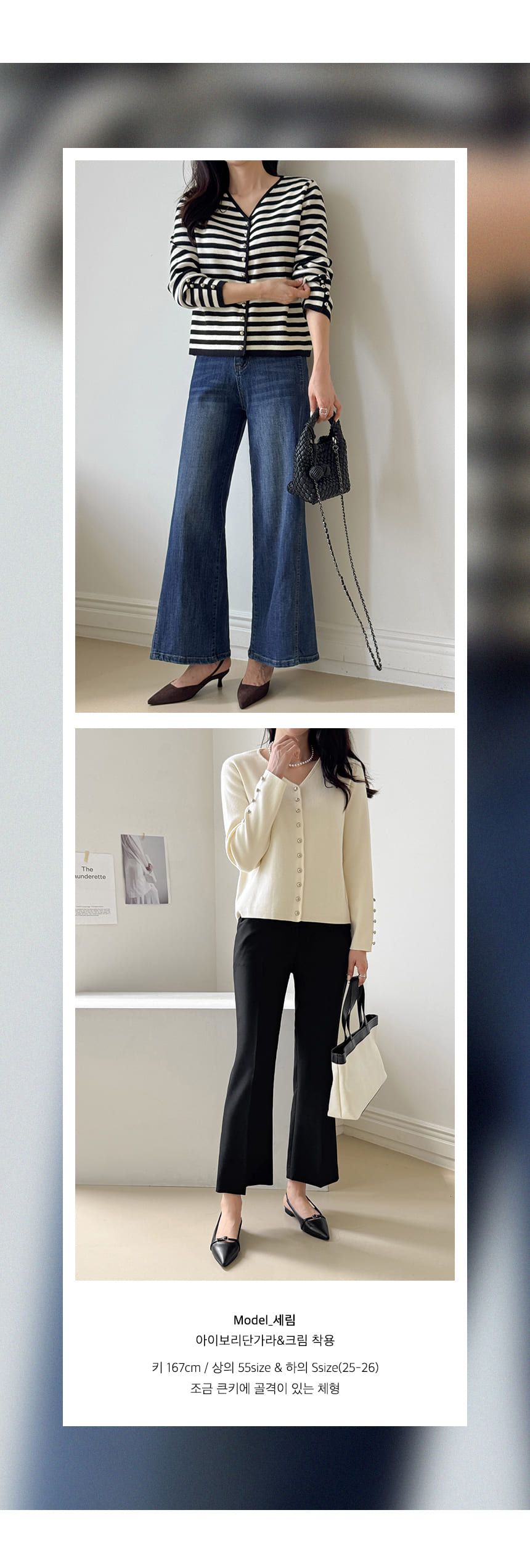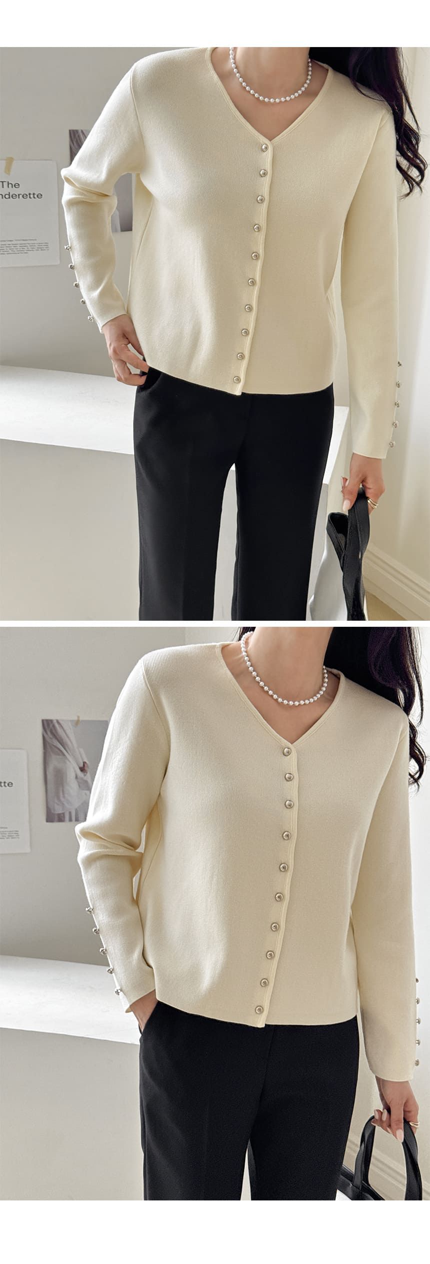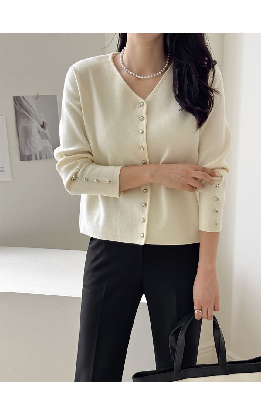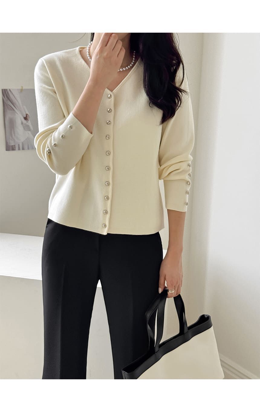 條紋色&素色/V領/開襟排釦/立體金屬鈕釦/袖釦造型 - 休閒居家簡約百搭素面配色條紋上衣條紋外套條紋針織衫針織上衣開襟衫立體排釦針織衫長袖上衣外套條紋色奶油色黑色