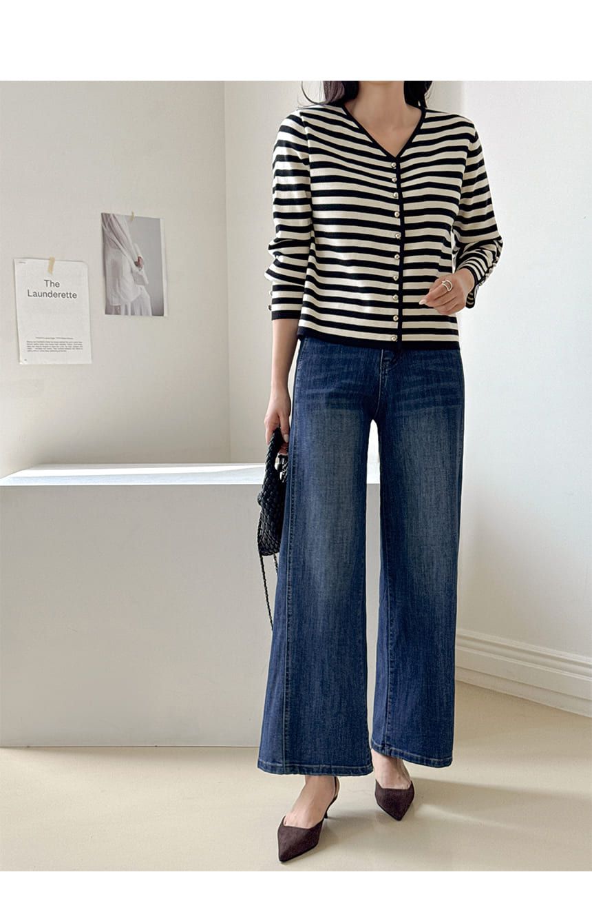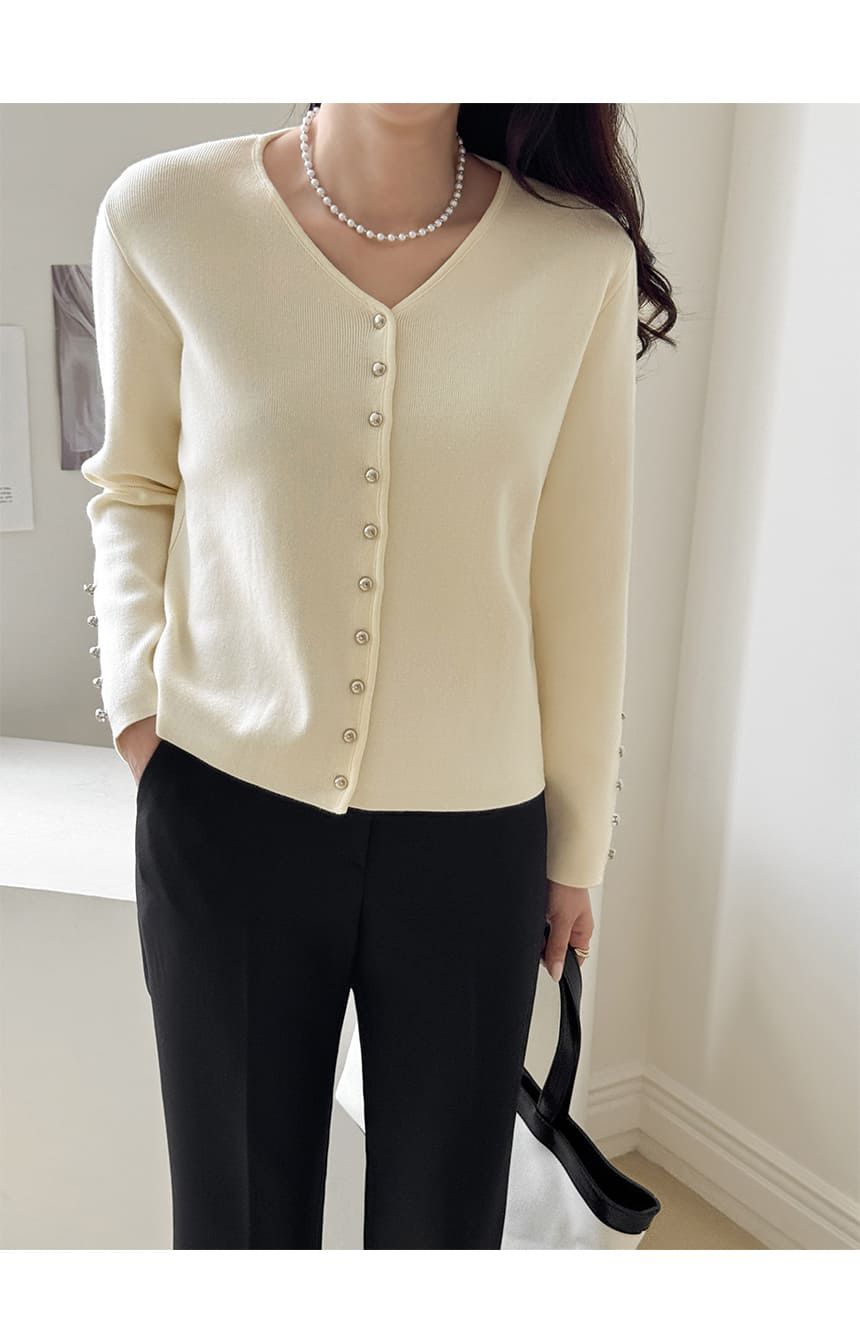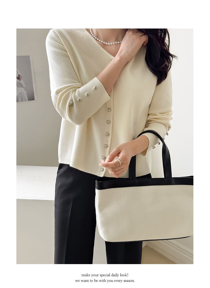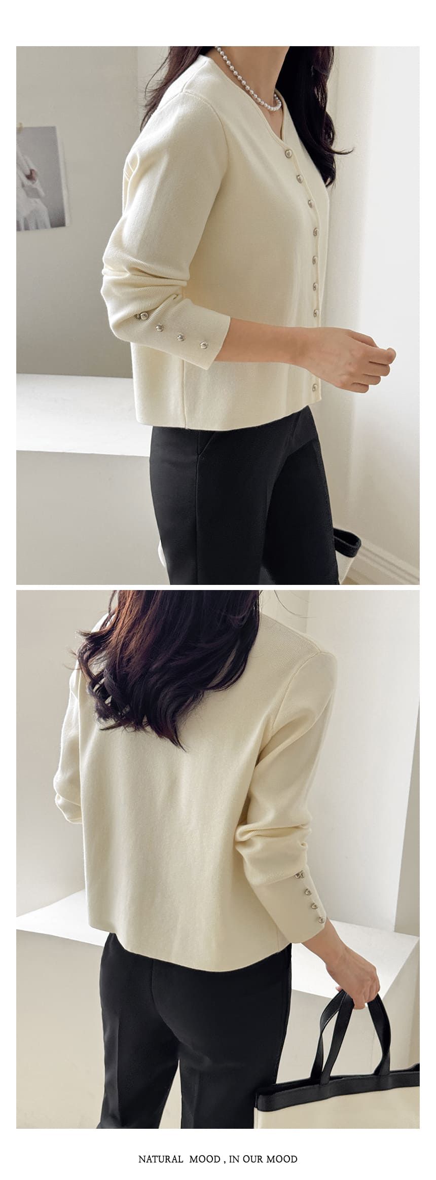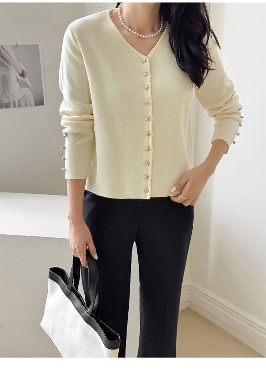 條紋色&素色/V領/開襟排釦/立體金屬鈕釦/袖釦造型 - 休閒居家簡約百搭素面配色條紋上衣條紋外套條紋針織衫針織上衣開襟衫立體排釦針織衫長袖上衣外套條紋色奶油色黑色