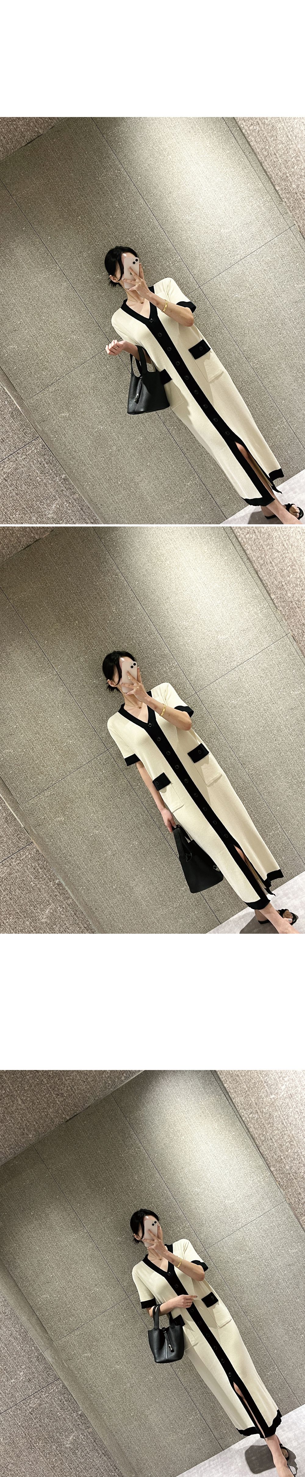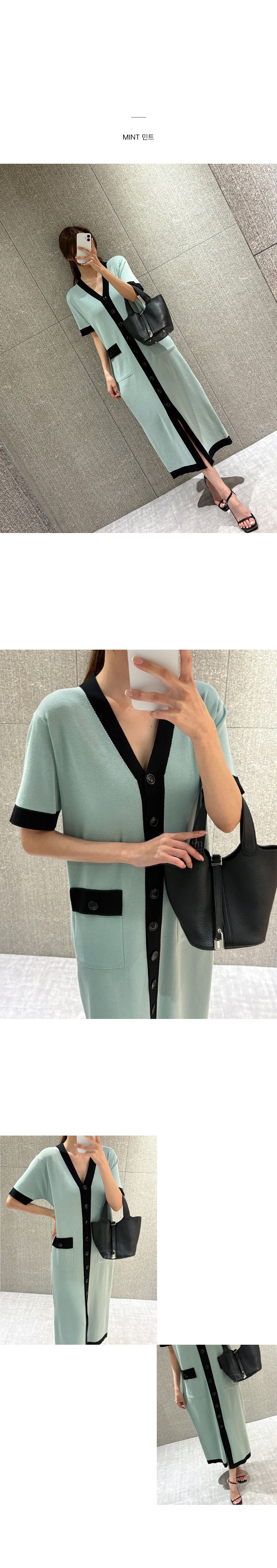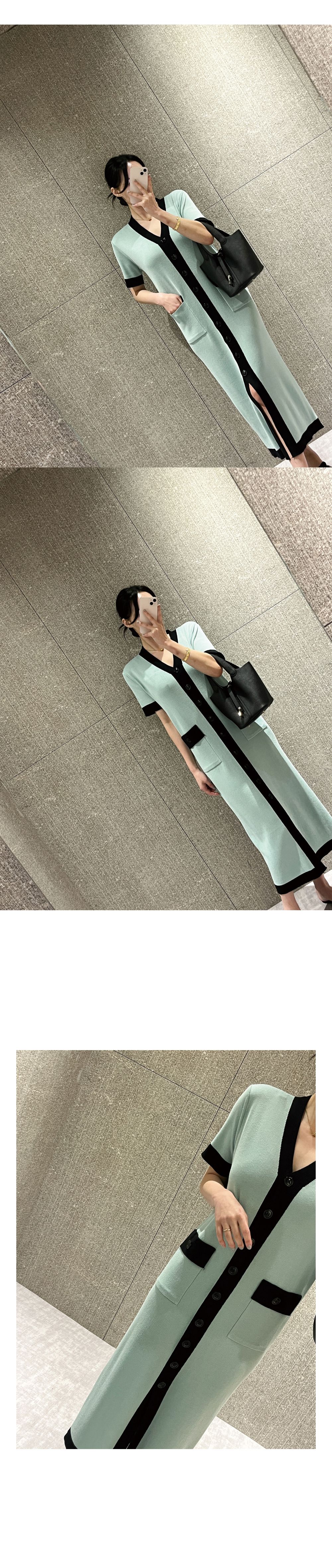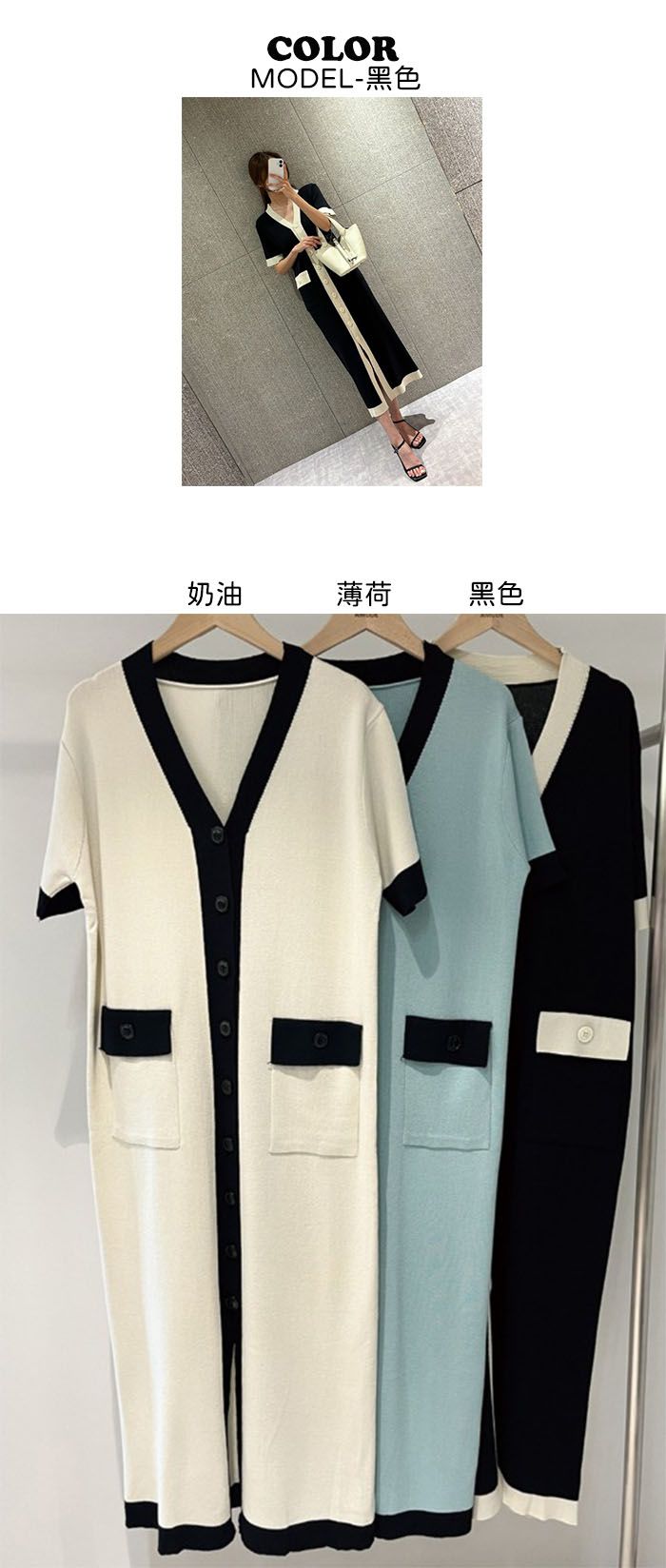 撞色滾邊/雙口袋/開襟排釦/前開衩/V領 - 休閒居家OL上班族婚禮簡約百搭素面滾邊針織洋裝一件式洋裝短袖洋裝短袖連身裙薄荷色黑色奶油色
