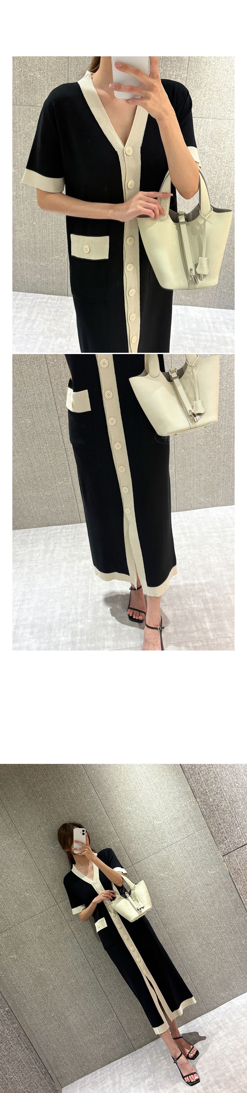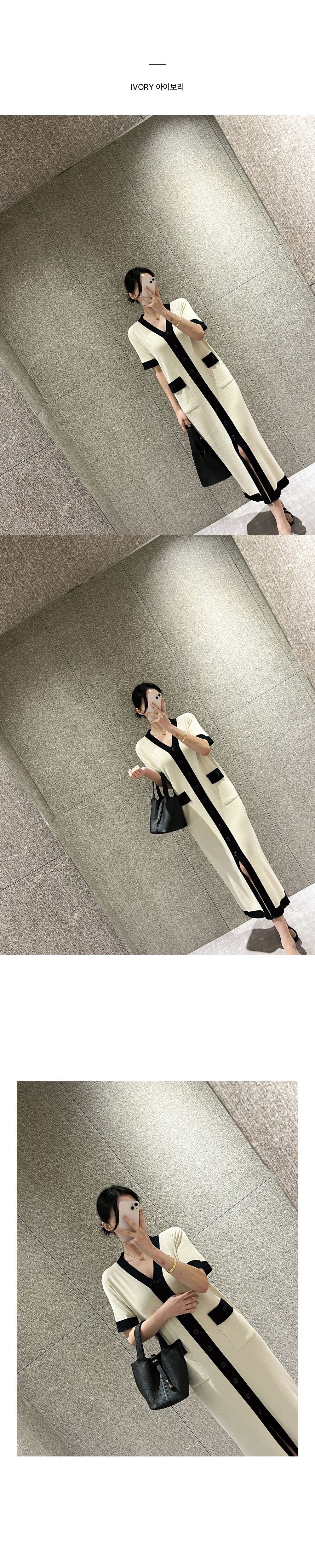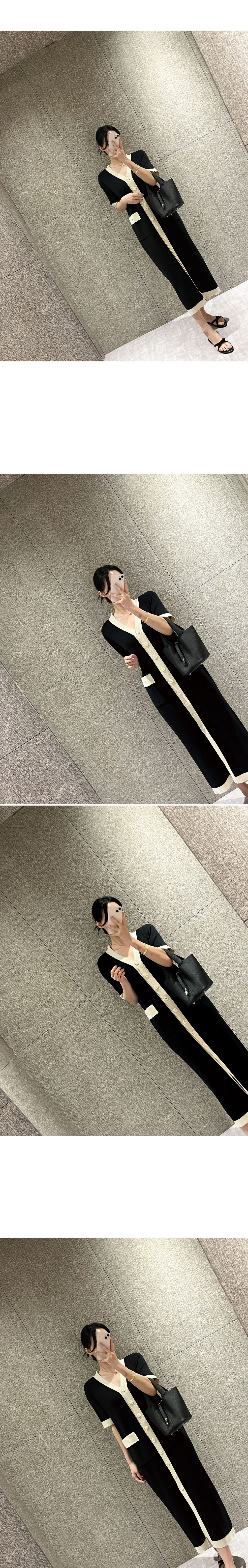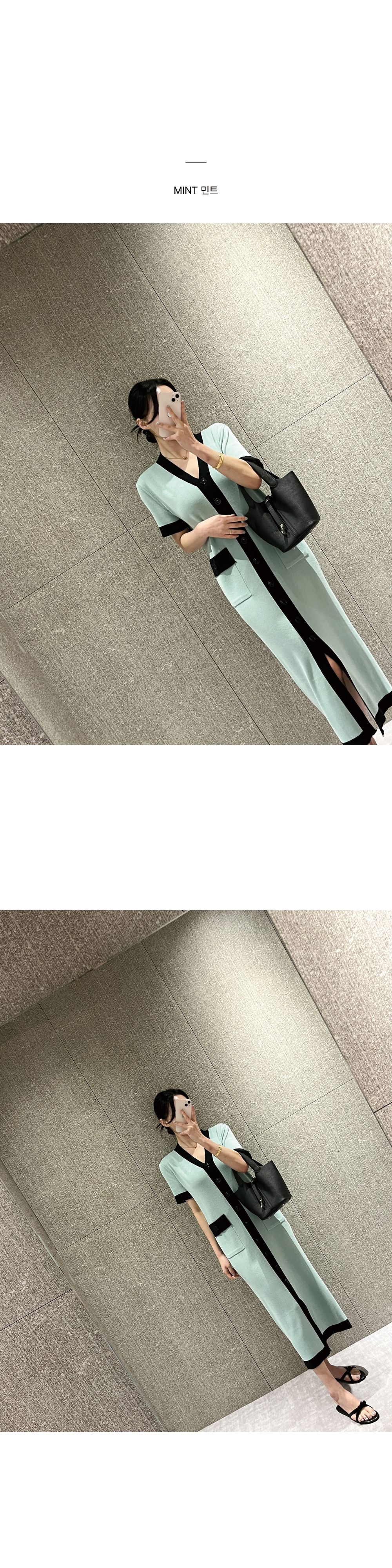 撞色滾邊/雙口袋/開襟排釦/前開衩/V領 - 休閒居家OL上班族婚禮簡約百搭素面滾邊針織洋裝一件式洋裝短袖洋裝短袖連身裙薄荷色黑色奶油色