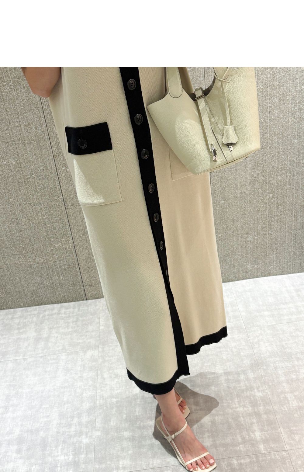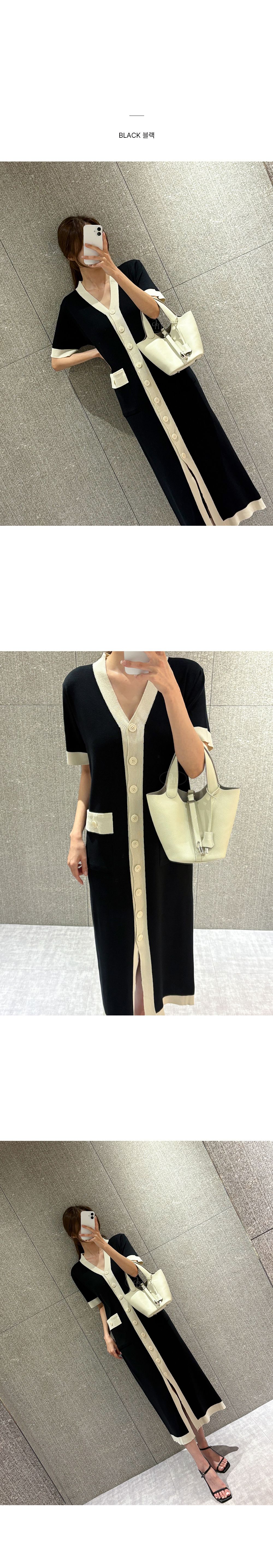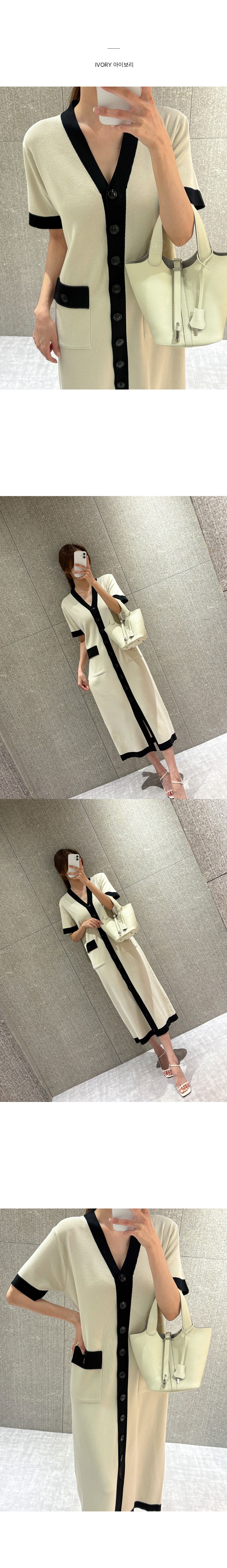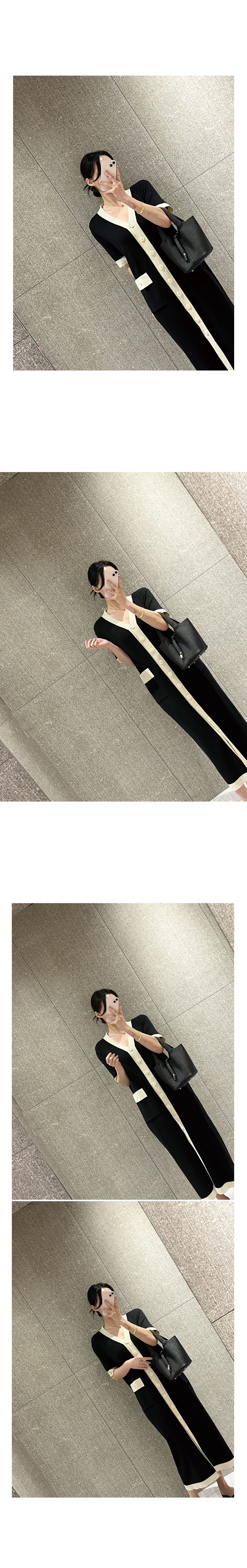 撞色滾邊/雙口袋/開襟排釦/前開衩/V領 - 休閒居家OL上班族婚禮簡約百搭素面滾邊針織洋裝一件式洋裝短袖洋裝短袖連身裙薄荷色黑色奶油色