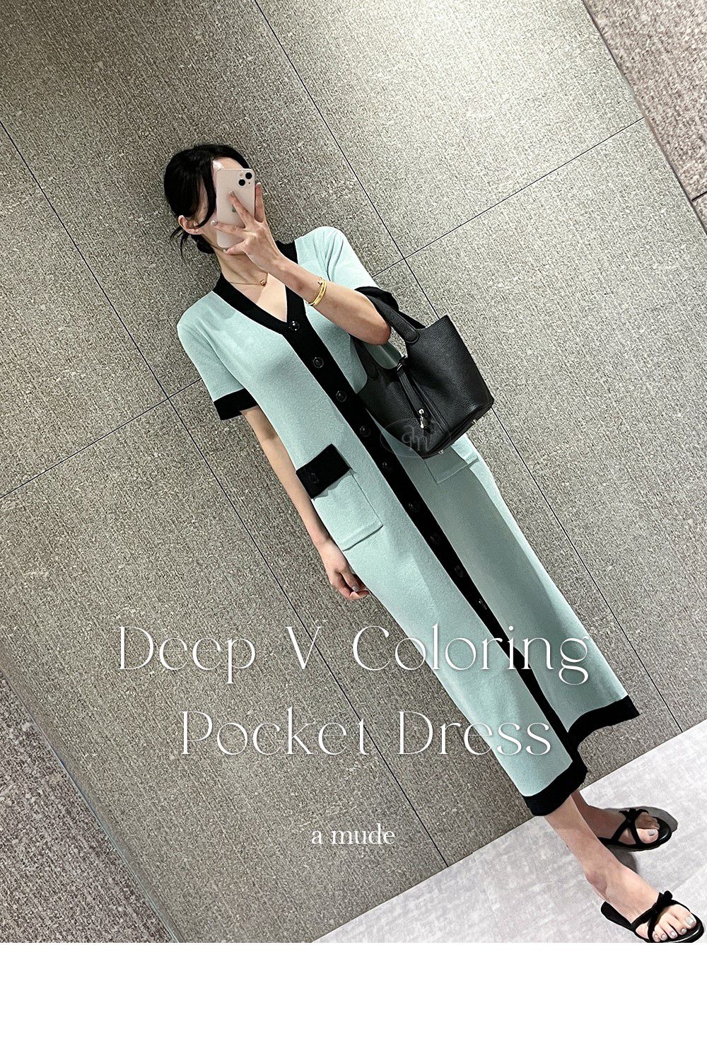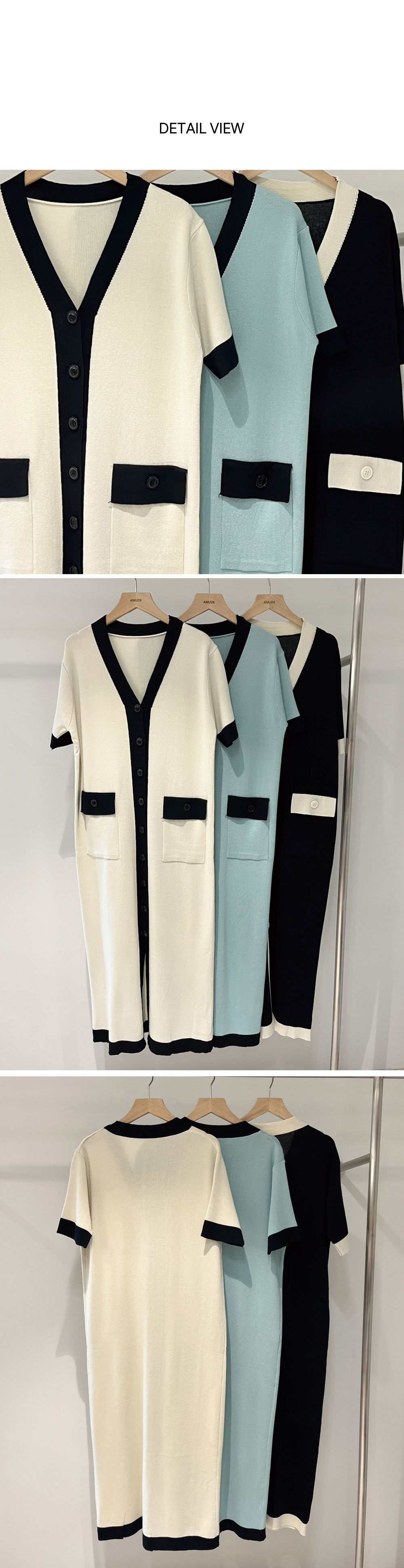 【C55364】韓國AMU 滾邊針織洋裝-素面雙口袋開襟排釦V領短袖連身裙★★