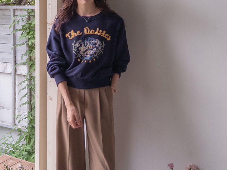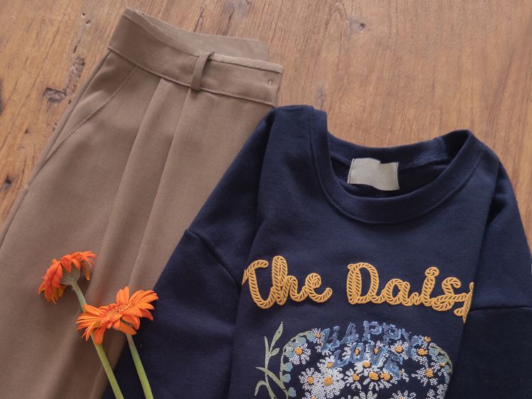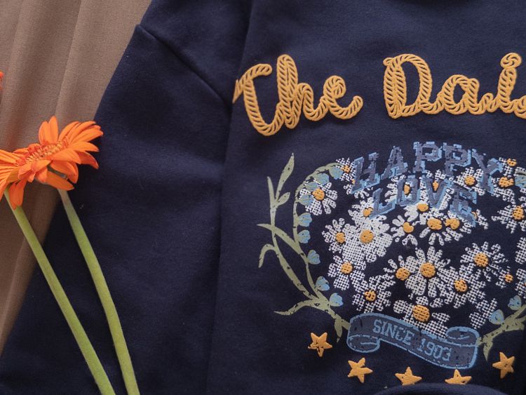 麻繩字母/泡棉字母/膠印花朵/寬鬆短版/圓領/棉質/毛圈棉/中厚面料 - 休閒居家英文字母上衣字母T恤花朵印花上衣印花T恤短版花花上衣寬鬆大尺碼上衣短版上衣長袖棉質印花T恤深藍色燕麥色灰色