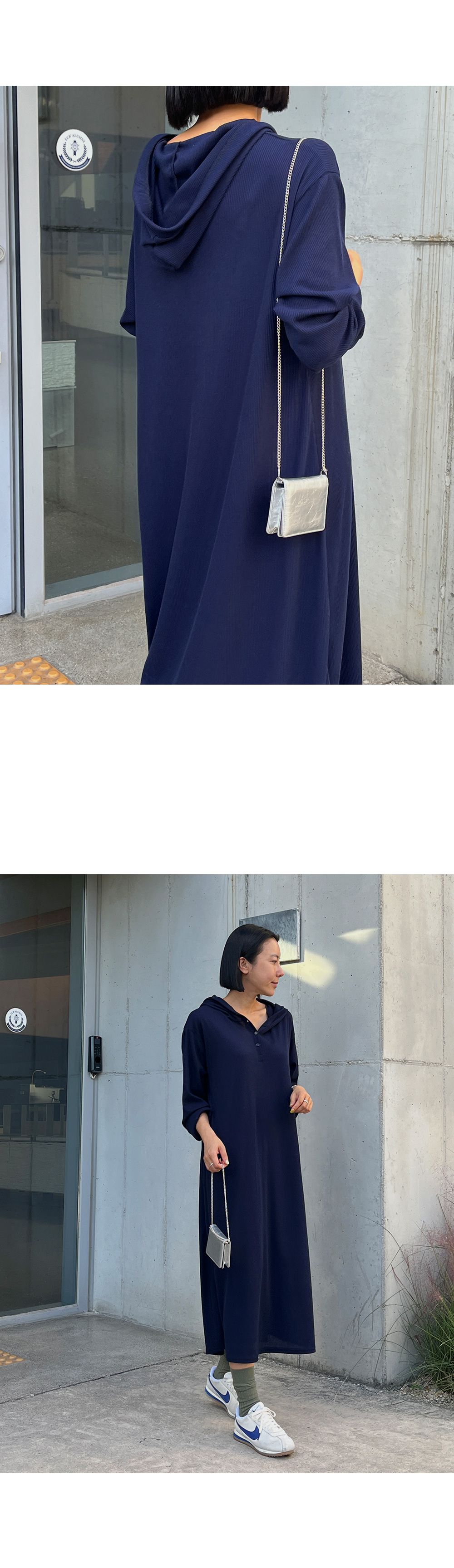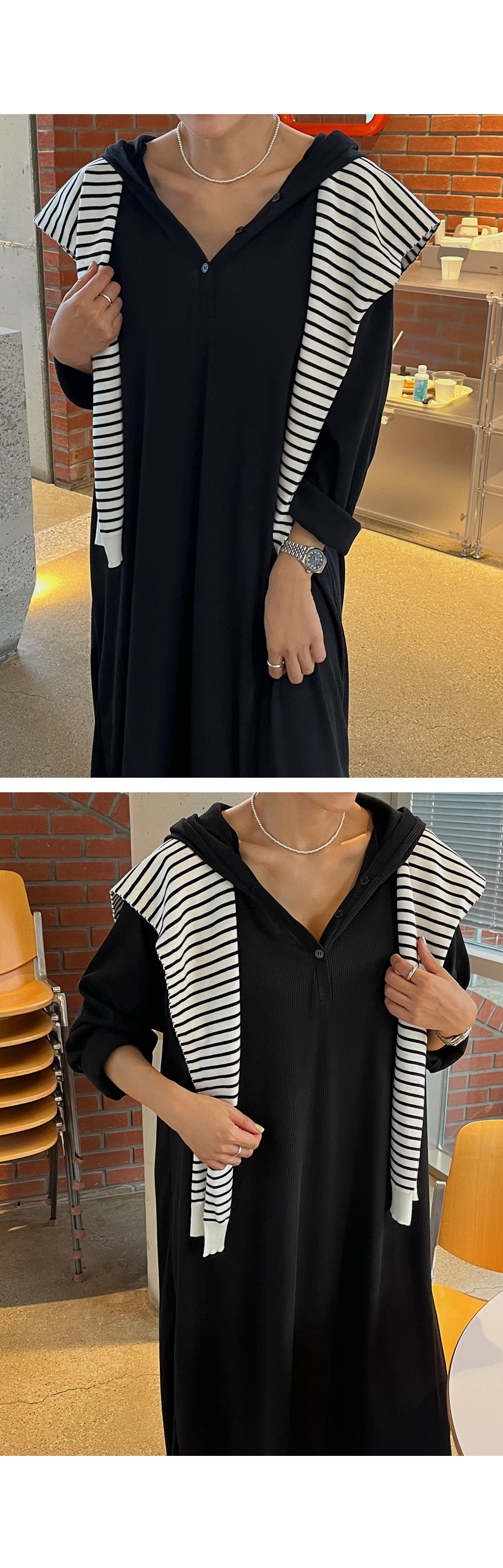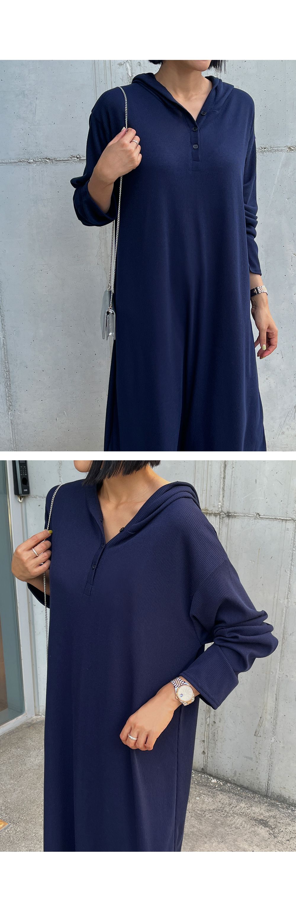 坑條羅紋面料/半開襟排釦/直筒洋裝/連帽/無口袋 - 休閒居家簡約百搭素面坑條連帽洋裝坑條洋裝羅紋洋裝長袖連身裙一件式洋裝深藍色黑色