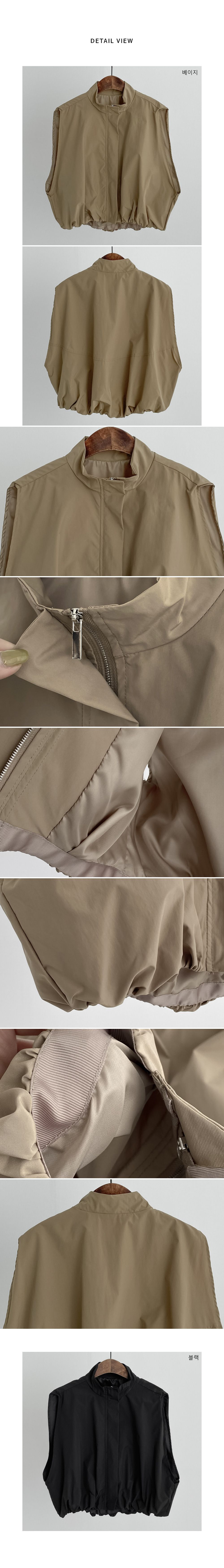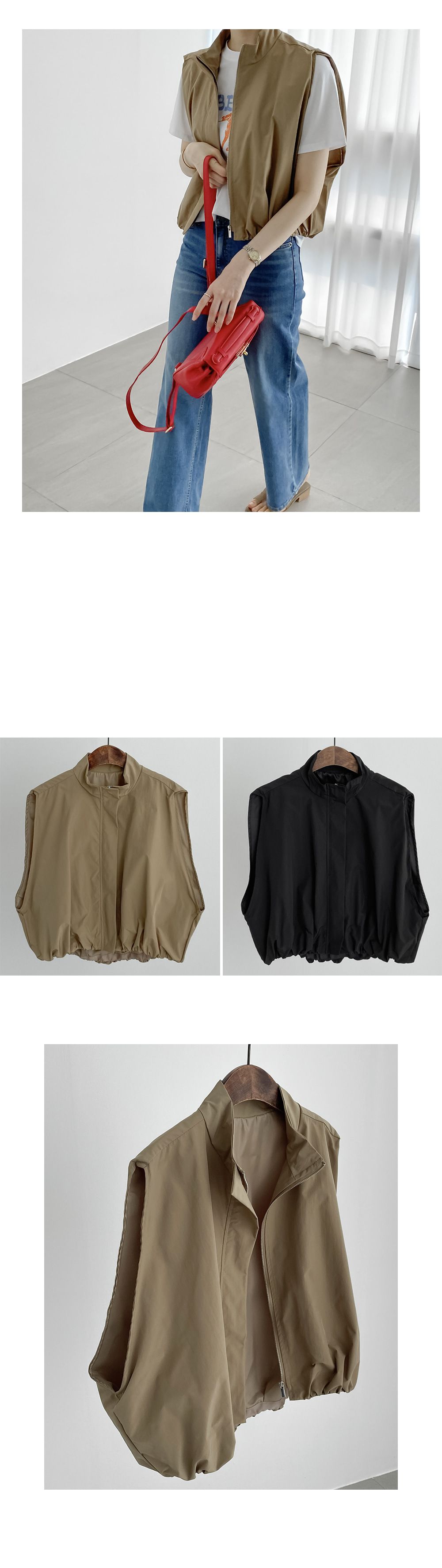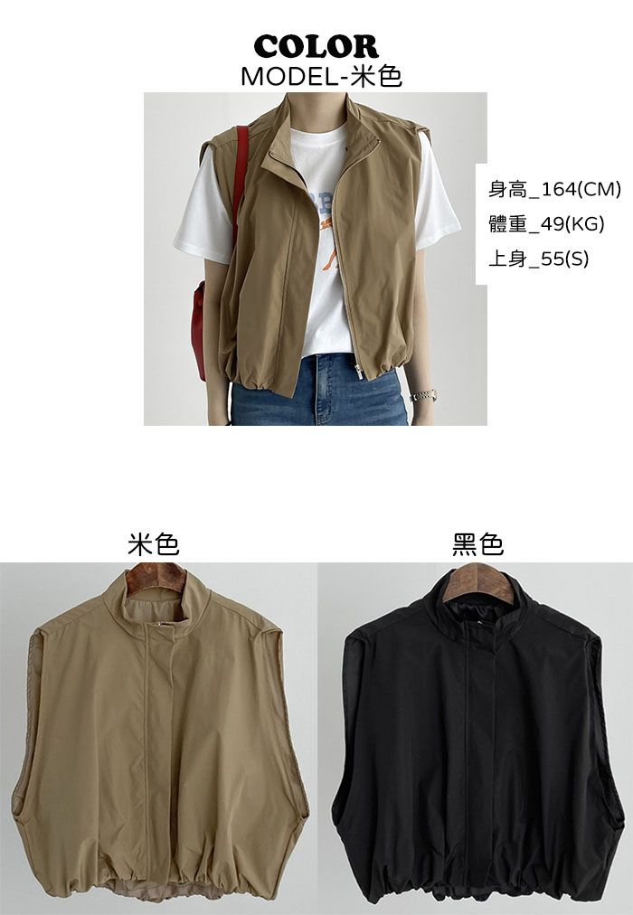 短版視覺顯腿長/下襬蓬鬆可愛有活力/寬肩遮住肉肉手臂-休閒居家簡約百搭花苞短版背心-小立領束口壓褶隱藏拉鍊素面無袖外套背心米色黑色