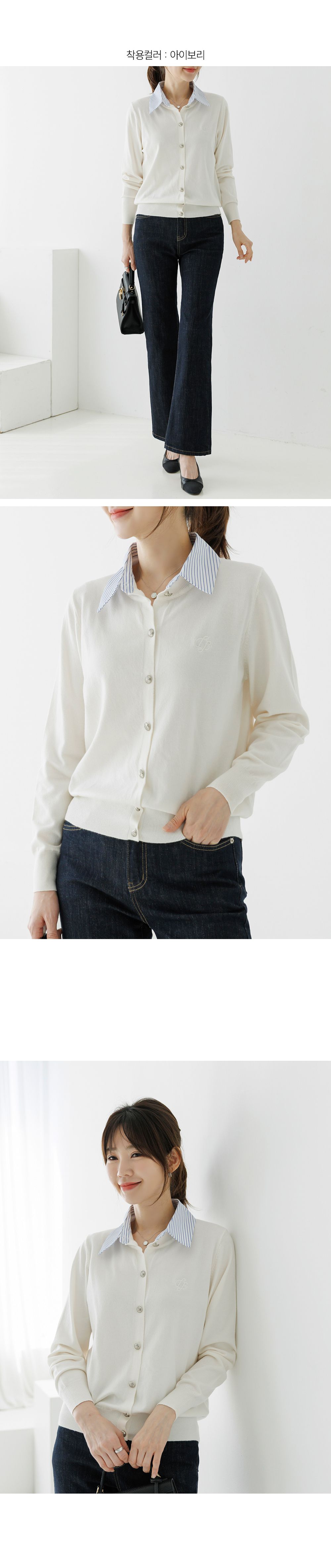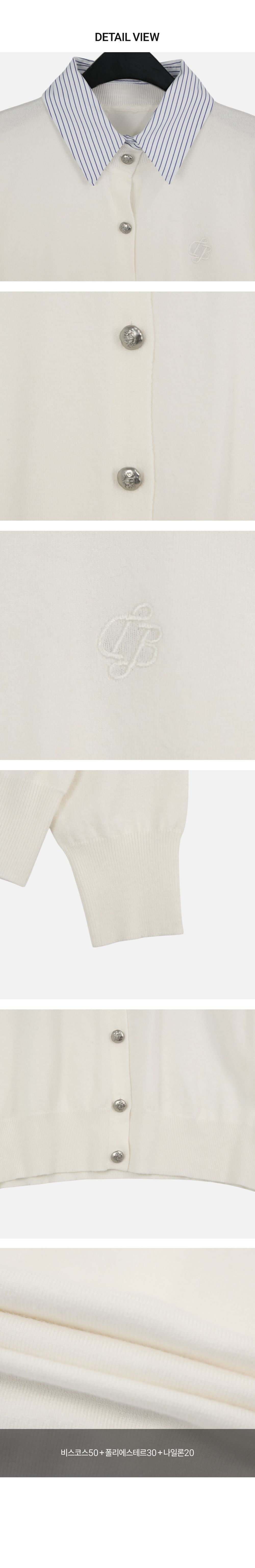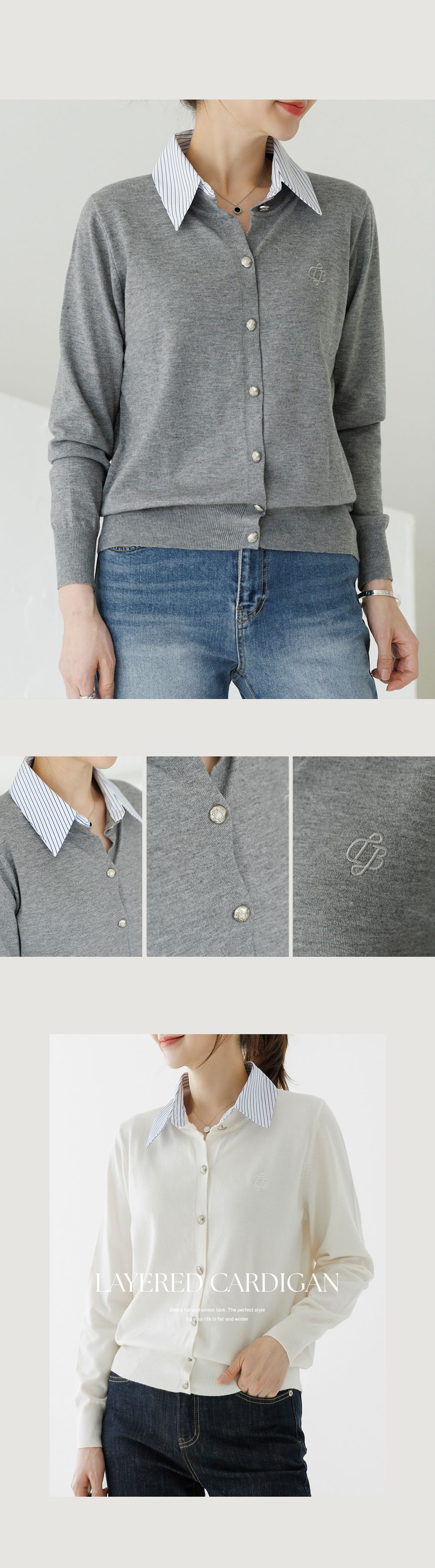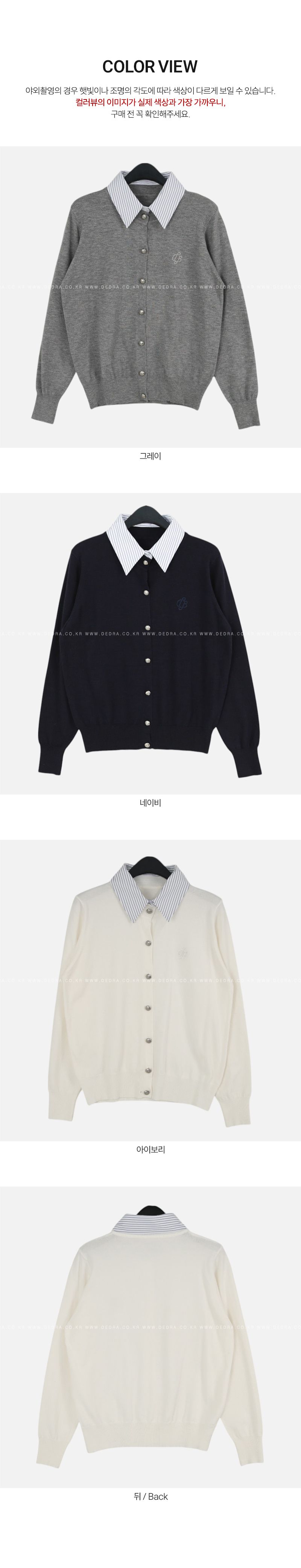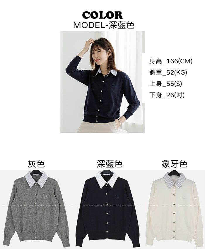 條紋襯衫領/假兩件拼接/開襟排釦/雕花鈕釦/中短版/刺繡字母 - 休閒居家OL上班族襯衫領針織衫針織上衣長袖上衣灰色深藍色象牙色白色