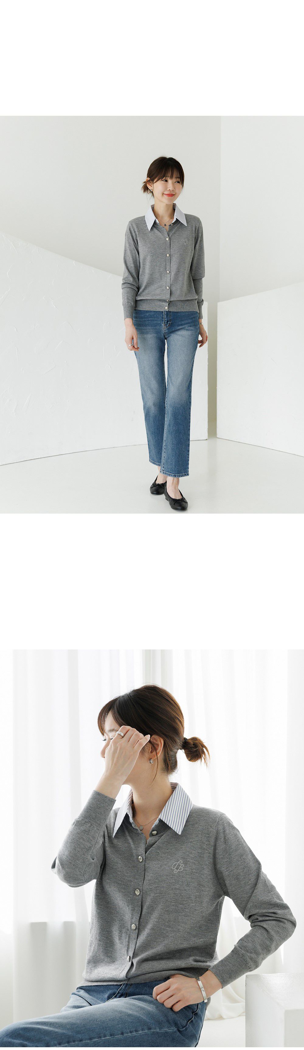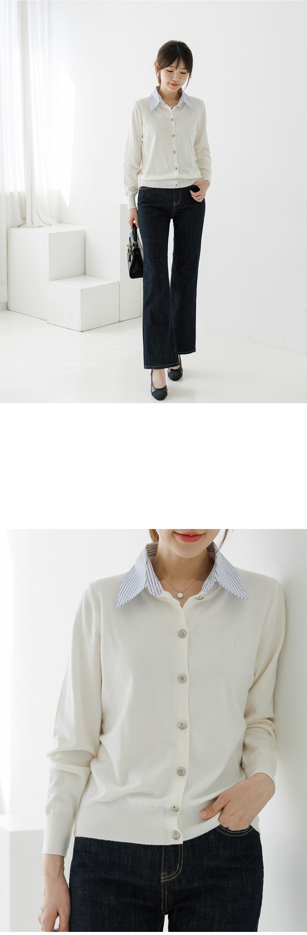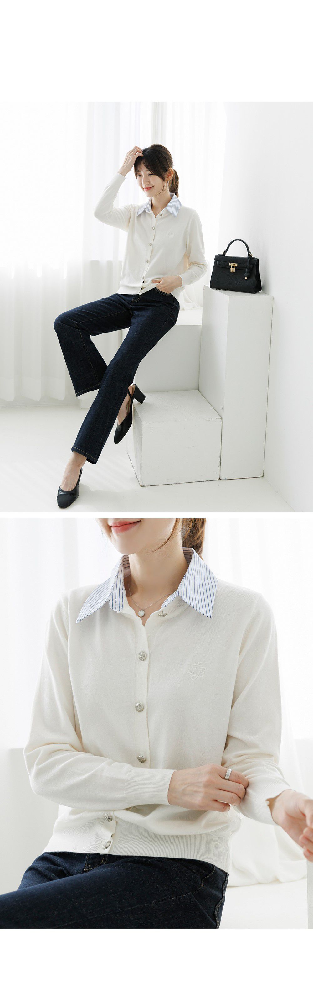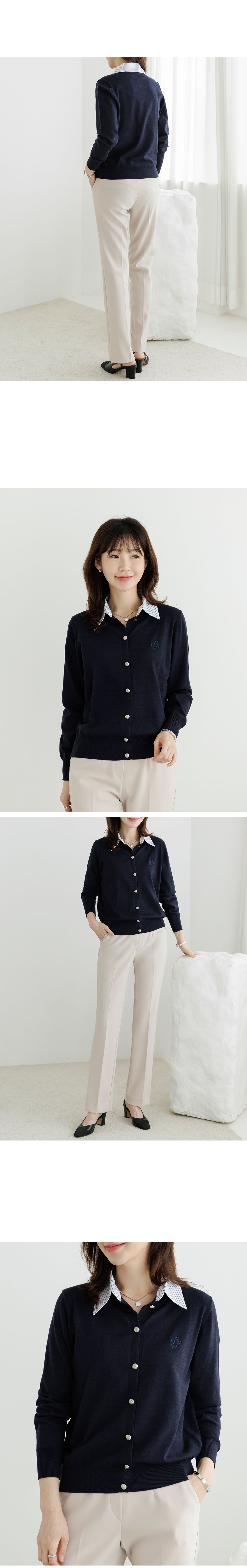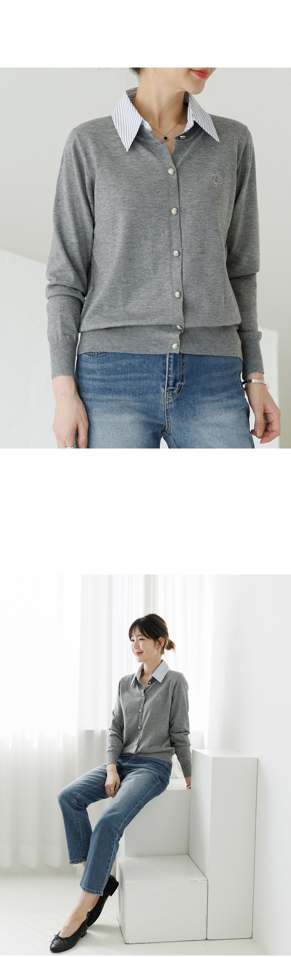 條紋襯衫領/假兩件拼接/開襟排釦/雕花鈕釦/中短版/刺繡字母 - 休閒居家OL上班族襯衫領針織衫針織上衣長袖上衣灰色深藍色象牙色白色