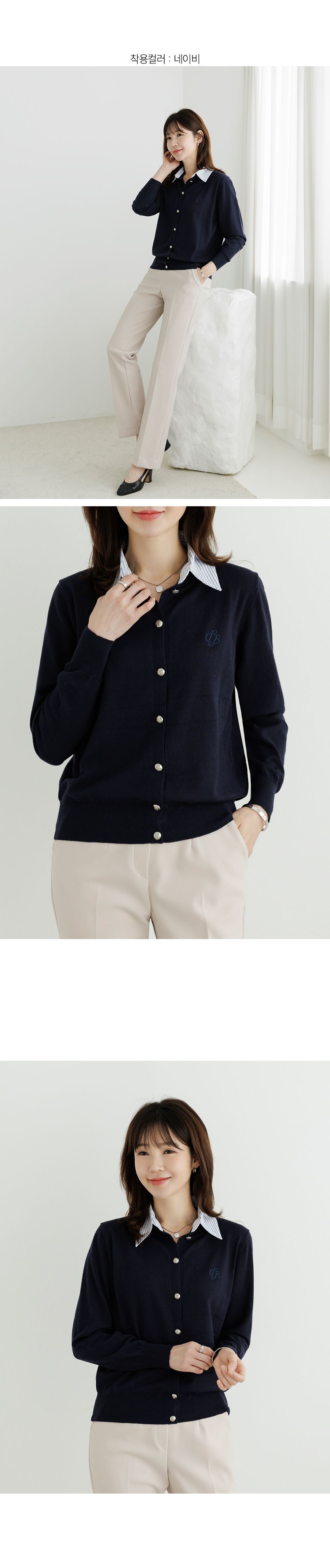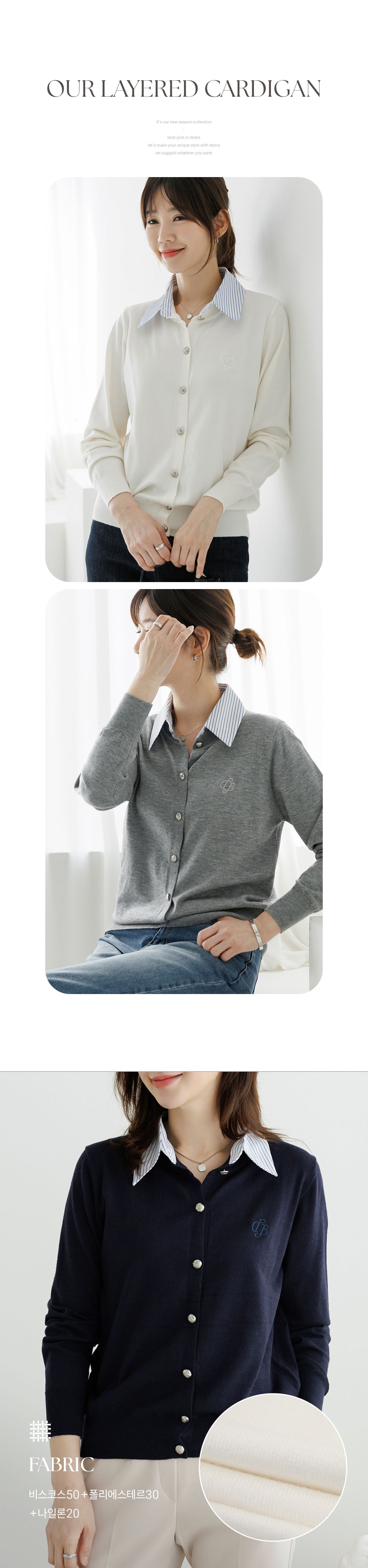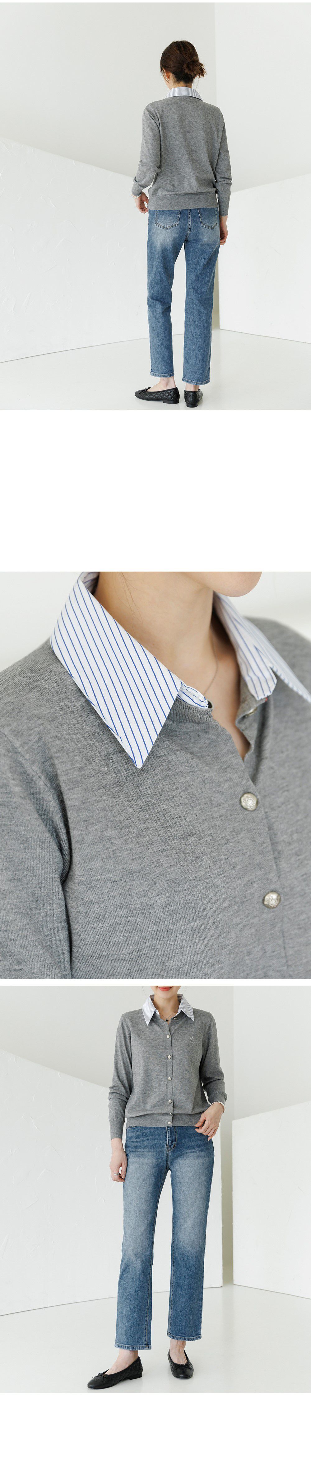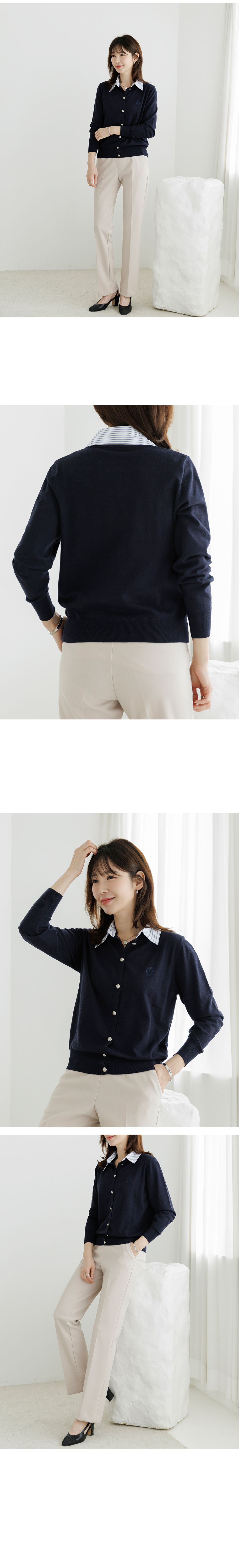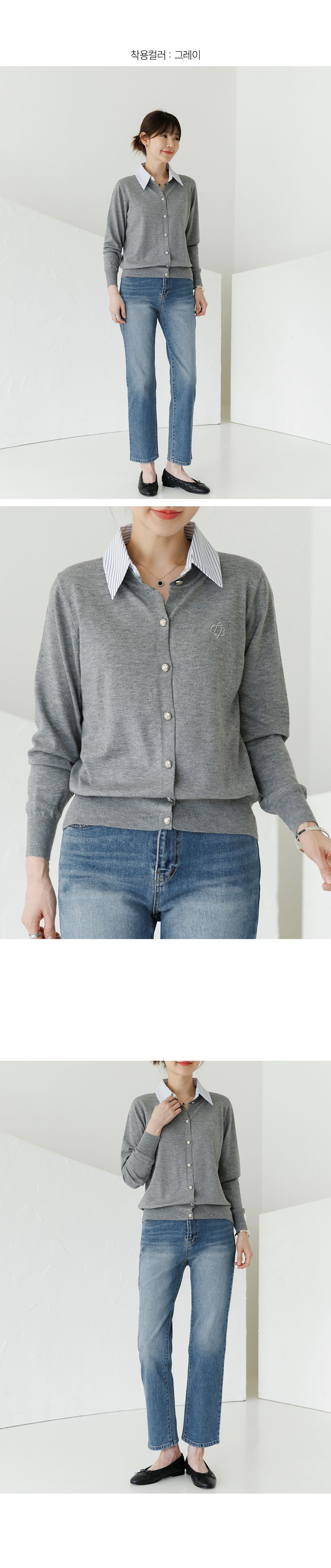 條紋襯衫領/假兩件拼接/開襟排釦/雕花鈕釦/中短版/刺繡字母 - 休閒居家OL上班族襯衫領針織衫針織上衣長袖上衣灰色深藍色象牙色白色