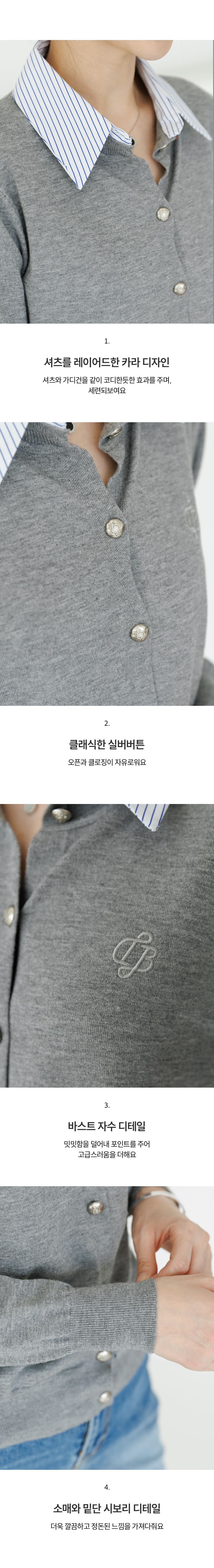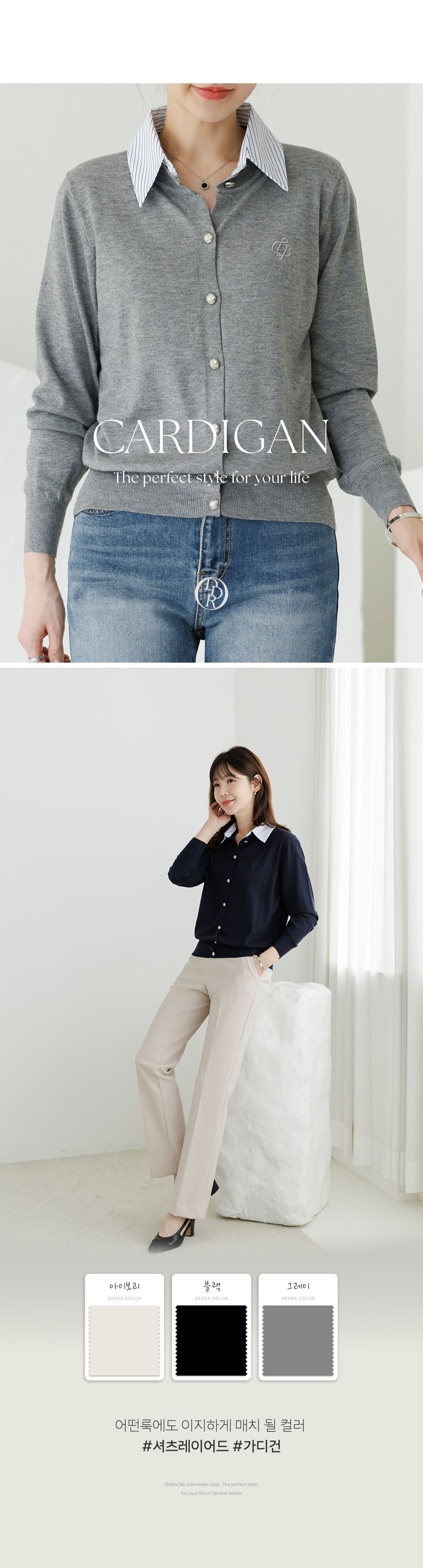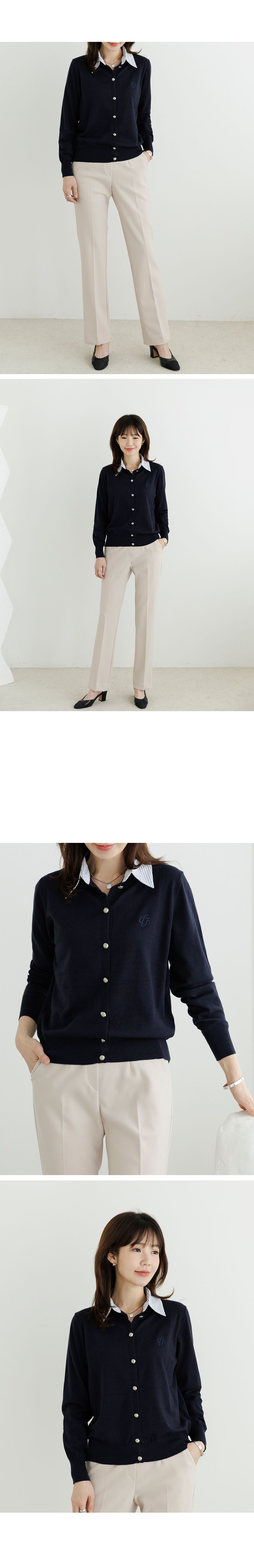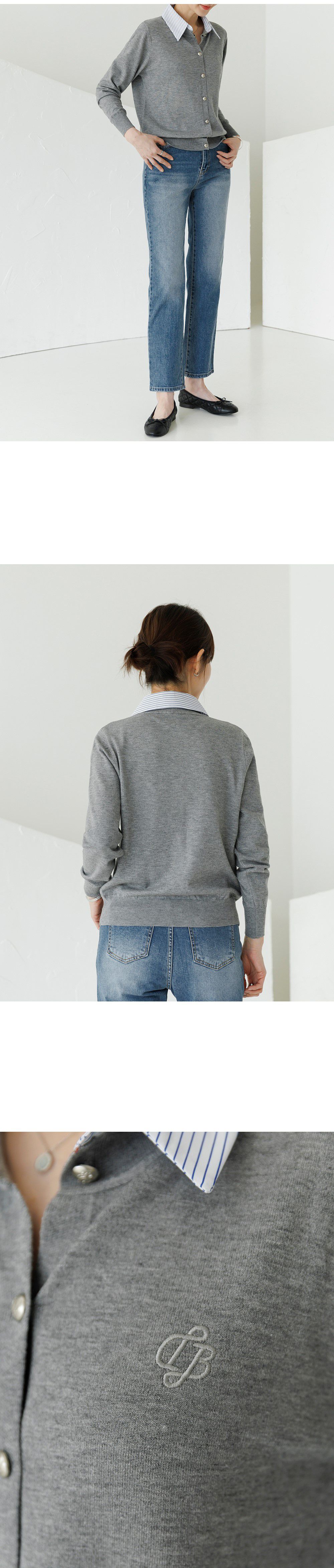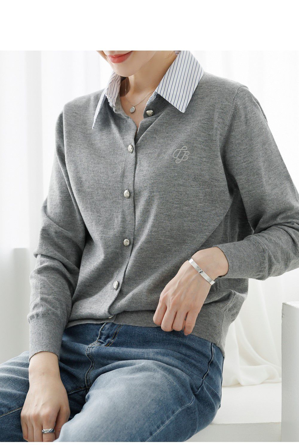 條紋襯衫領/假兩件拼接/開襟排釦/雕花鈕釦/中短版/刺繡字母 - 休閒居家OL上班族襯衫領針織衫針織上衣長袖上衣灰色深藍色象牙色白色