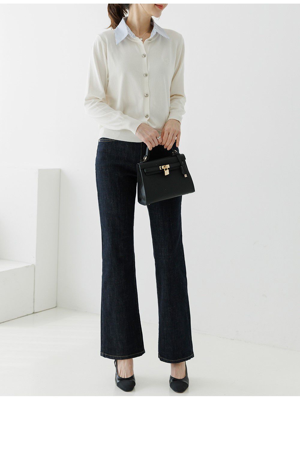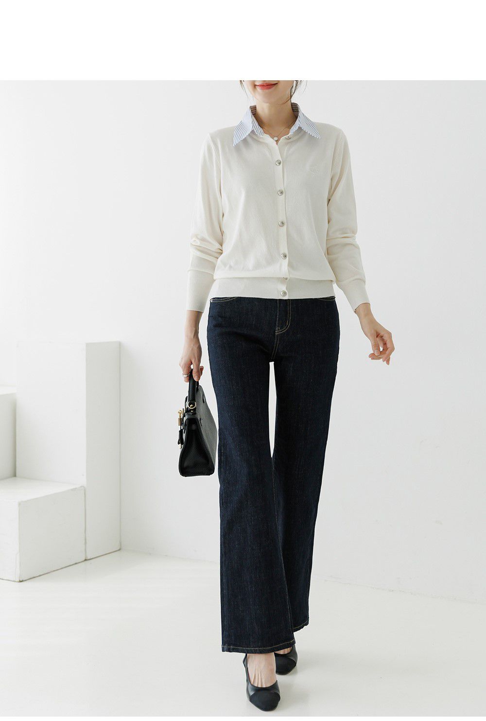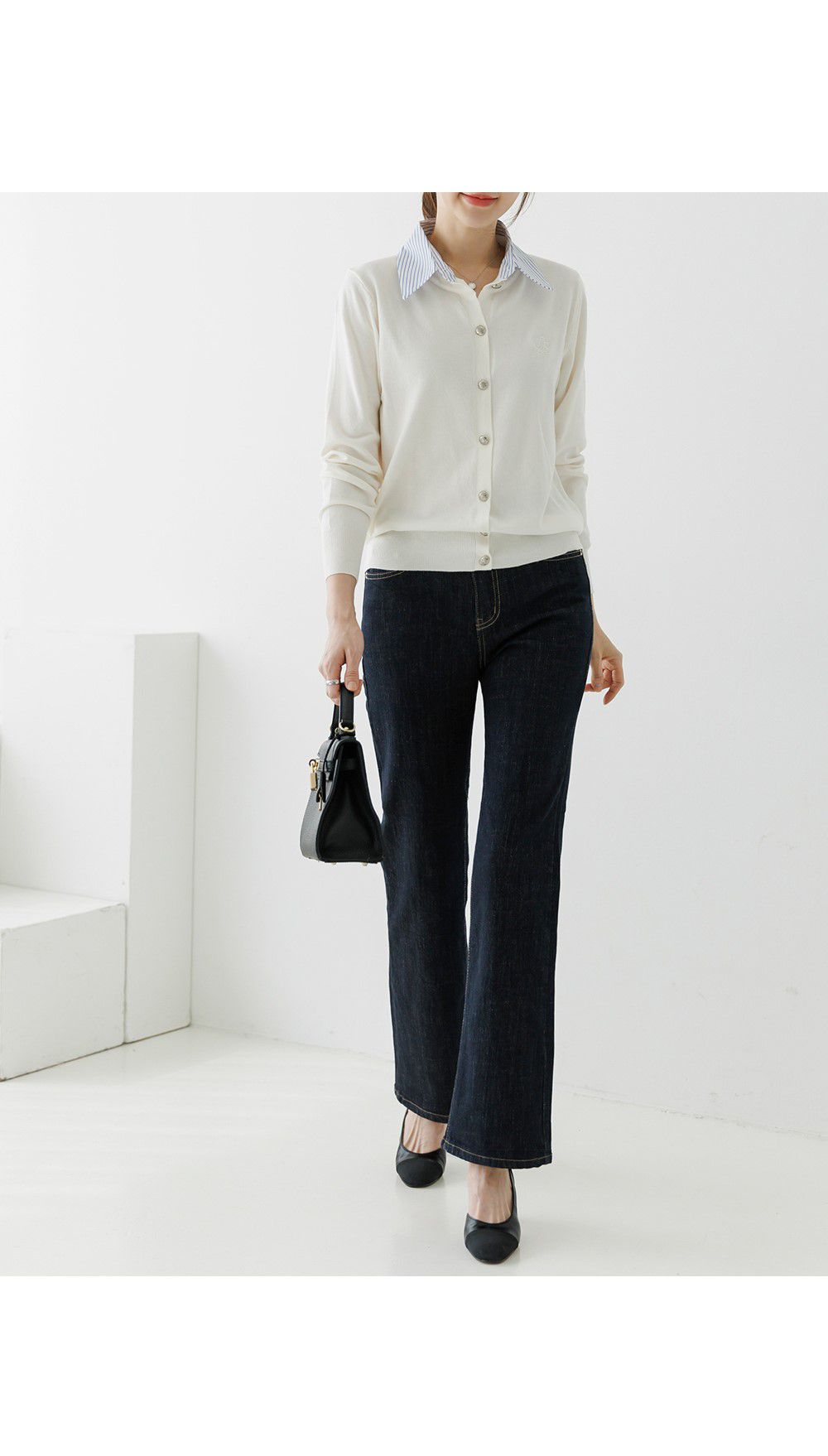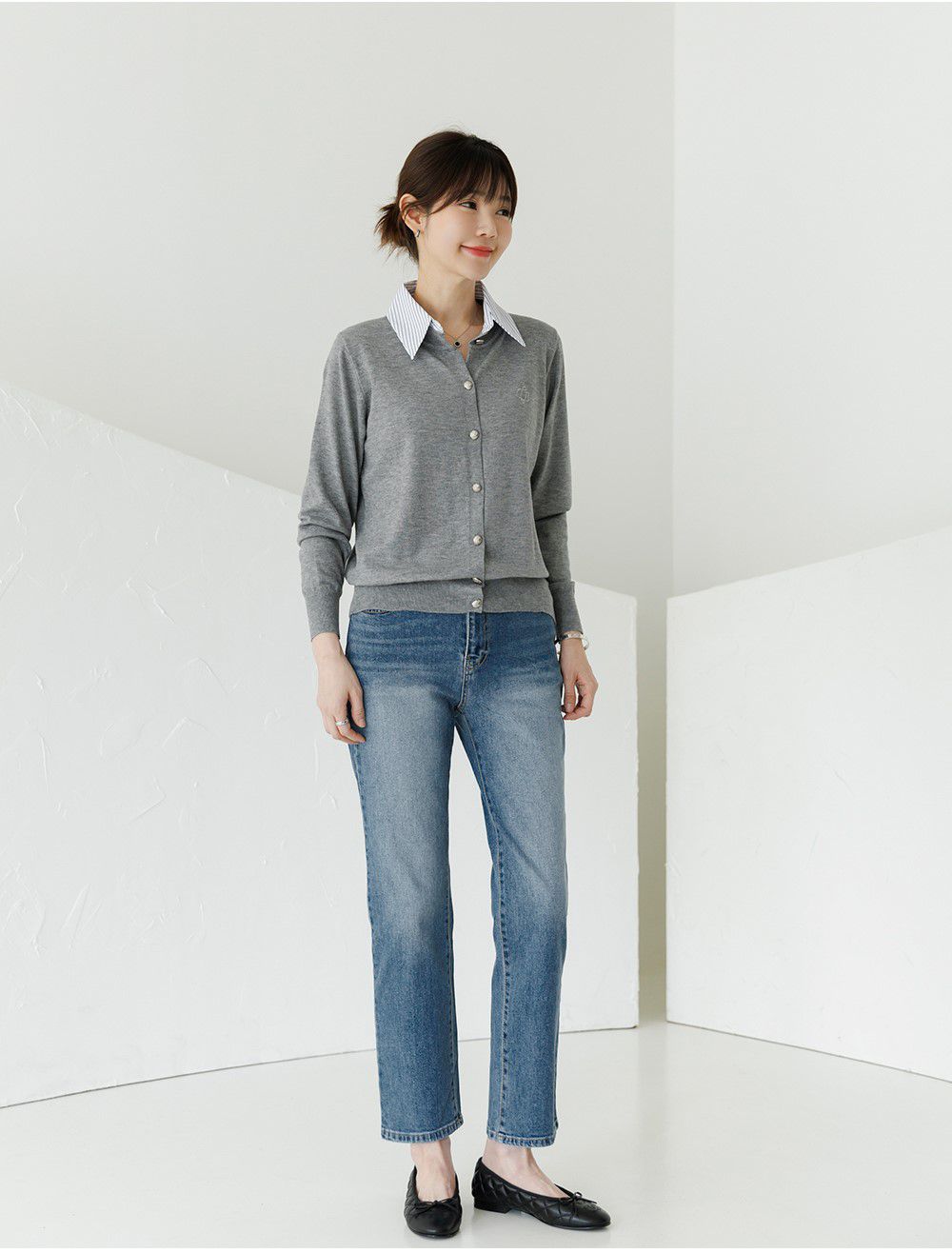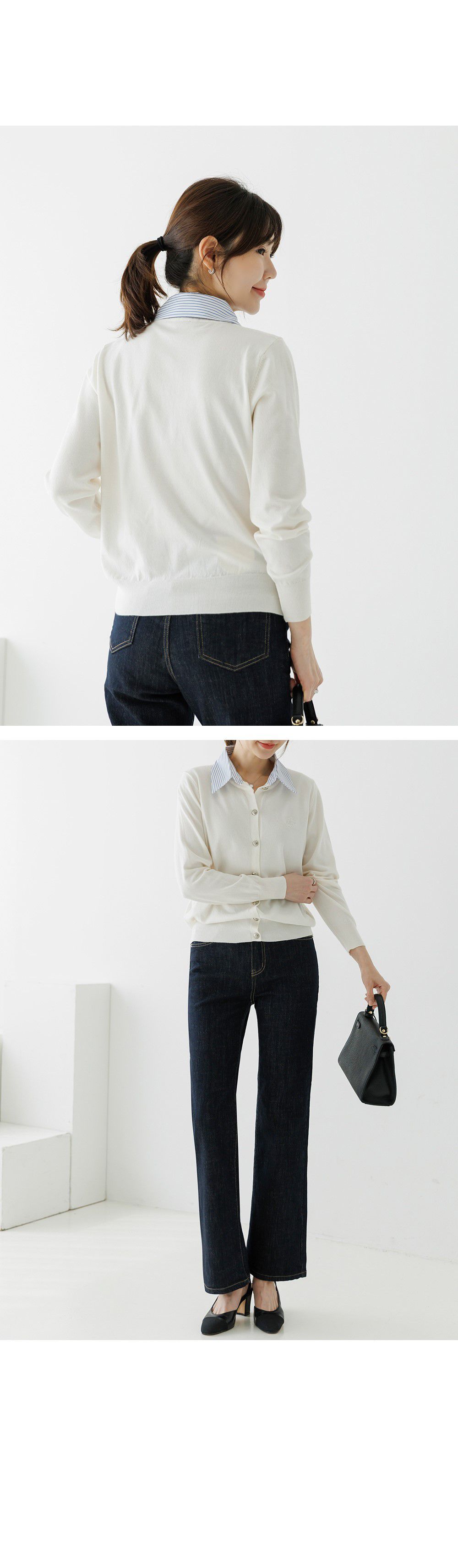條紋襯衫領/假兩件拼接/開襟排釦/雕花鈕釦/中短版/刺繡字母 - 休閒居家OL上班族襯衫領針織衫針織上衣長袖上衣灰色深藍色象牙色白色