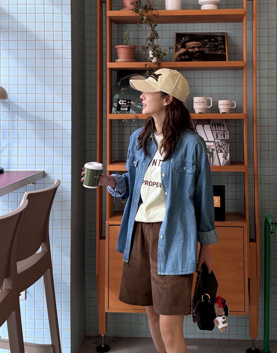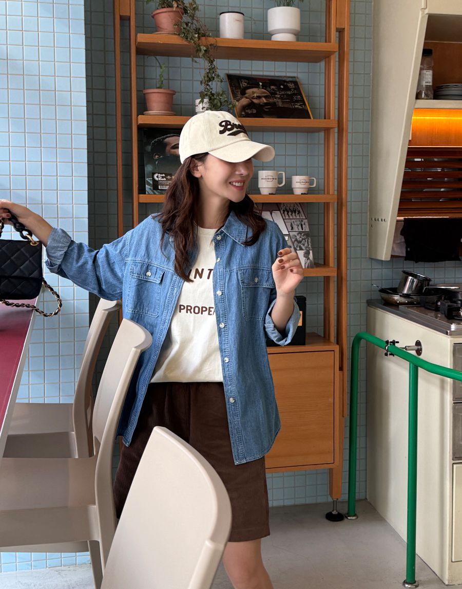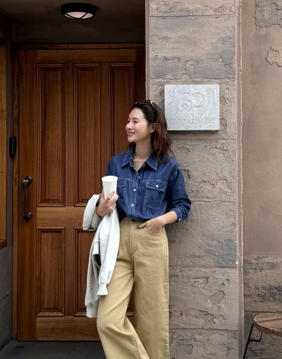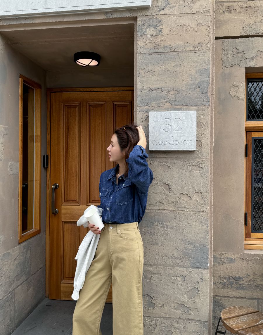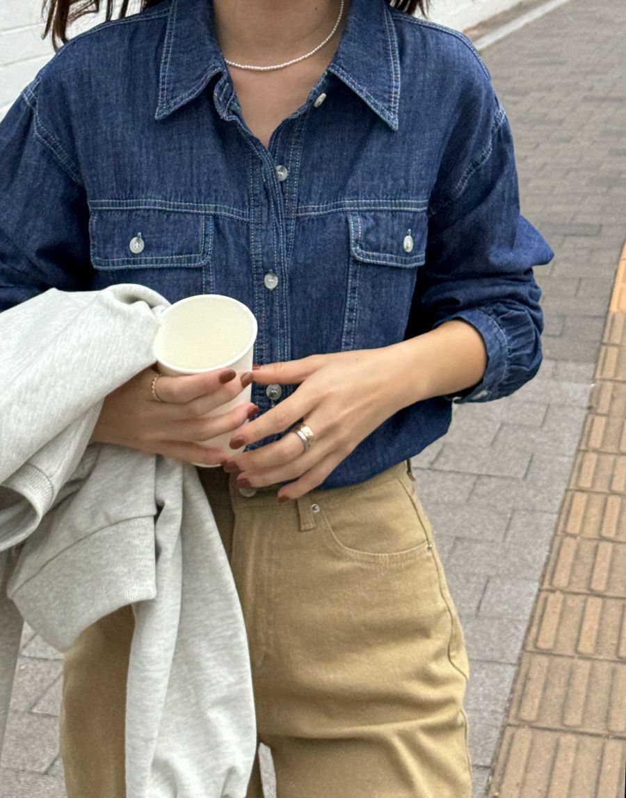 【C55442】韓國MBL 雙口袋牛仔襯衫-素面跳色車線長袖上衣外套