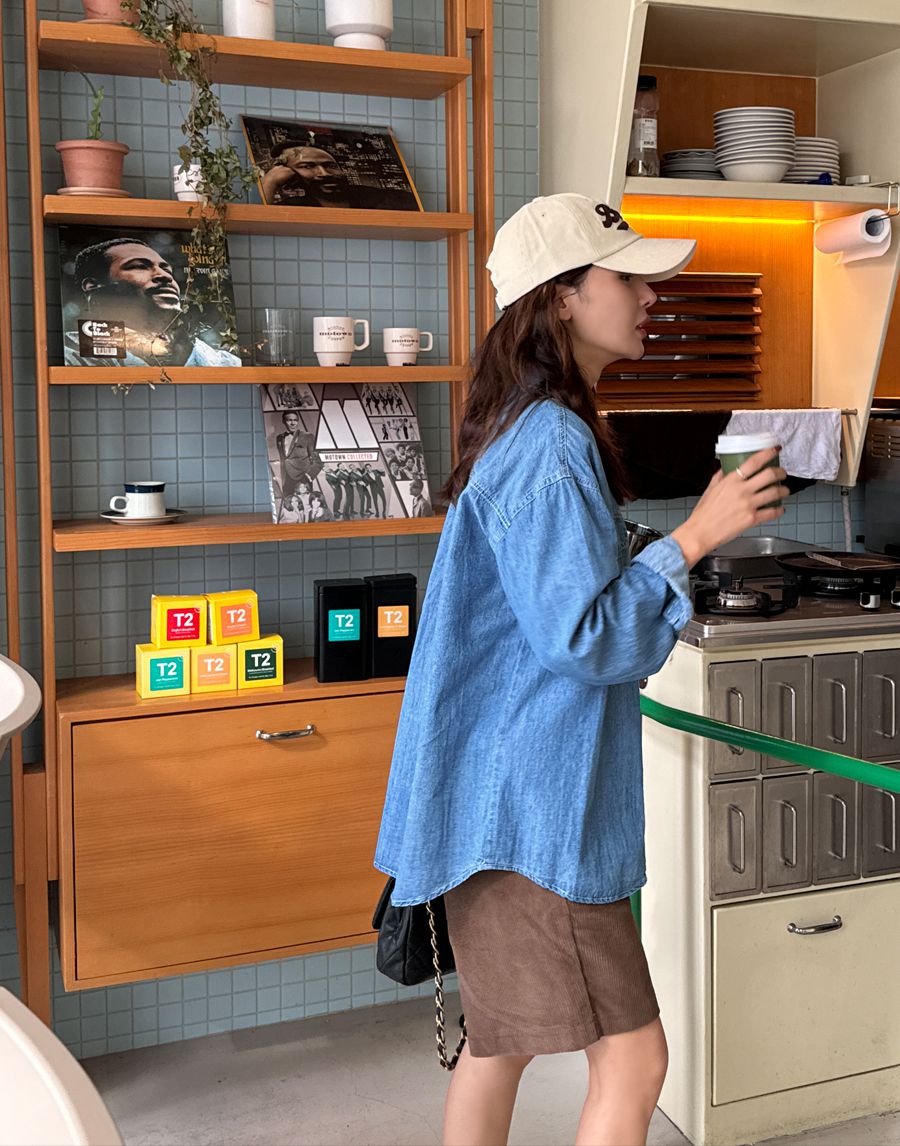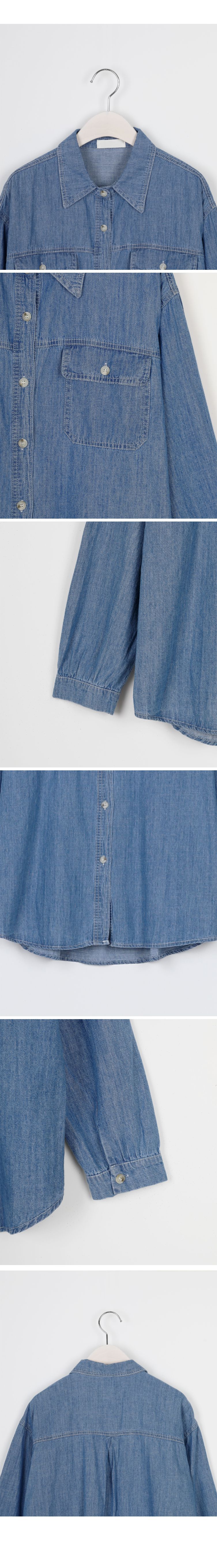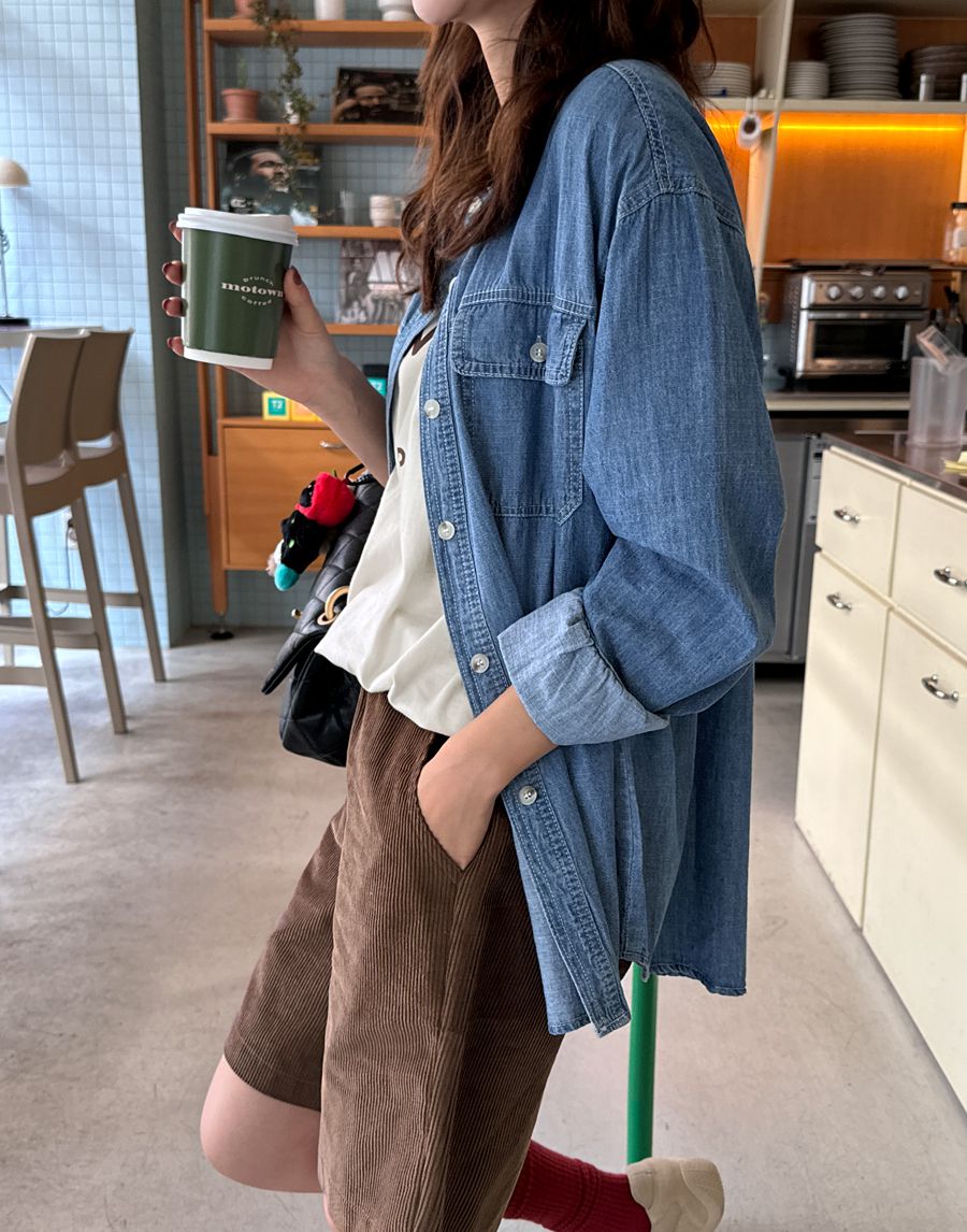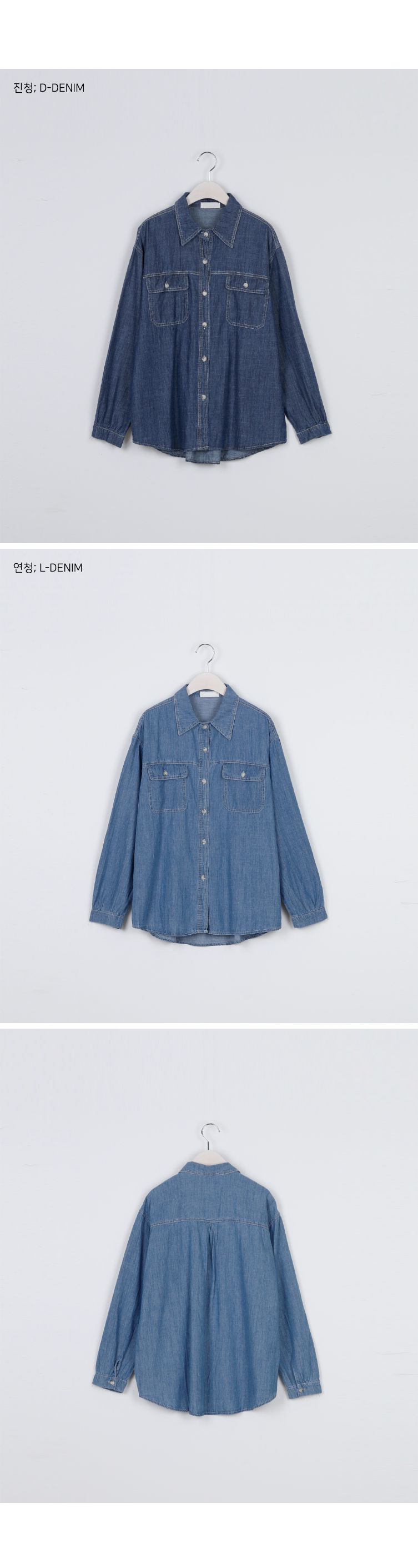 跳色車線/雙口袋/弧形下襬/後背打褶/長版 - 休閒居家簡約百搭素面雙口袋牛仔襯衫上衣牛仔外套長袖上衣外套深青色淺青色