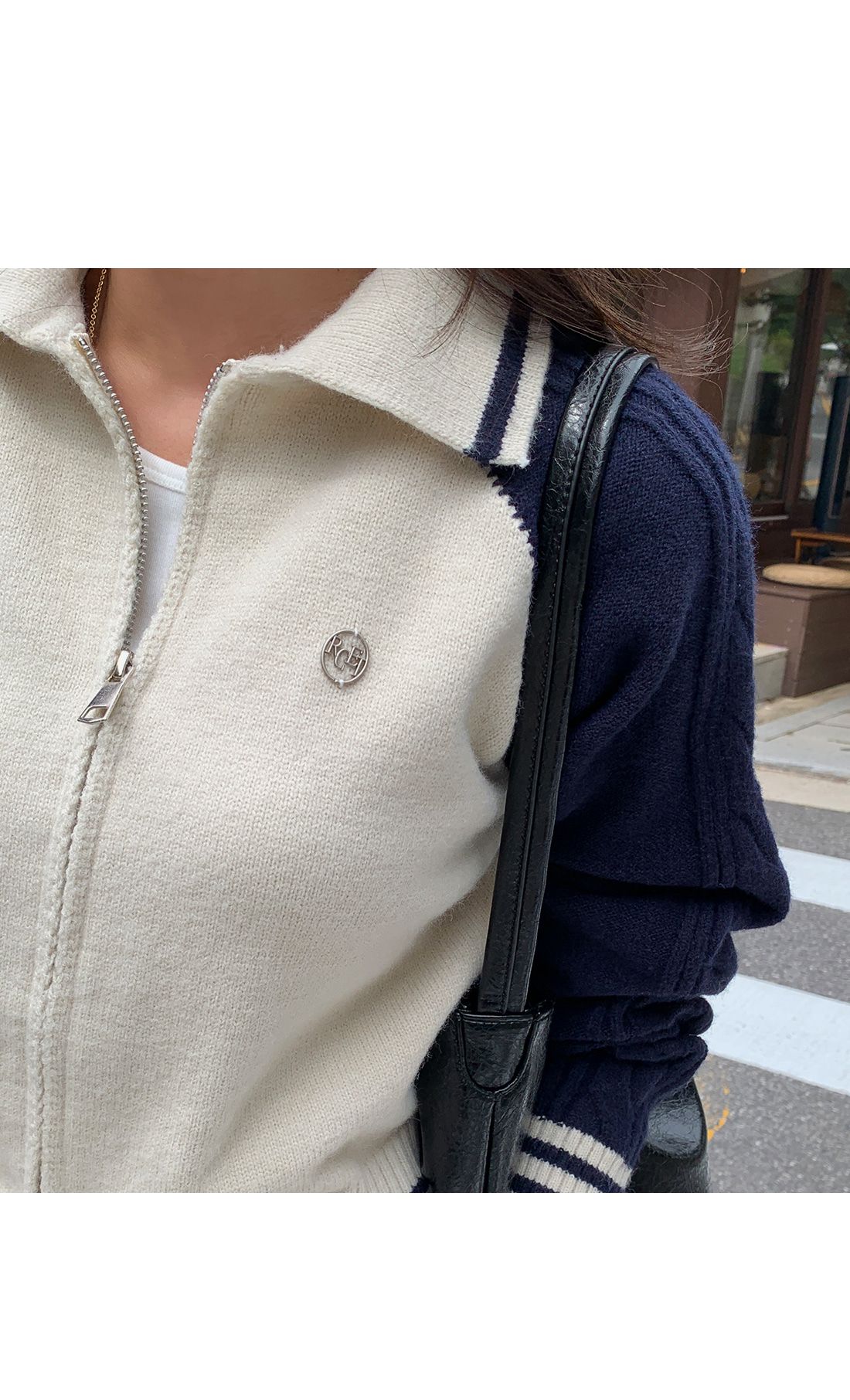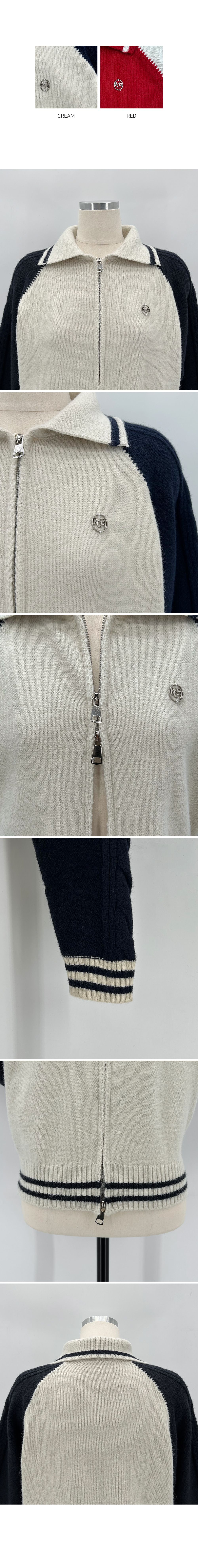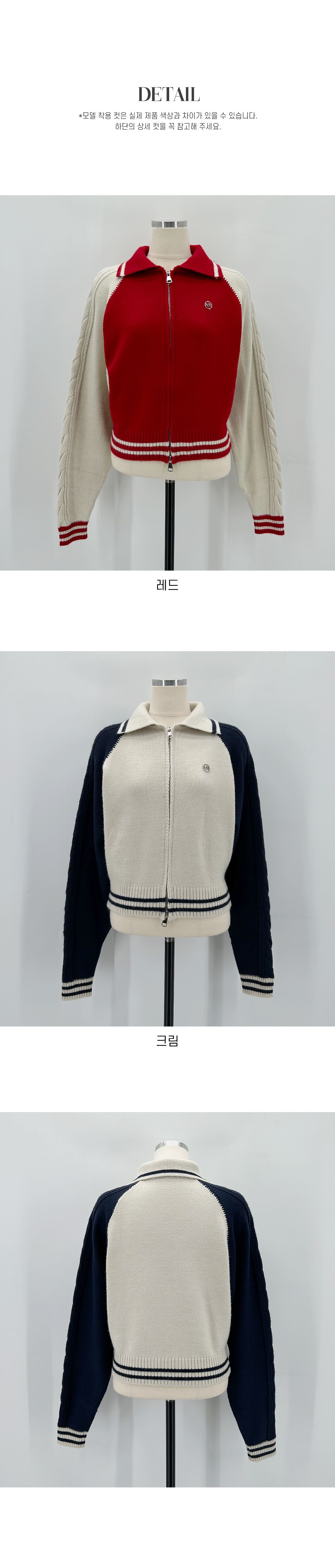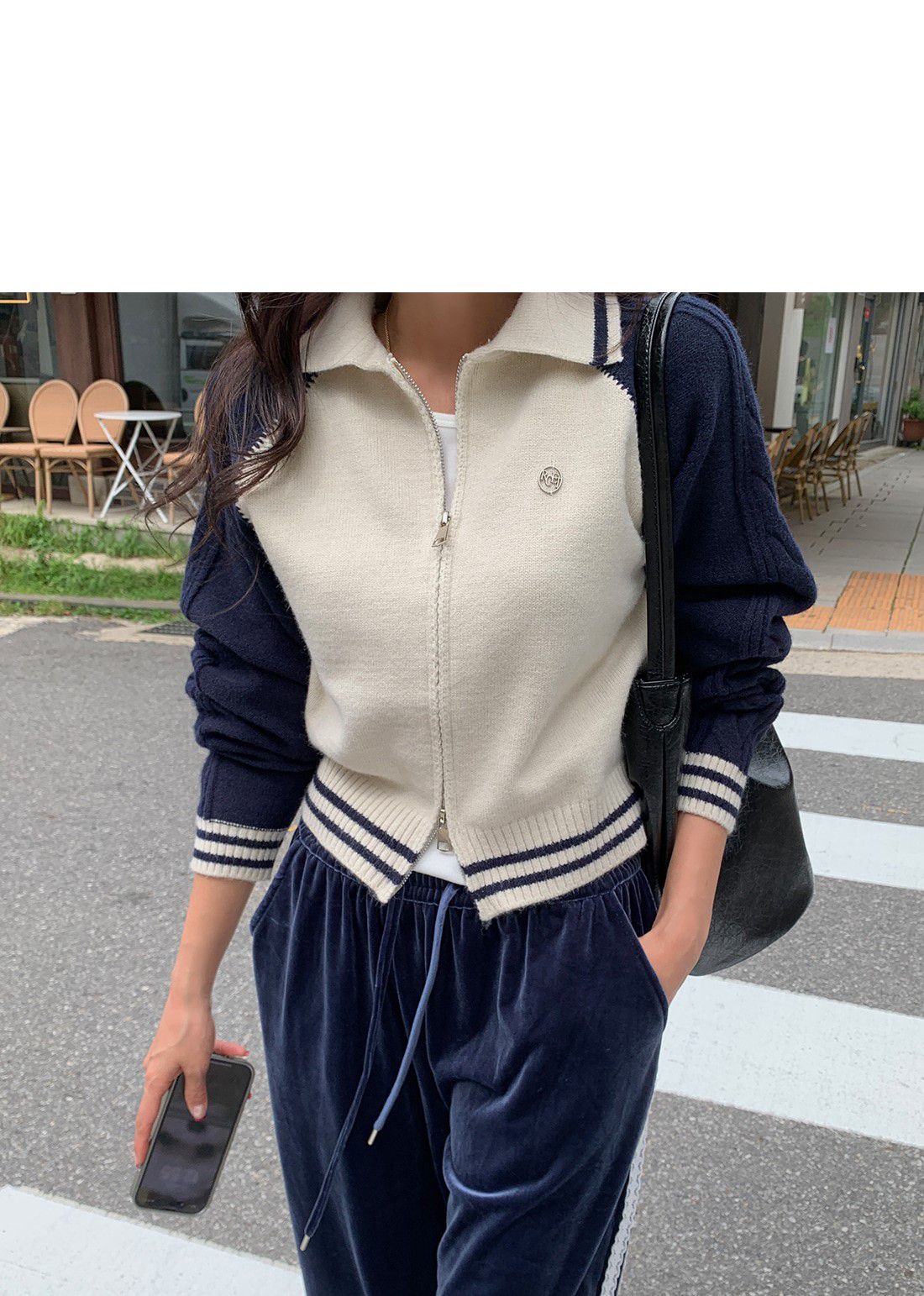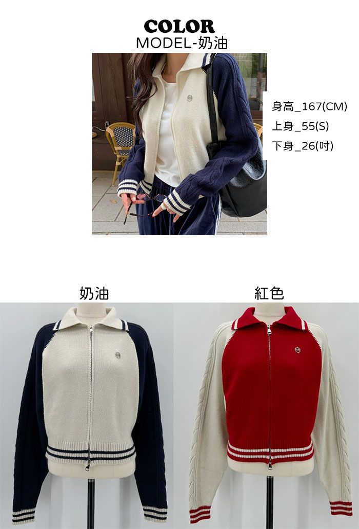 雙色拼接/連肩袖/雙開拉鍊/LOGO標/翻領/短版外套 - 休閒居家撞色針織外套長袖外套奶油色紅色條紋滾邊