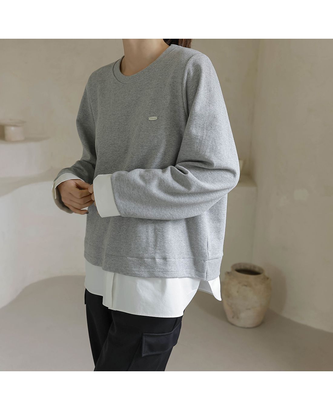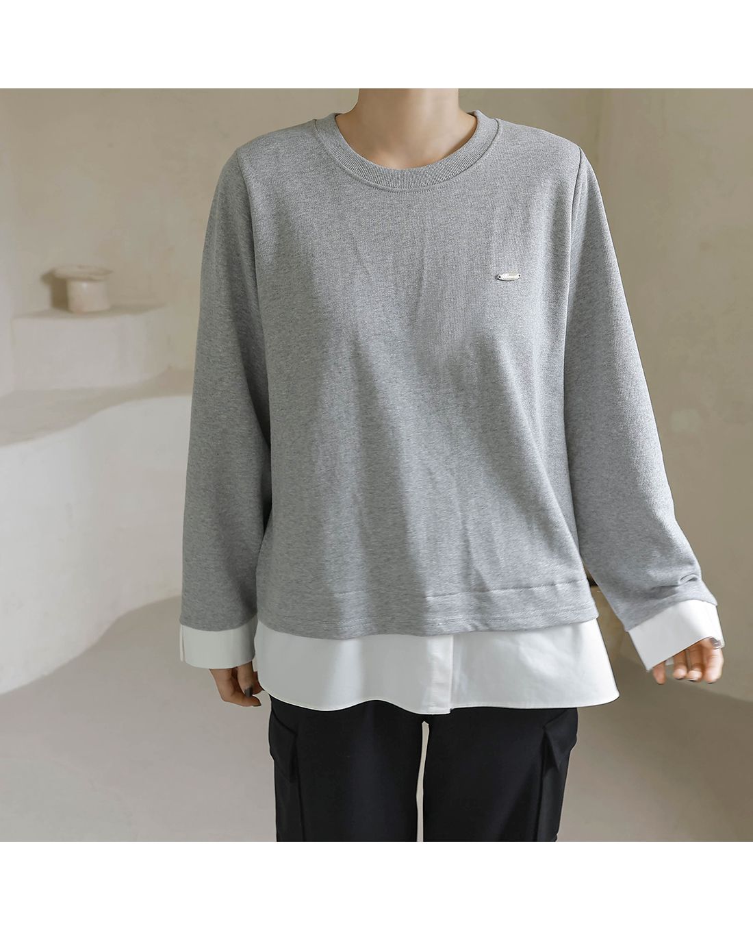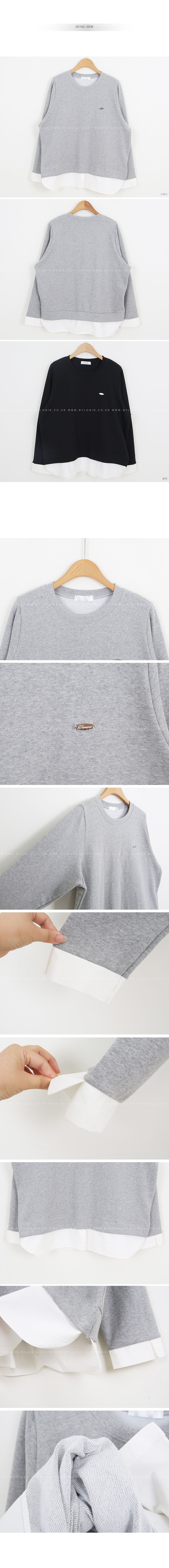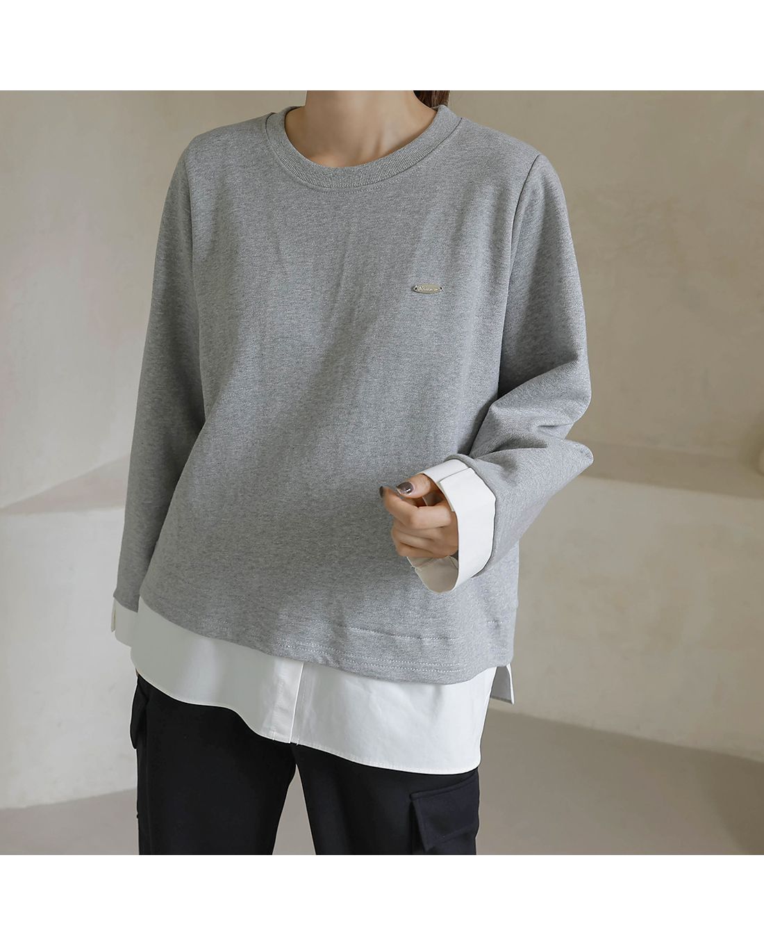 兩種尺寸/假兩件拼接/金屬LOGO標/圓領/襯衫拼接/內裏微毛絨棉 - 休閒居家簡約百搭素面長版拼接上衣寬鬆大尺碼上衣長版上衣長袖上衣T恤多尺寸12灰色黑色