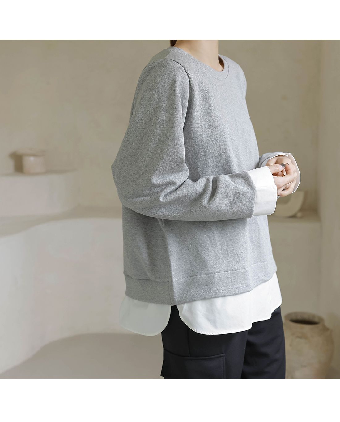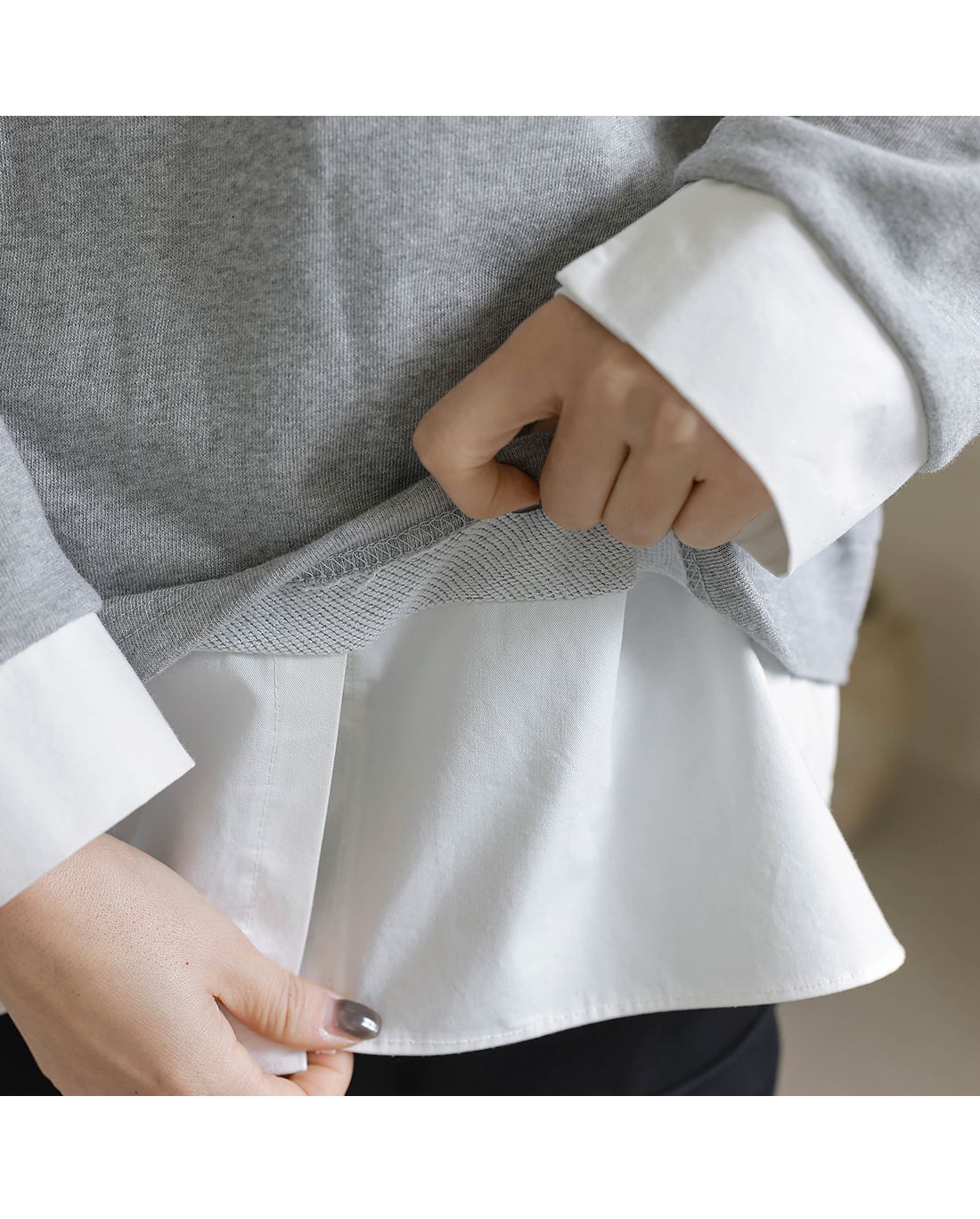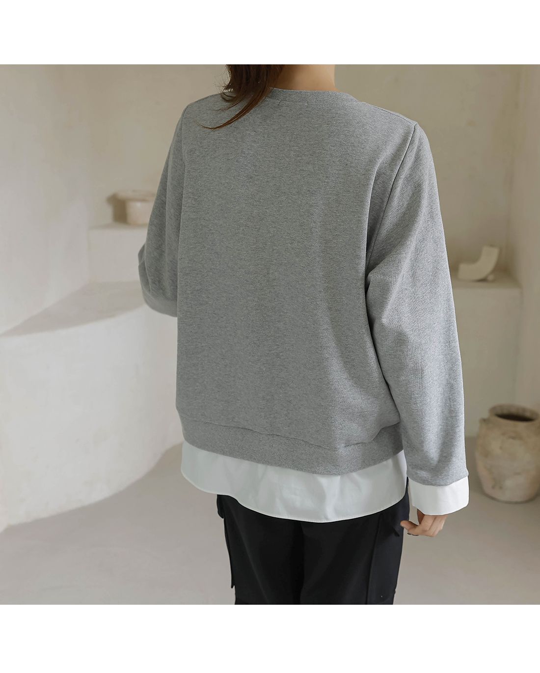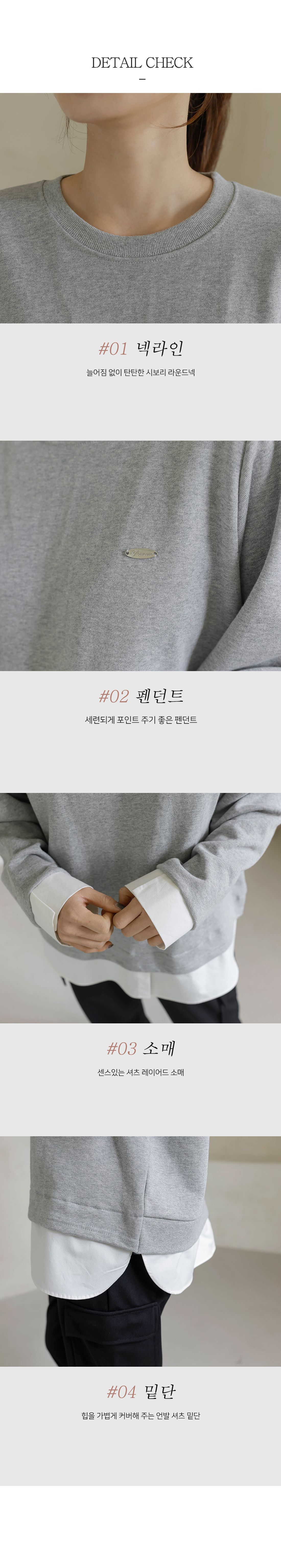 兩種尺寸/假兩件拼接/金屬LOGO標/圓領/襯衫拼接/內裏微毛絨棉 - 休閒居家簡約百搭素面長版拼接上衣寬鬆大尺碼上衣長版上衣長袖上衣T恤多尺寸12灰色黑色