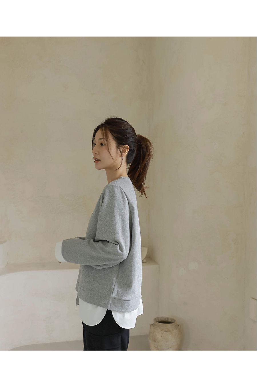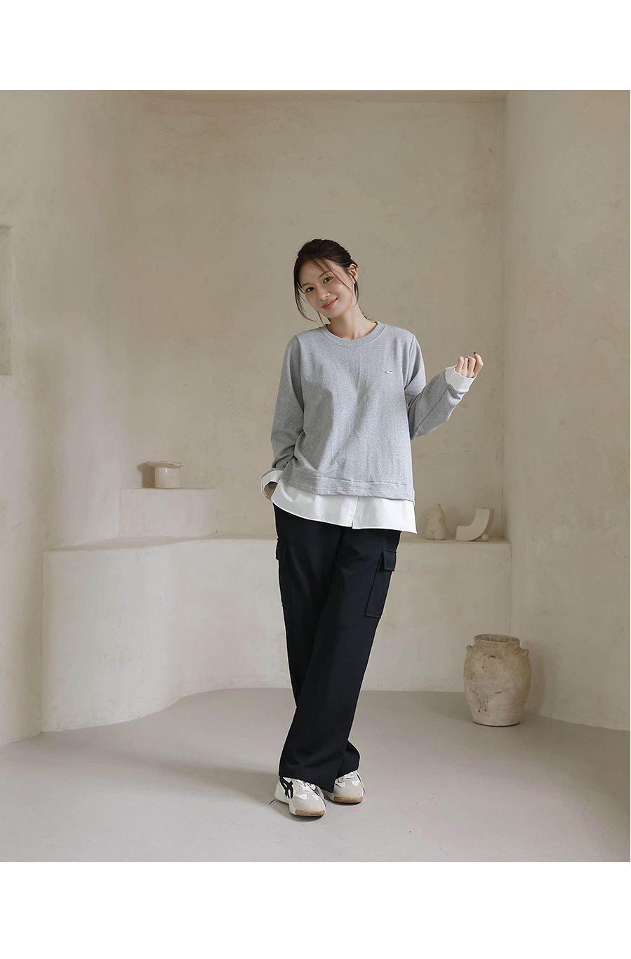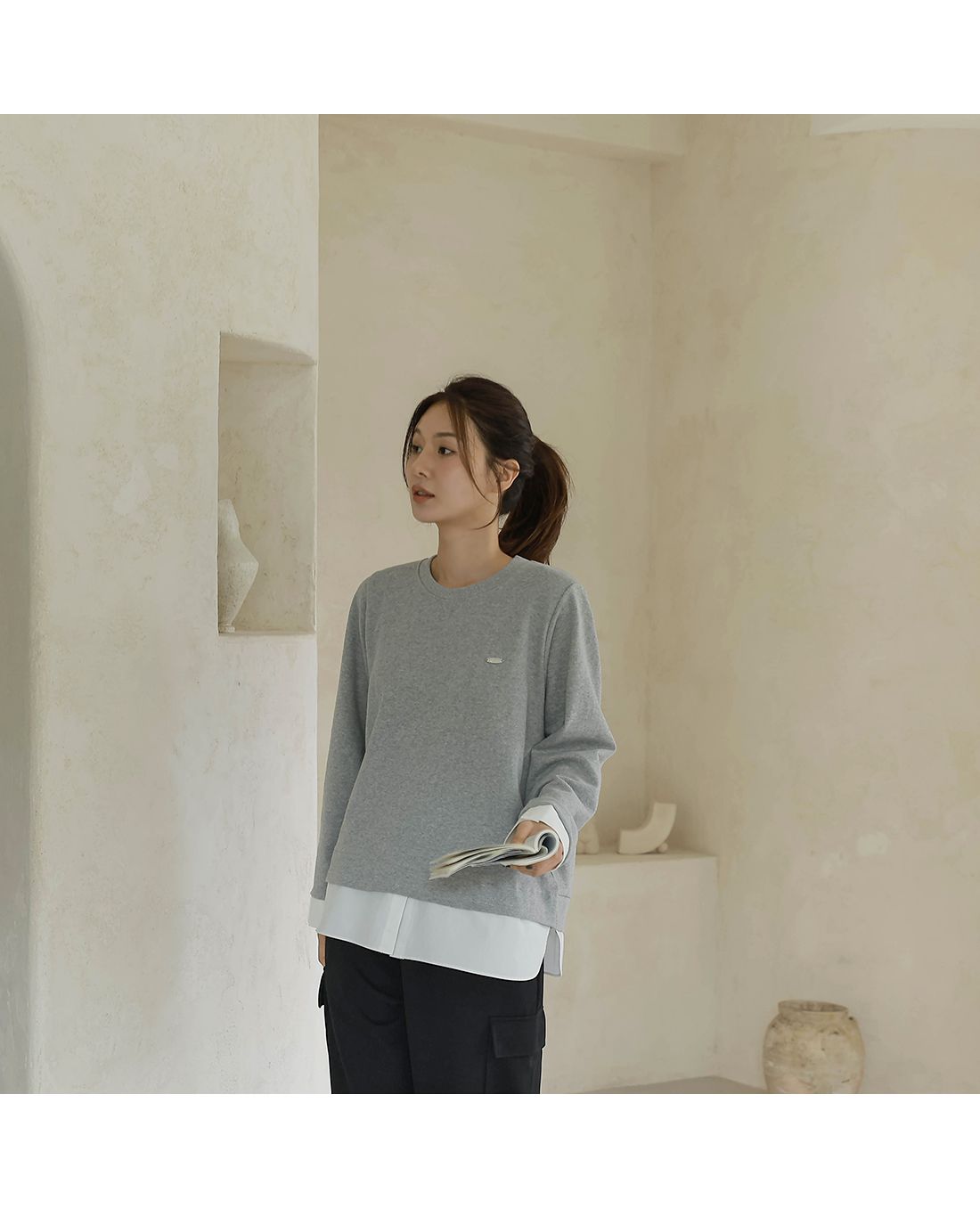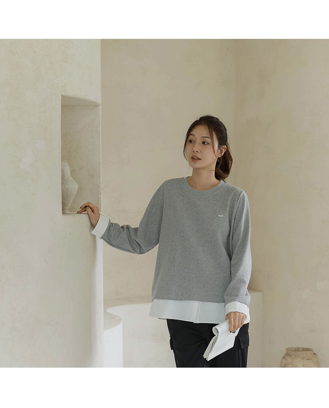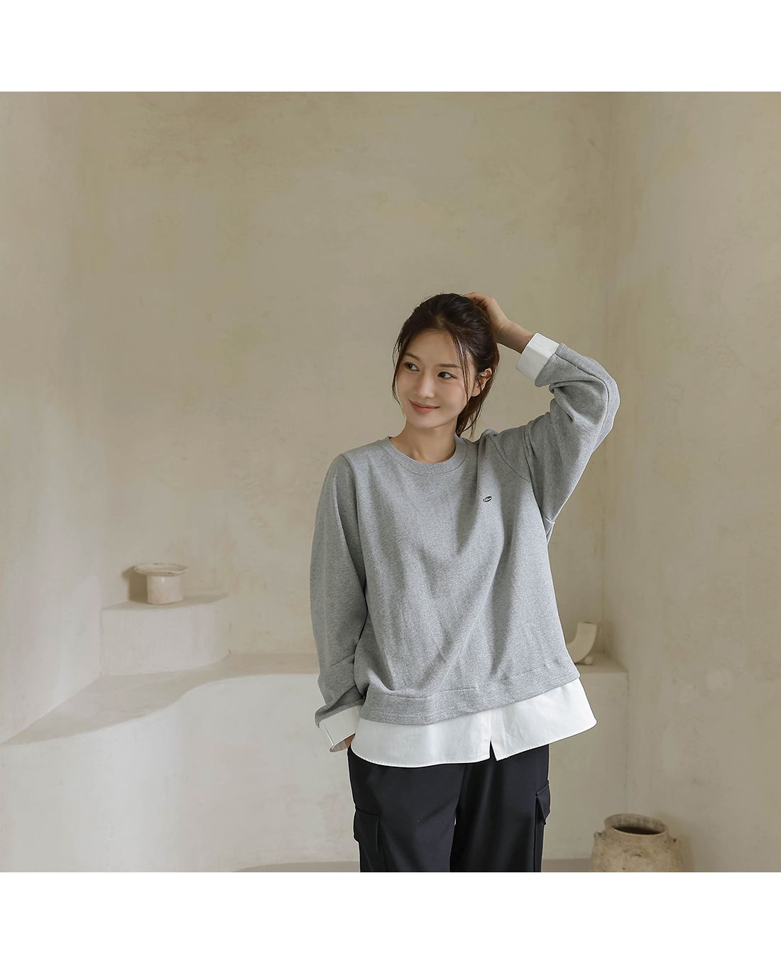 兩種尺寸/假兩件拼接/金屬LOGO標/圓領/襯衫拼接/內裏微毛絨棉 - 休閒居家簡約百搭素面長版拼接上衣寬鬆大尺碼上衣長版上衣長袖上衣T恤多尺寸12灰色黑色