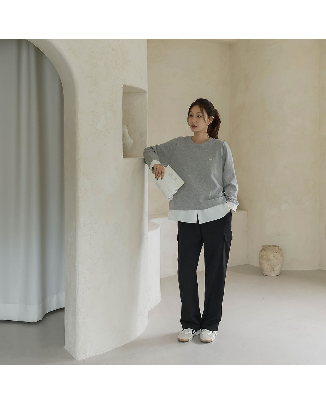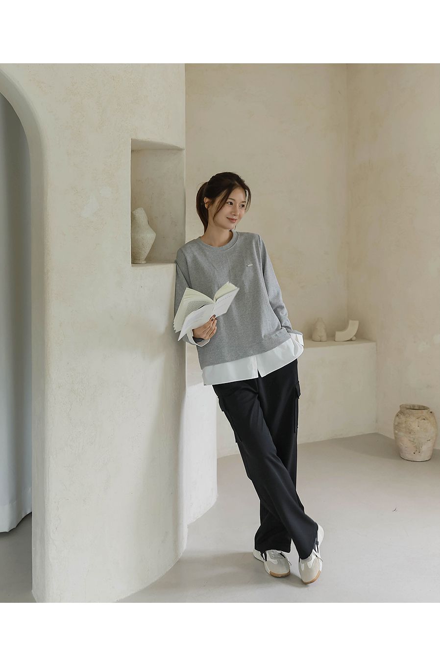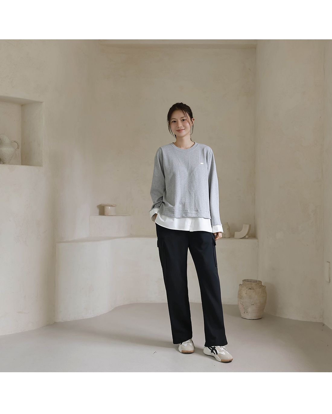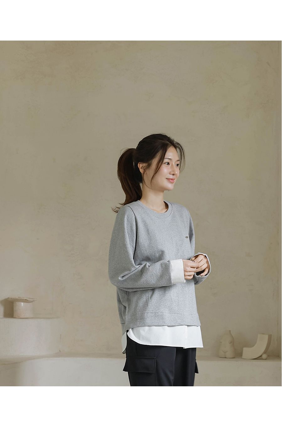 兩種尺寸/假兩件拼接/金屬LOGO標/圓領/襯衫拼接/內裏微毛絨棉 - 休閒居家簡約百搭素面長版拼接上衣寬鬆大尺碼上衣長版上衣長袖上衣T恤多尺寸12灰色黑色