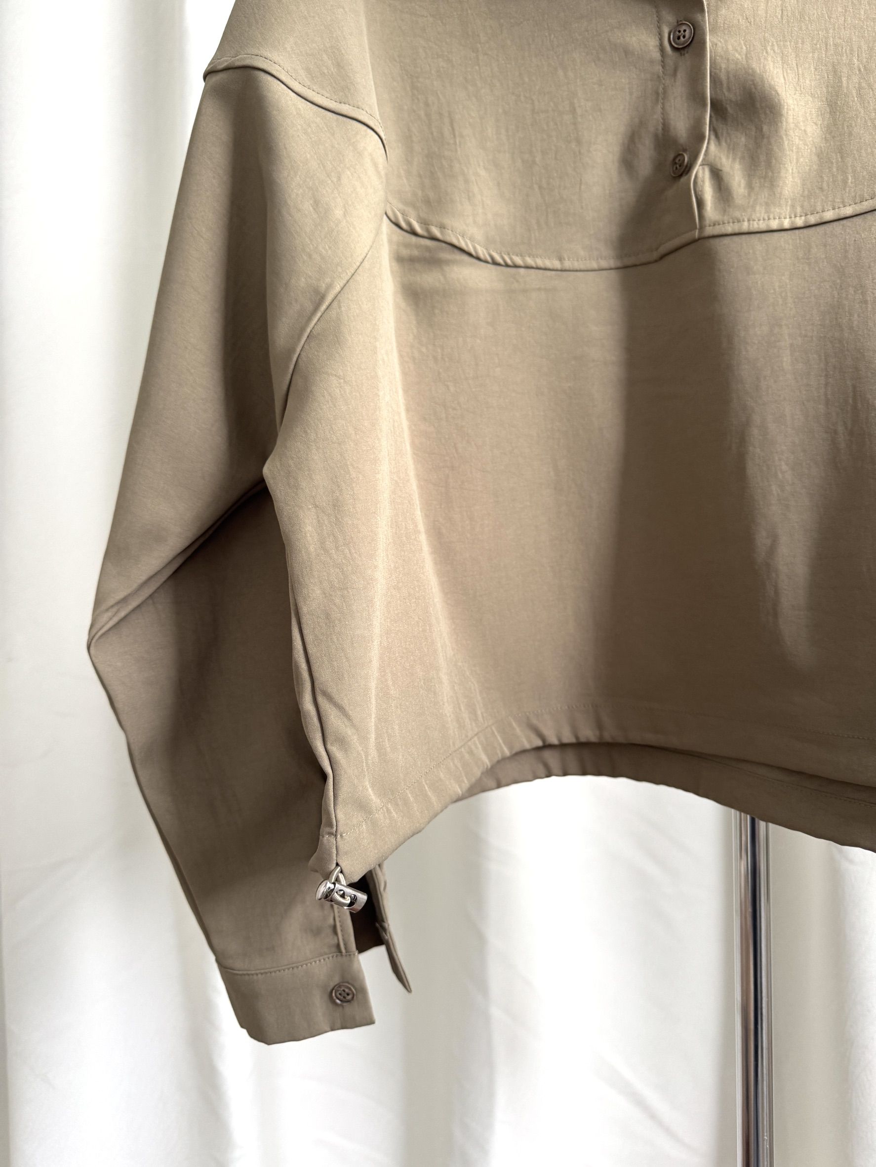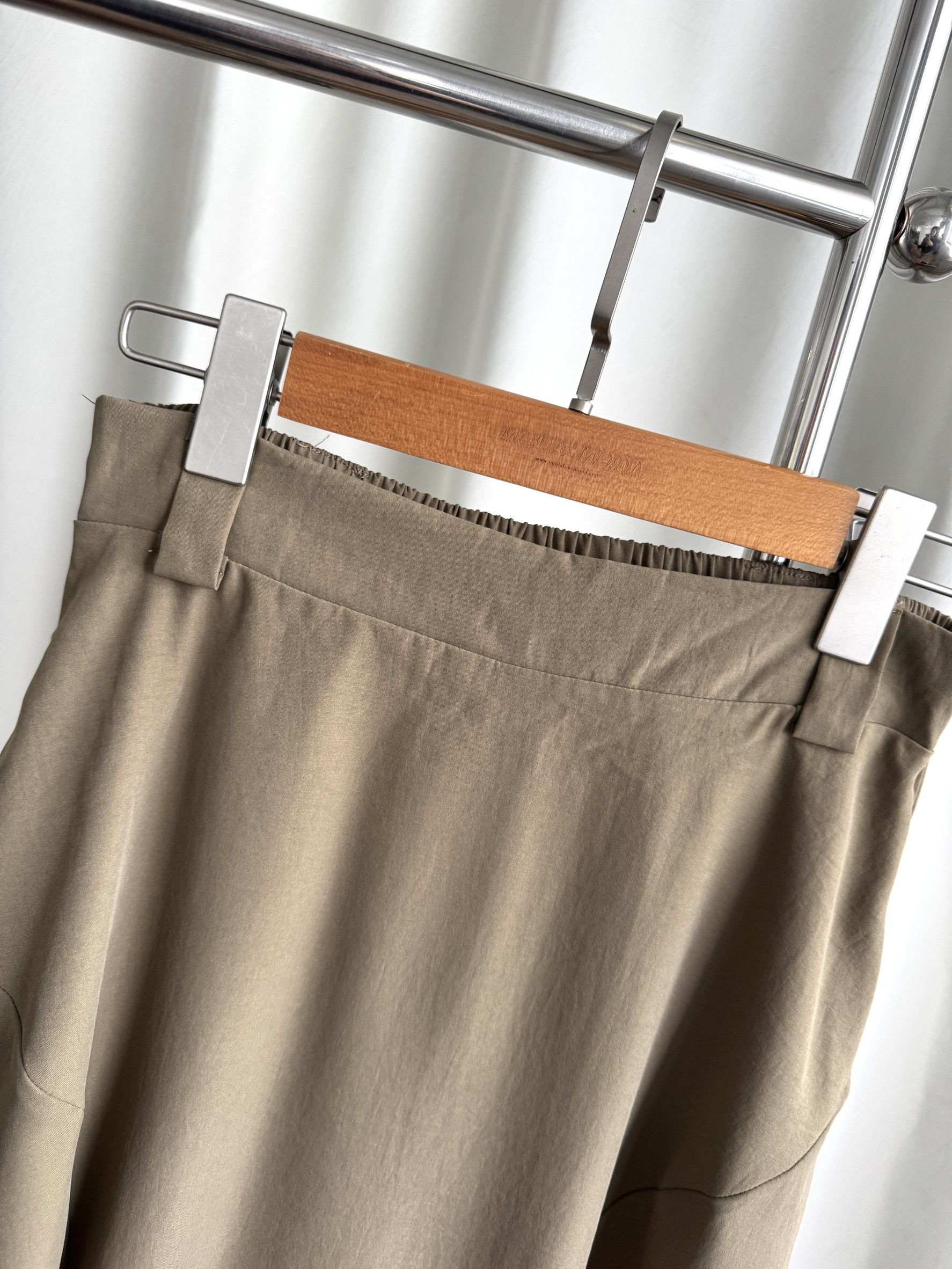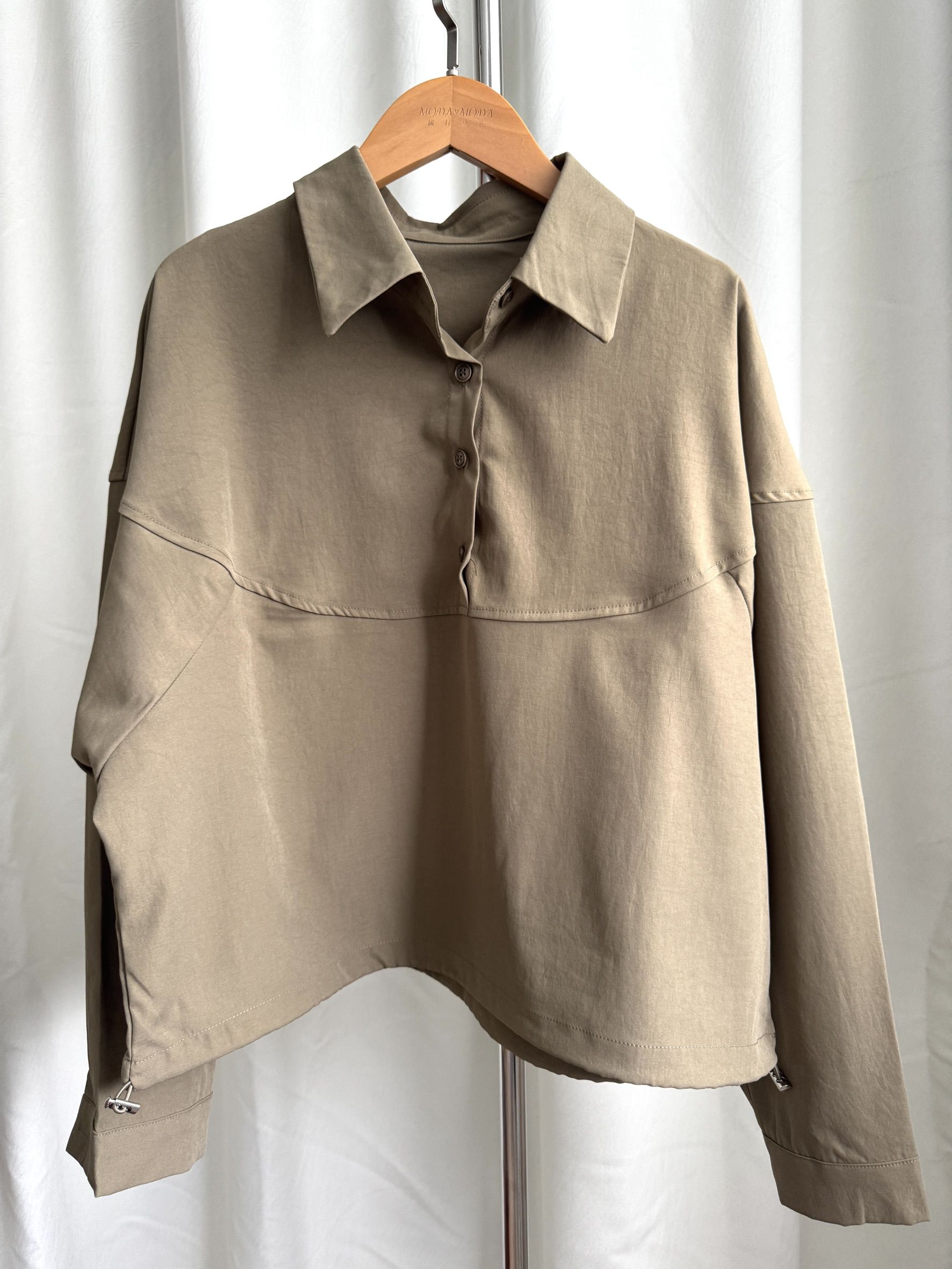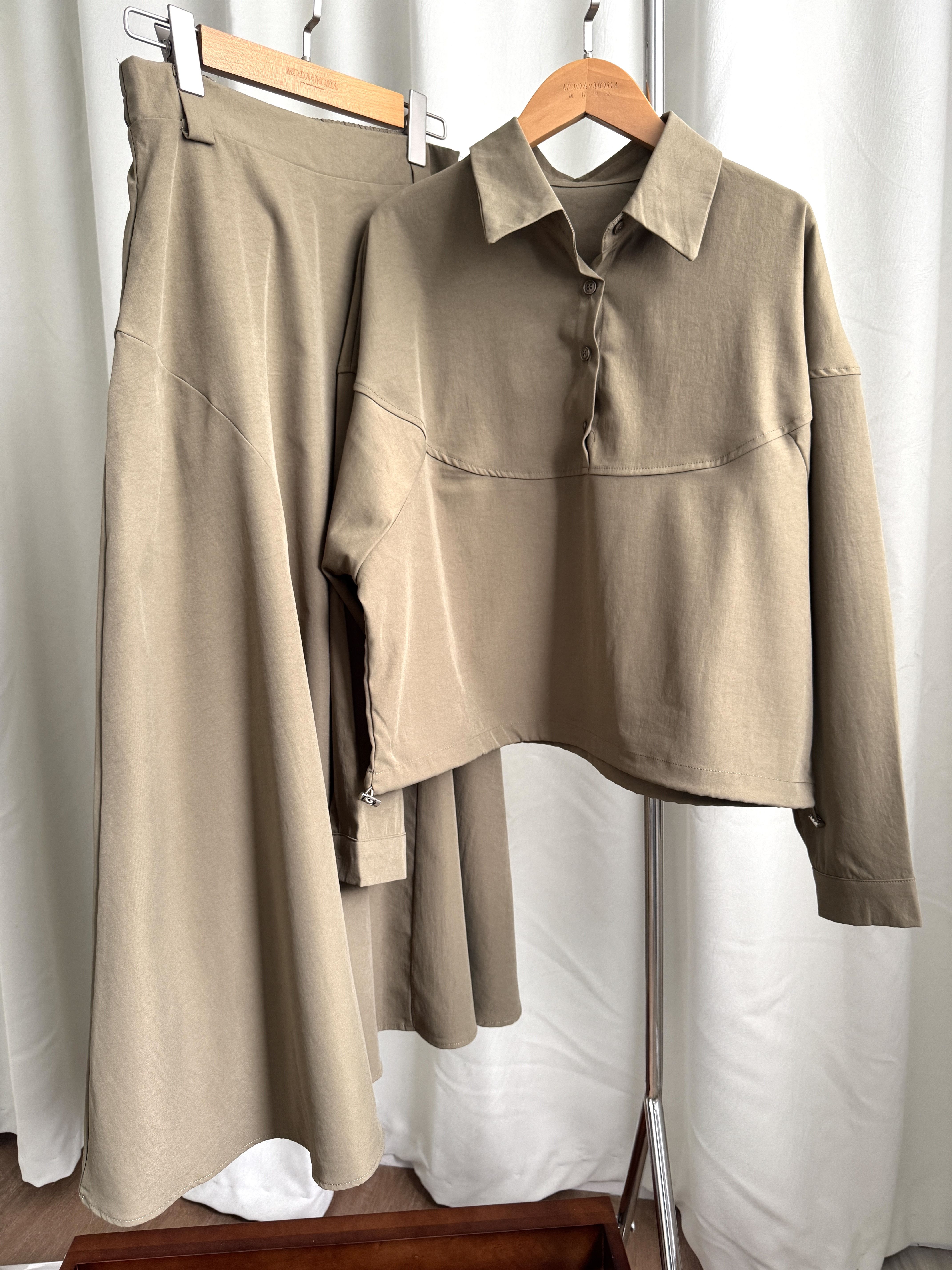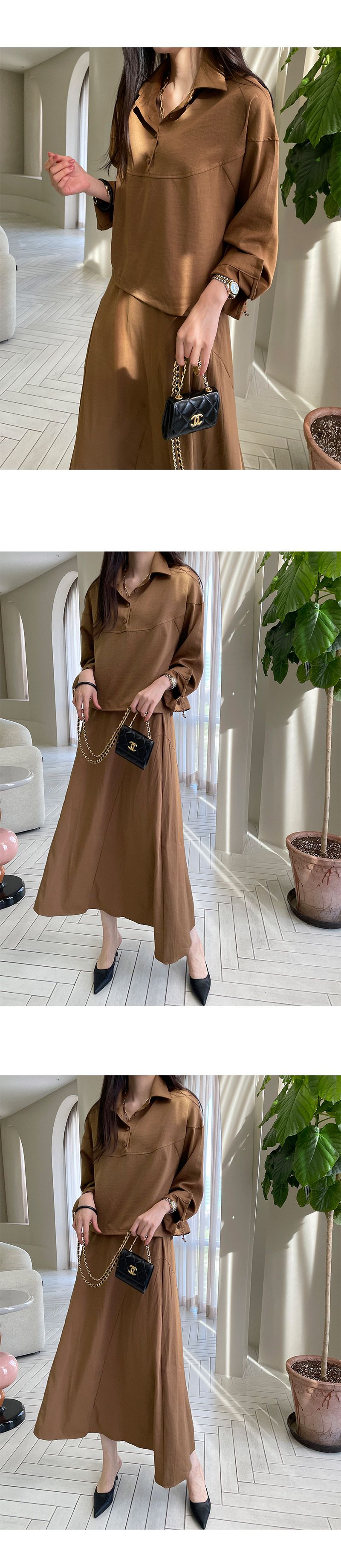 超值兩件組/半開襟襯衫/弧形切割/抽繩收腰/下襬抽繩/後腰鬆緊/皮帶環/無口袋/A字傘裙 - 休閒居家婚禮OL上班族簡約百搭素面兩件式套裝襯衫套裝襯衫傘裙套裝收腰長袖上衣後腰鬆緊長裙棕色米色黑色卡其綠色