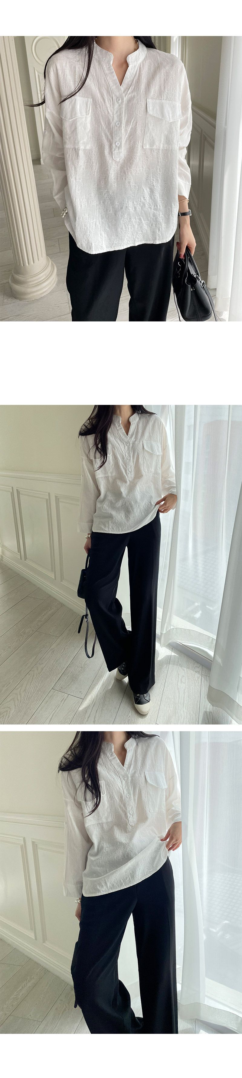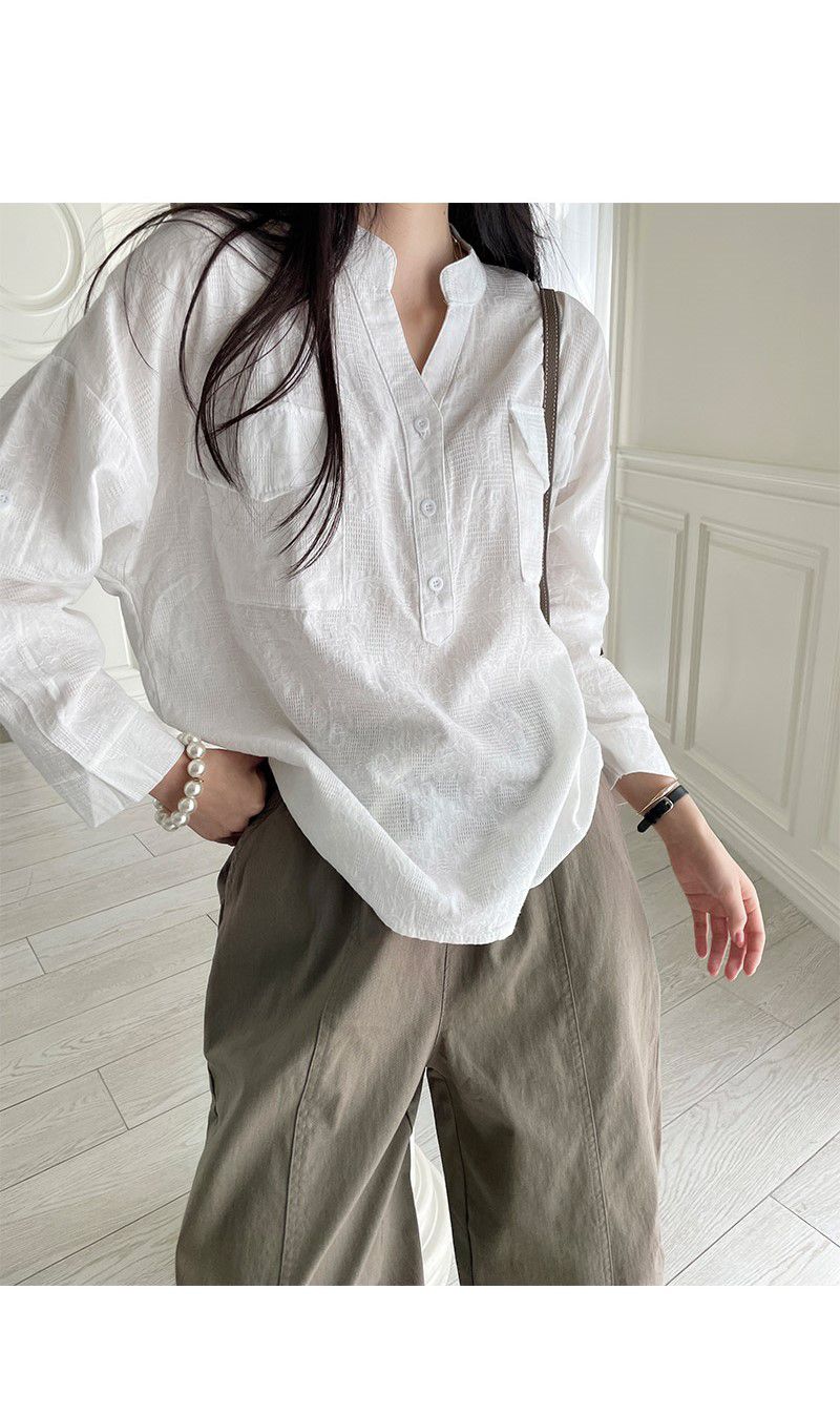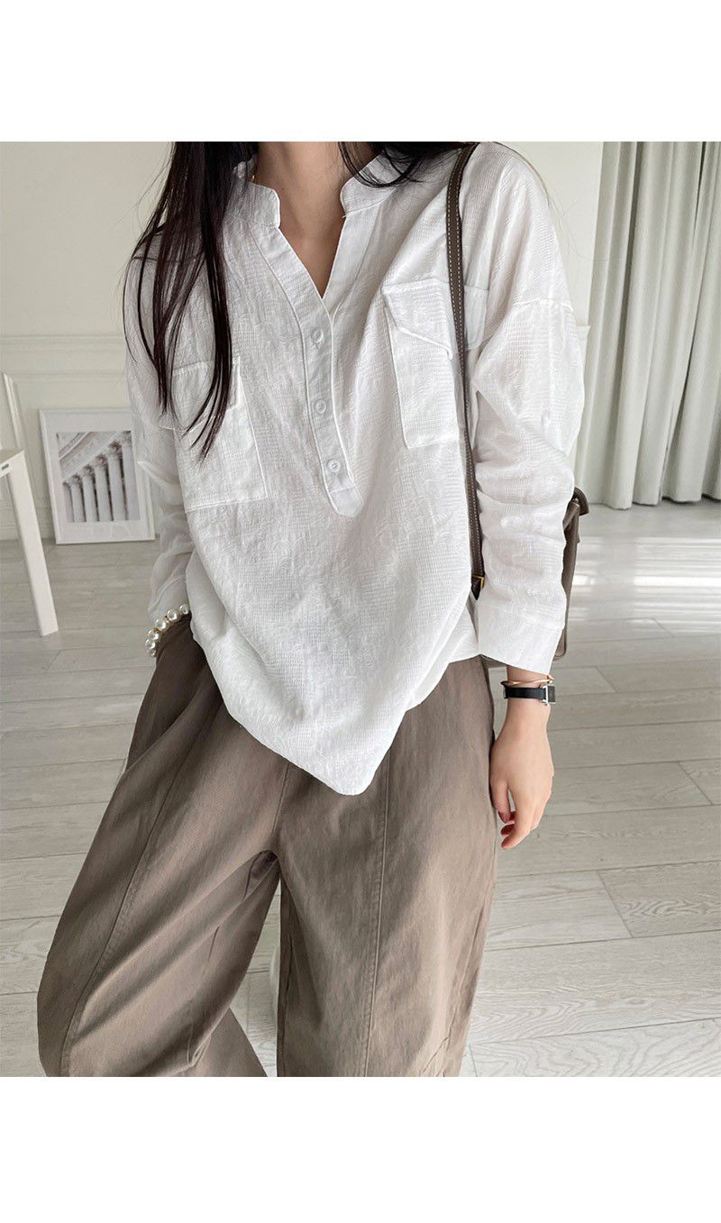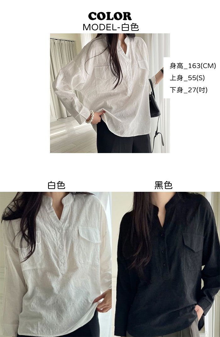 半開襟領/Y字領/V領/雙口袋/寬鬆長版/落肩長袖 - 休閒居家OL上班族簡約百搭素面亨利領襯衫上衣長袖襯衫寬鬆大尺碼上衣長版上衣長袖上衣白色黑色