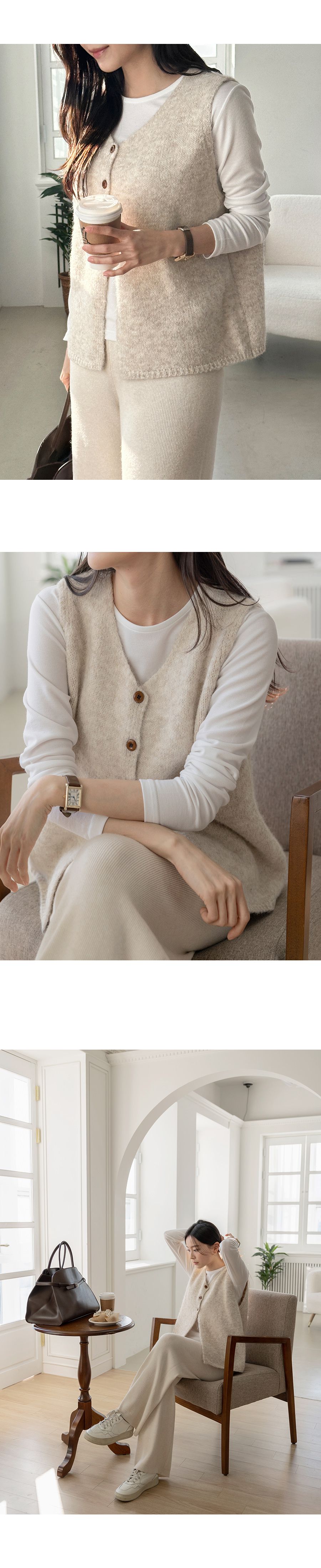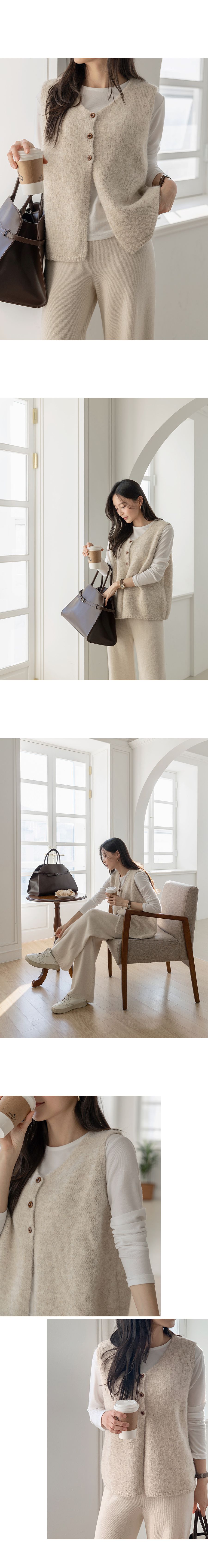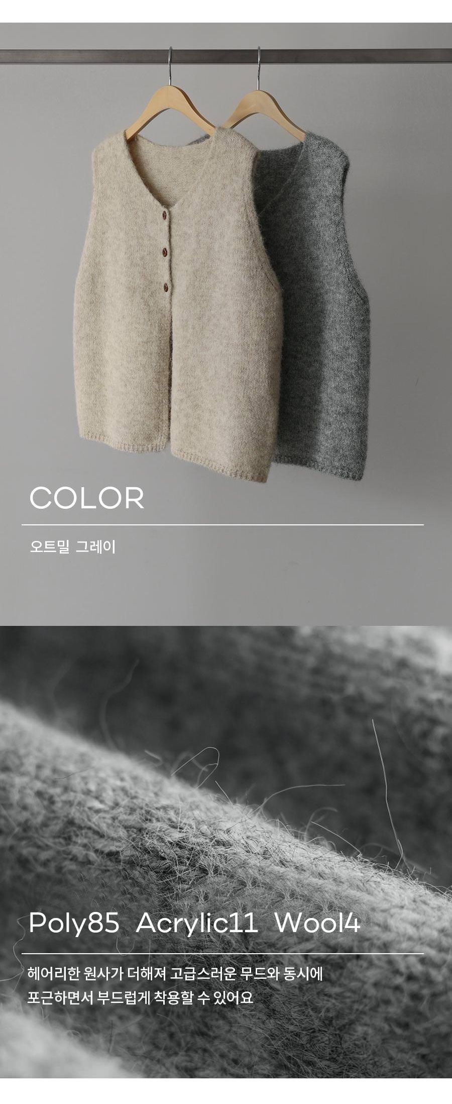 保暖混羊毛蓬鬆/微刺/V領/開襟排釦/三釦/下襬開衩/寬肩無袖 - 休閒居家簡約百搭素面開衩混羊毛背心外套針織背心針織衫針織外套寬肩無袖外套燕麥色灰色