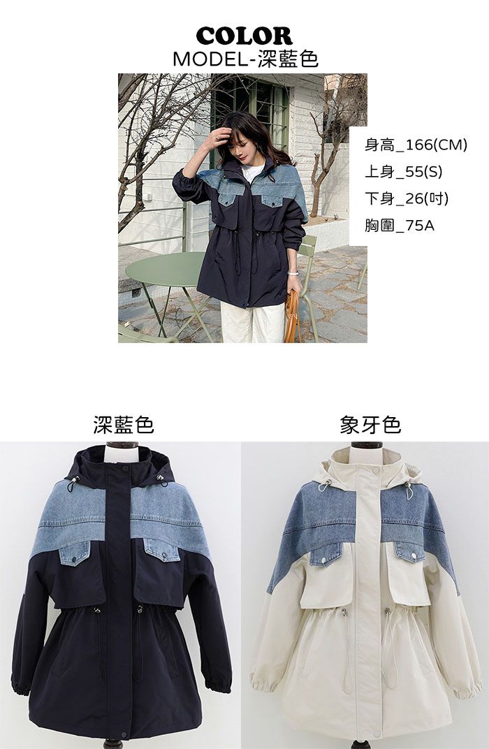 雙材質拼接/牛仔拼布/抽繩收腰/抽繩連帽/防風拉鍊/防風立領/胸前假口袋/側雙口袋/有內裏 - 休閒居家簡約百搭素面牛仔拼色夾克外套長袖外套連帽外套拉鍊外套深藍色象牙色