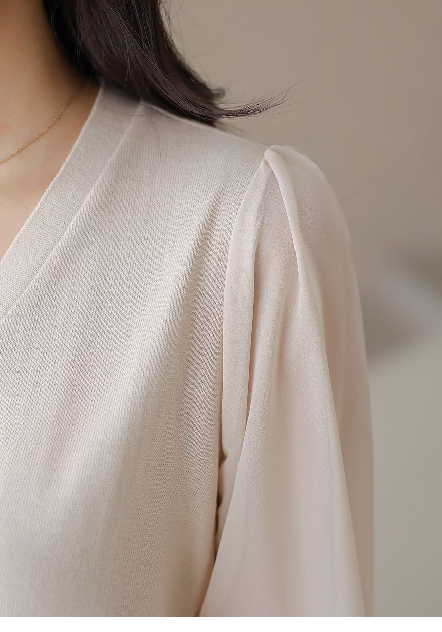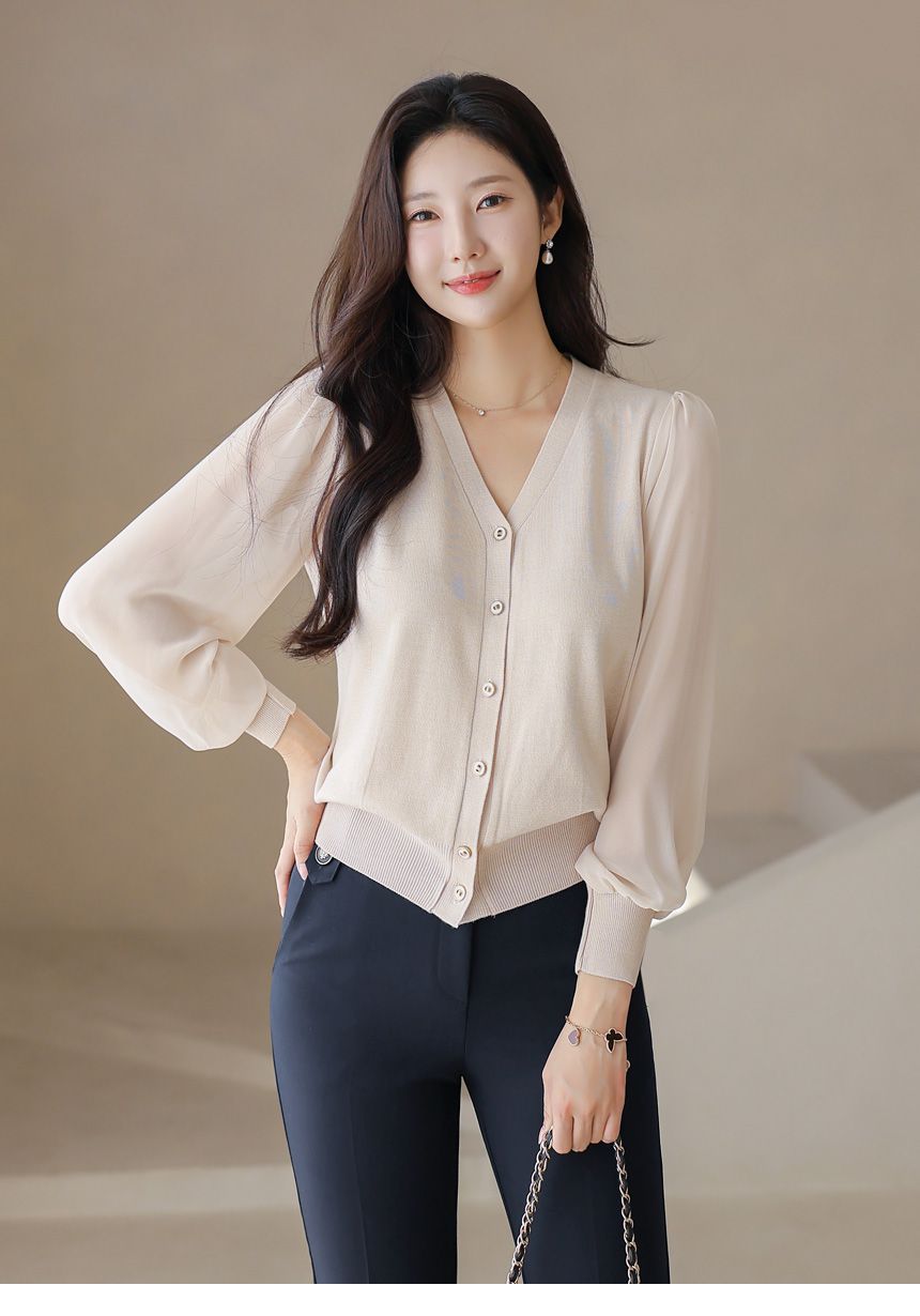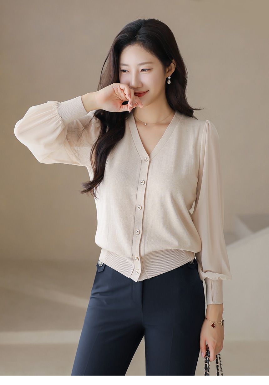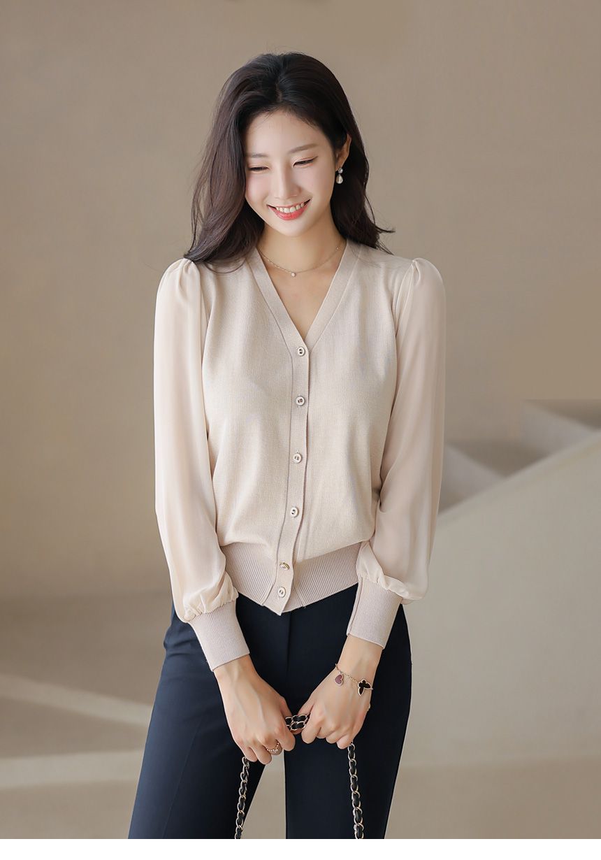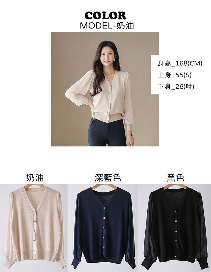 雙材質拼接/雪紡拼接上衣/透膚雪紡袖/寬袖/V領/開襟排釦 - 休閒OL上班族婚禮簡約百搭素面雪紡拼袖針織衫針織上衣針織外套長袖上衣外套奶油色深藍色黑色