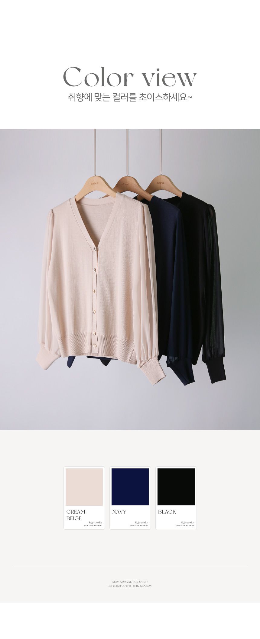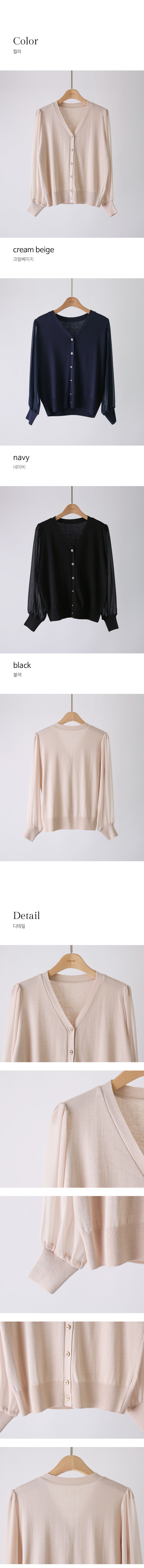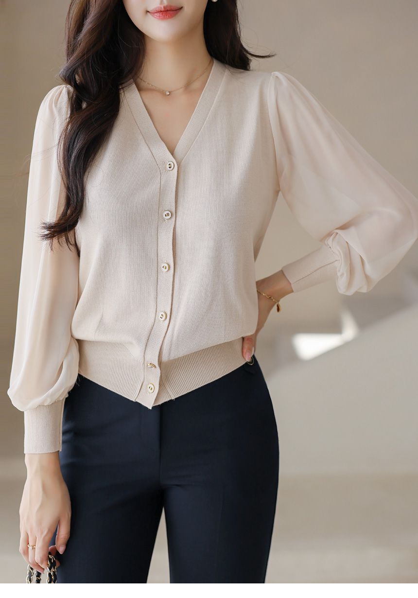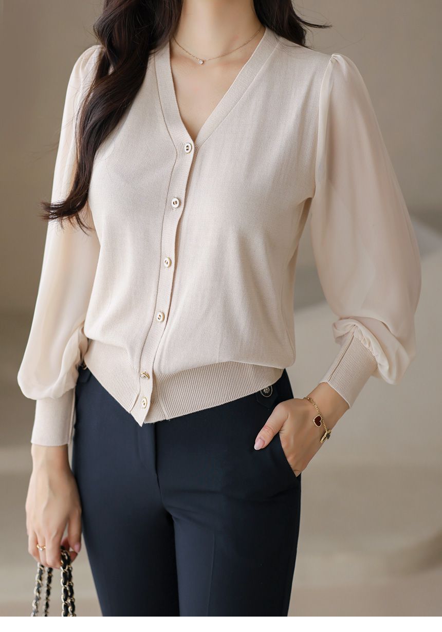 雙材質拼接/雪紡拼接上衣/透膚雪紡袖/寬袖/V領/開襟排釦 - 休閒OL上班族婚禮簡約百搭素面雪紡拼袖針織衫針織上衣針織外套長袖上衣外套奶油色深藍色黑色