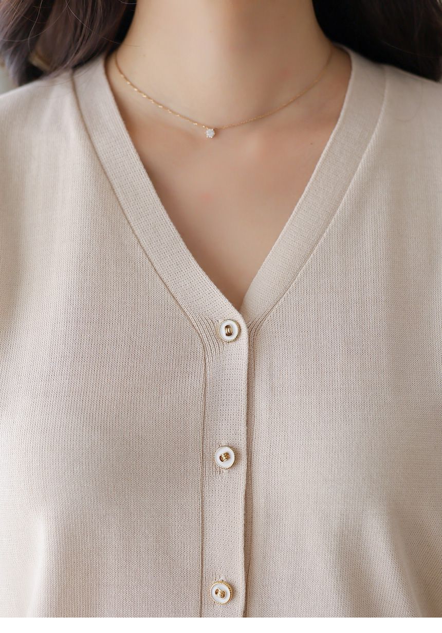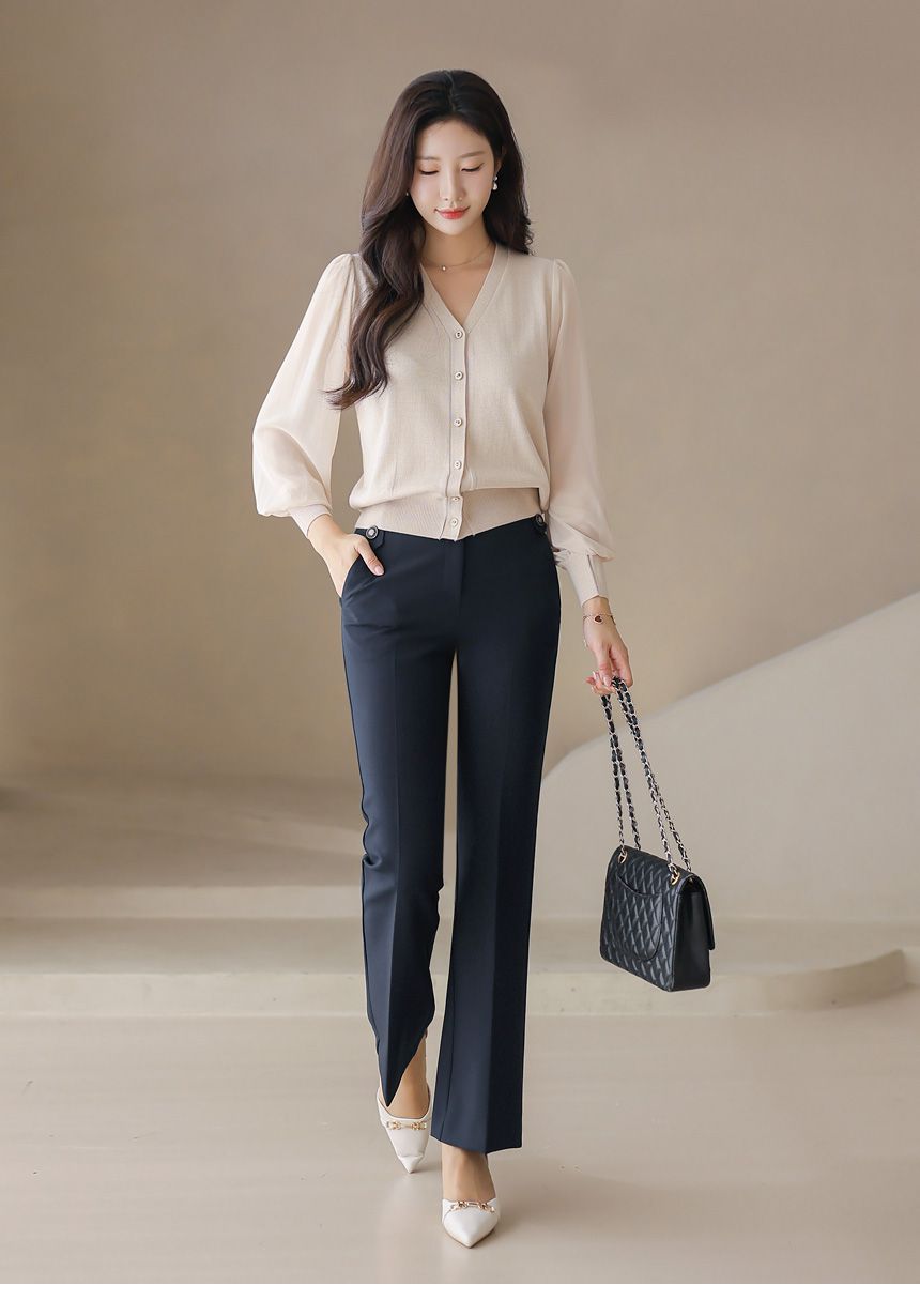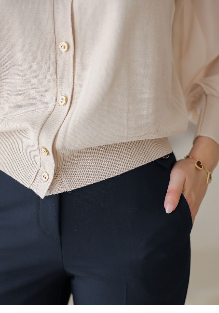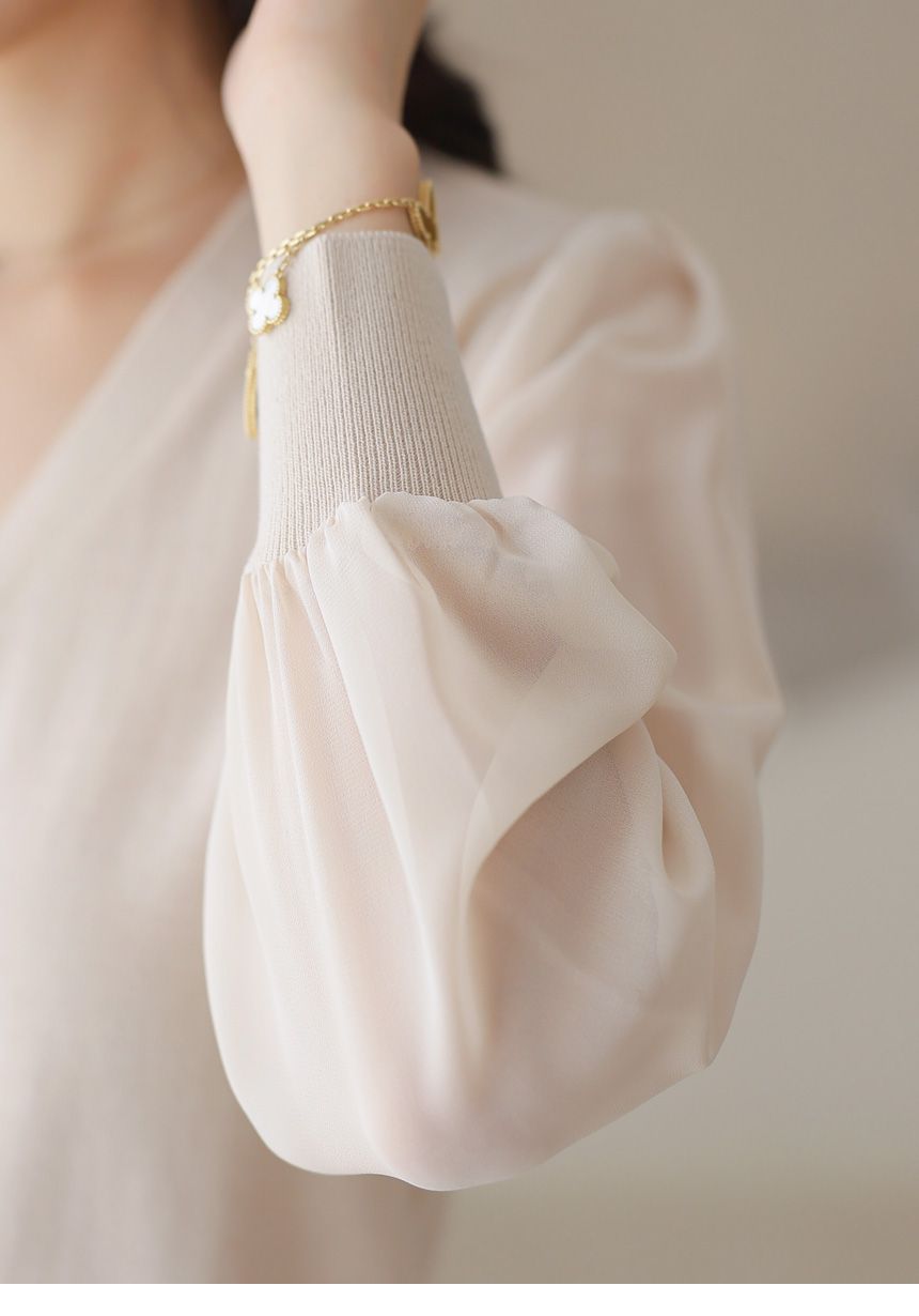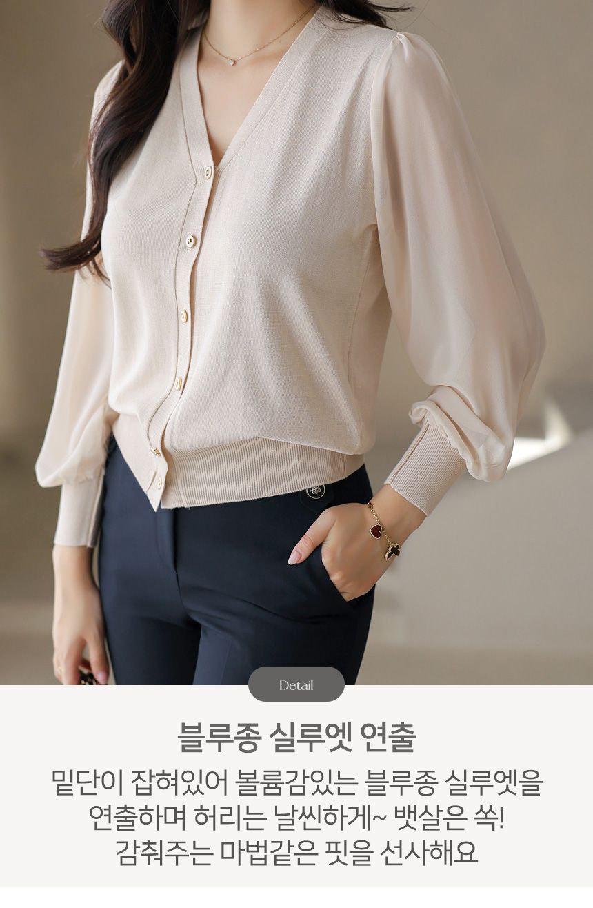 雙材質拼接/雪紡拼接上衣/透膚雪紡袖/寬袖/V領/開襟排釦 - 休閒OL上班族婚禮簡約百搭素面雪紡拼袖針織衫針織上衣針織外套長袖上衣外套奶油色深藍色黑色