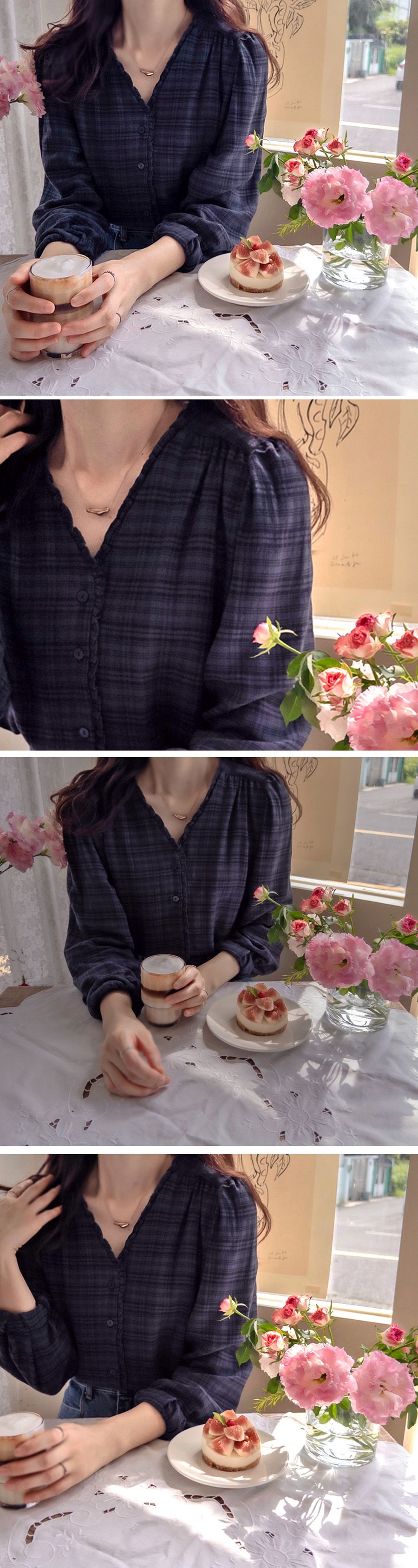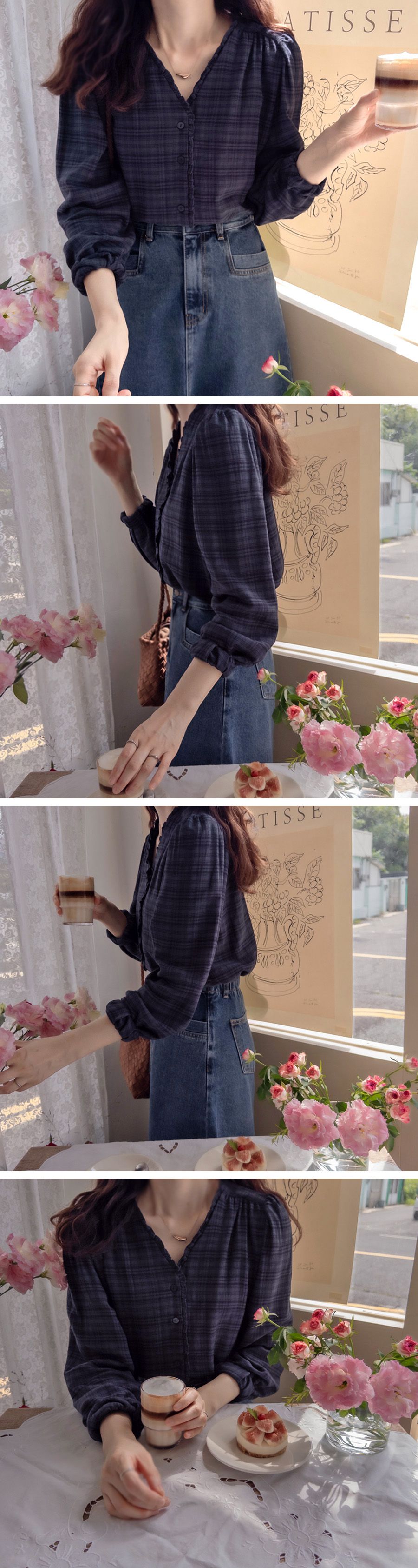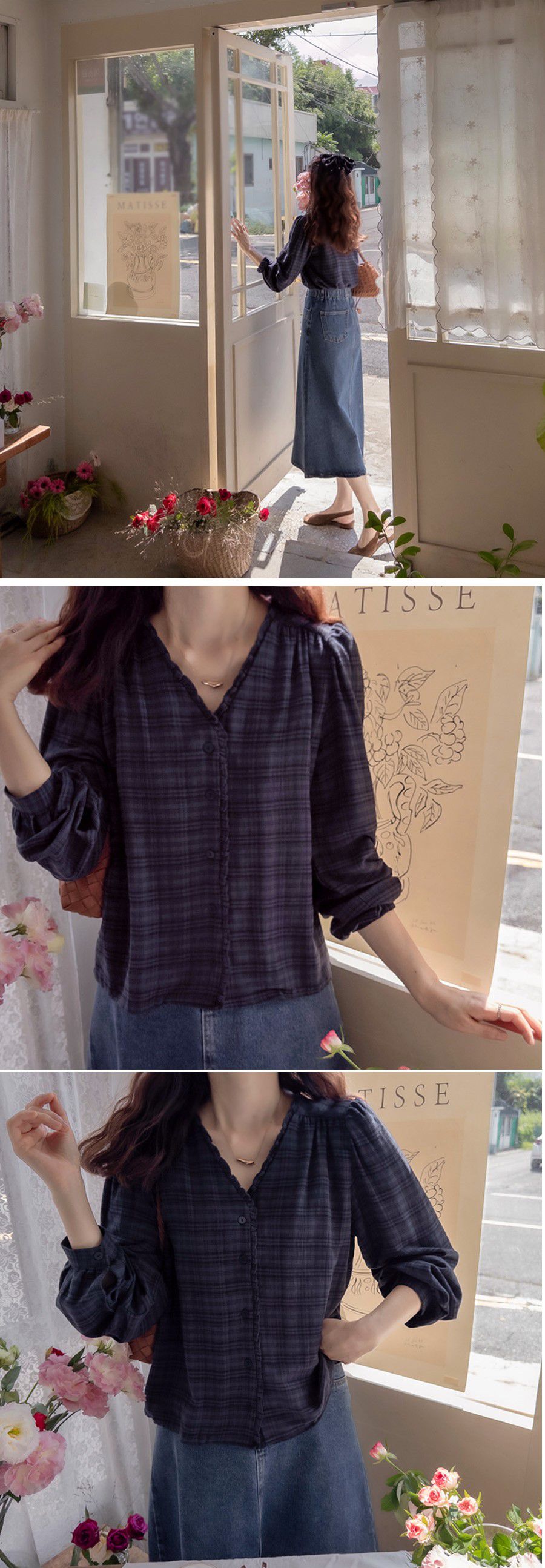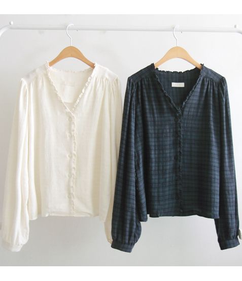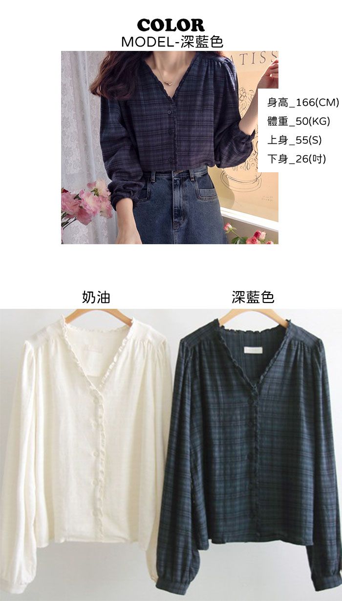 波浪滾邊/V領/開襟排釦/公主袖/寬袖 - 休閒渡假婚禮OL上班族鋸齒花邊襯衫上衣長袖襯衫格紋襯衫長袖上衣深藍色奶油色