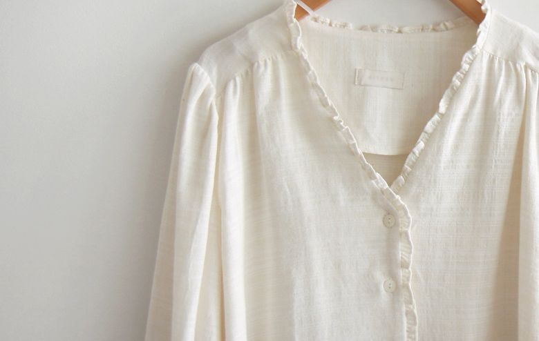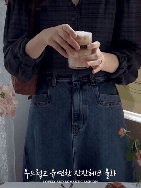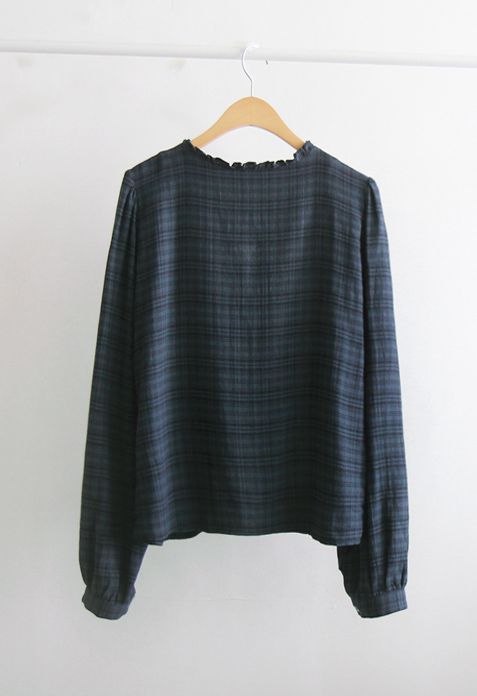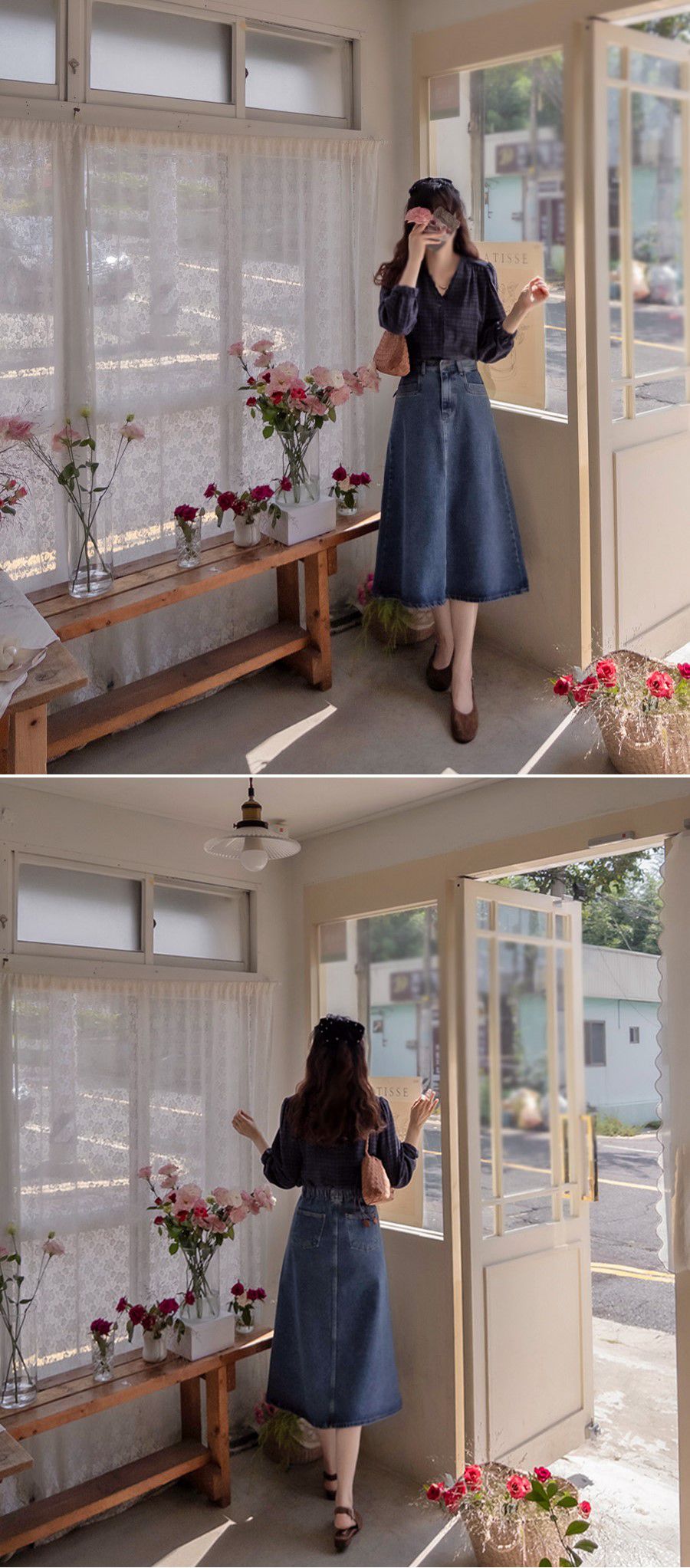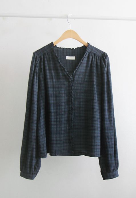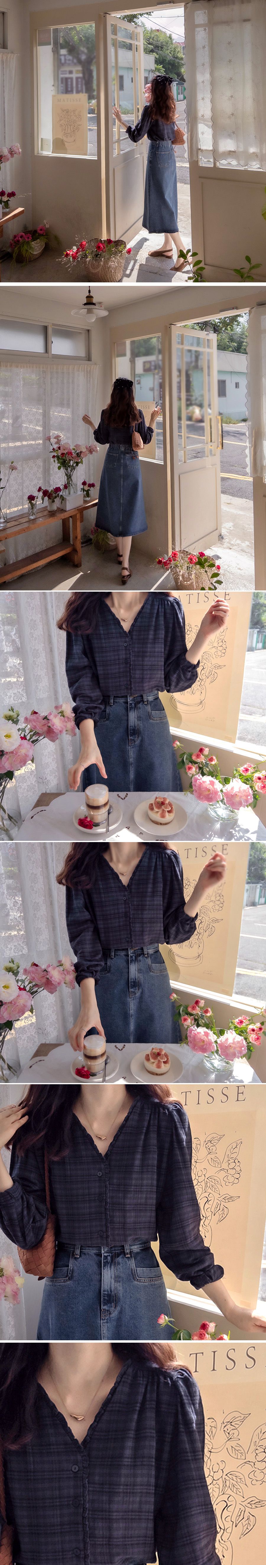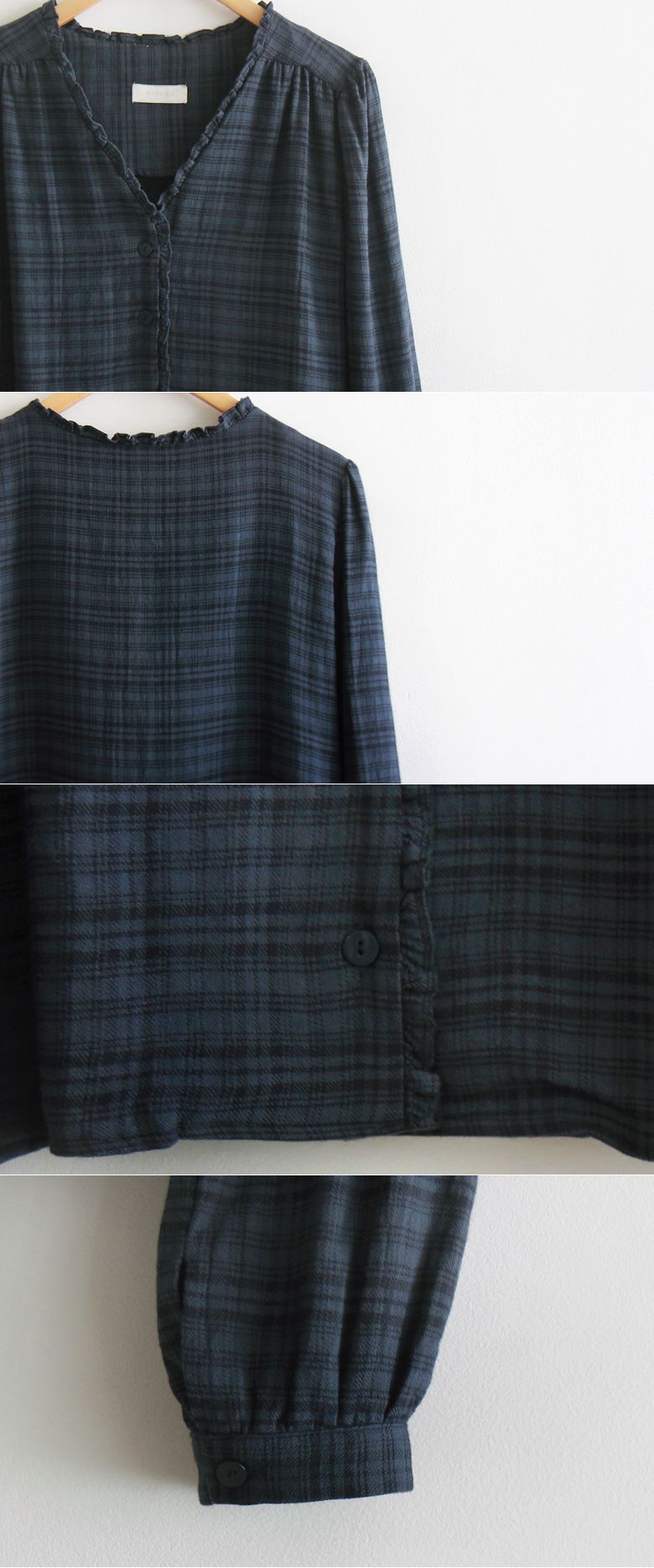 波浪滾邊/V領/開襟排釦/公主袖/寬袖 - 休閒渡假婚禮OL上班族鋸齒花邊襯衫上衣長袖襯衫格紋襯衫長袖上衣深藍色奶油色