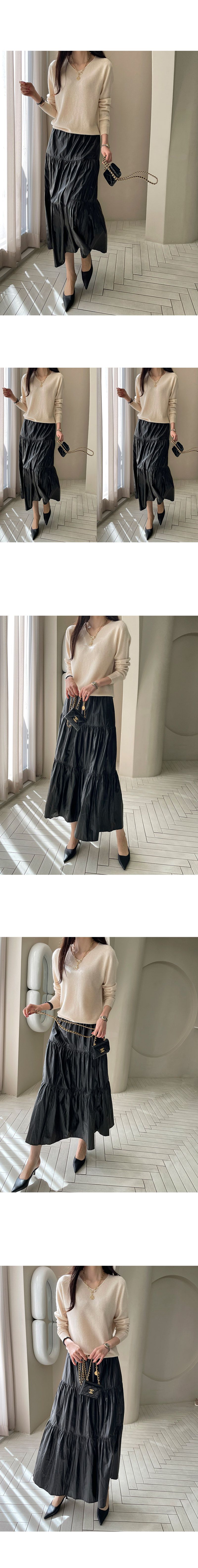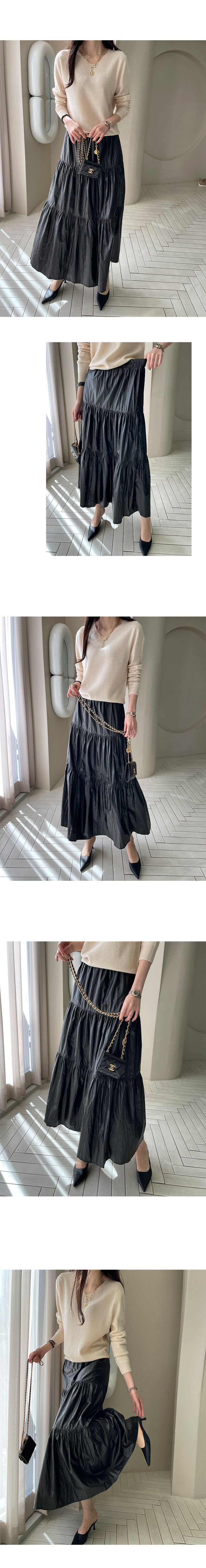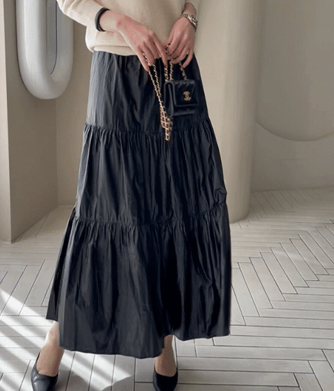 【C55537】韓國MNR 光澤傘狀皮裙-素面鬆緊腰木耳邊皺感蛋糕長裙