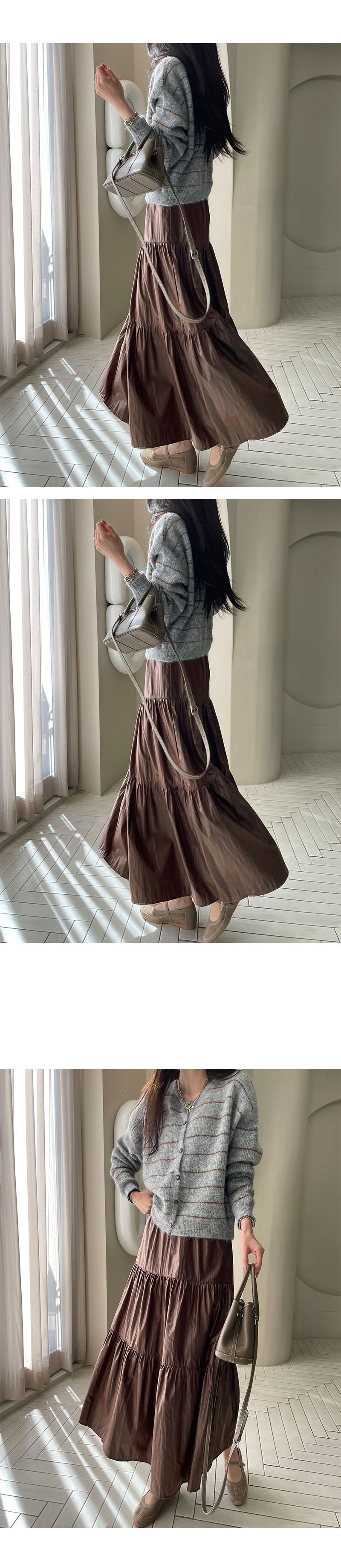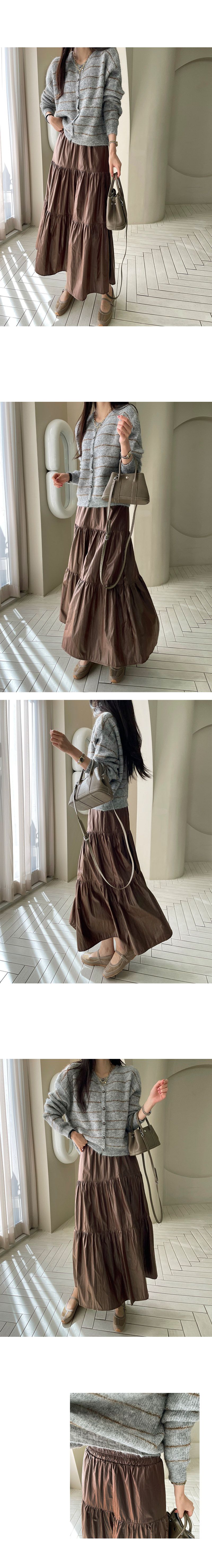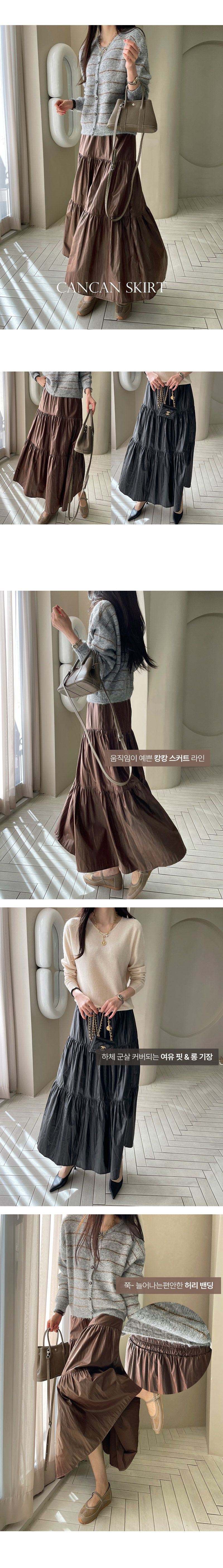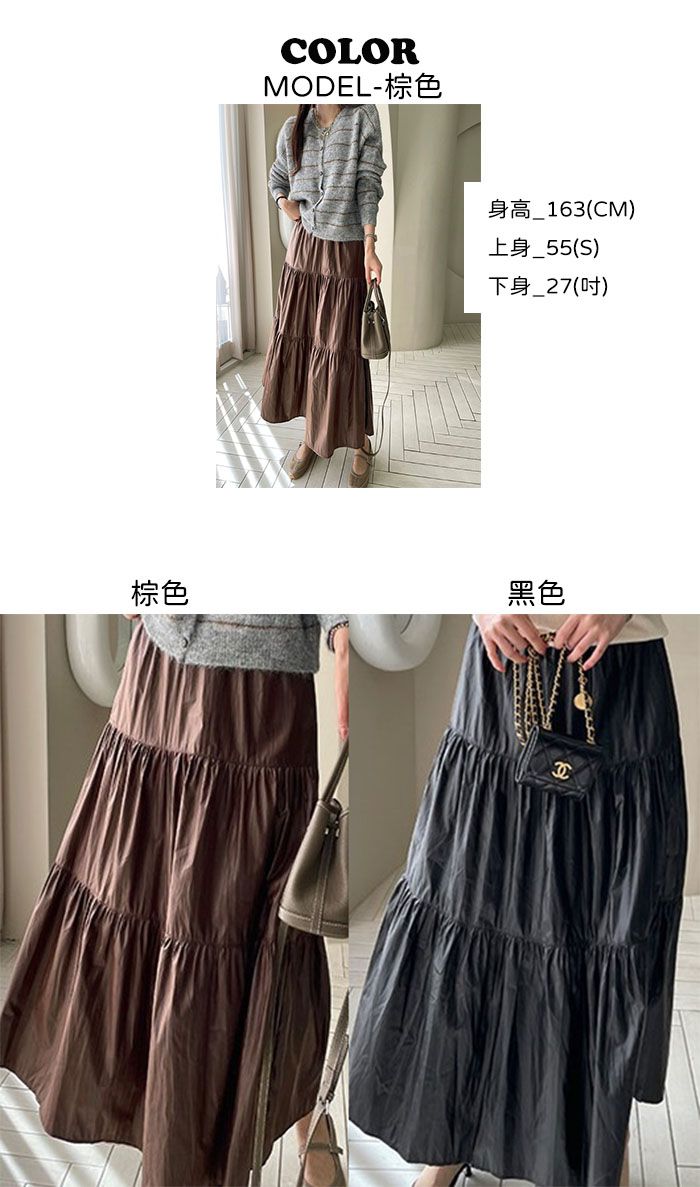 寬鬆裙襬對各種身形都很友善/蓬鬆度和垂墜感添增質感/光澤感看起來更高級-休閒居家簡約百搭光澤傘狀素面鬆緊腰木耳邊皺感蛋糕裙長裙皮裙棕色黑色