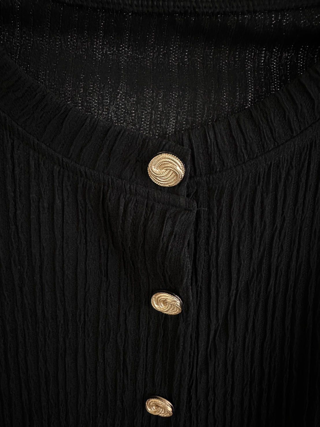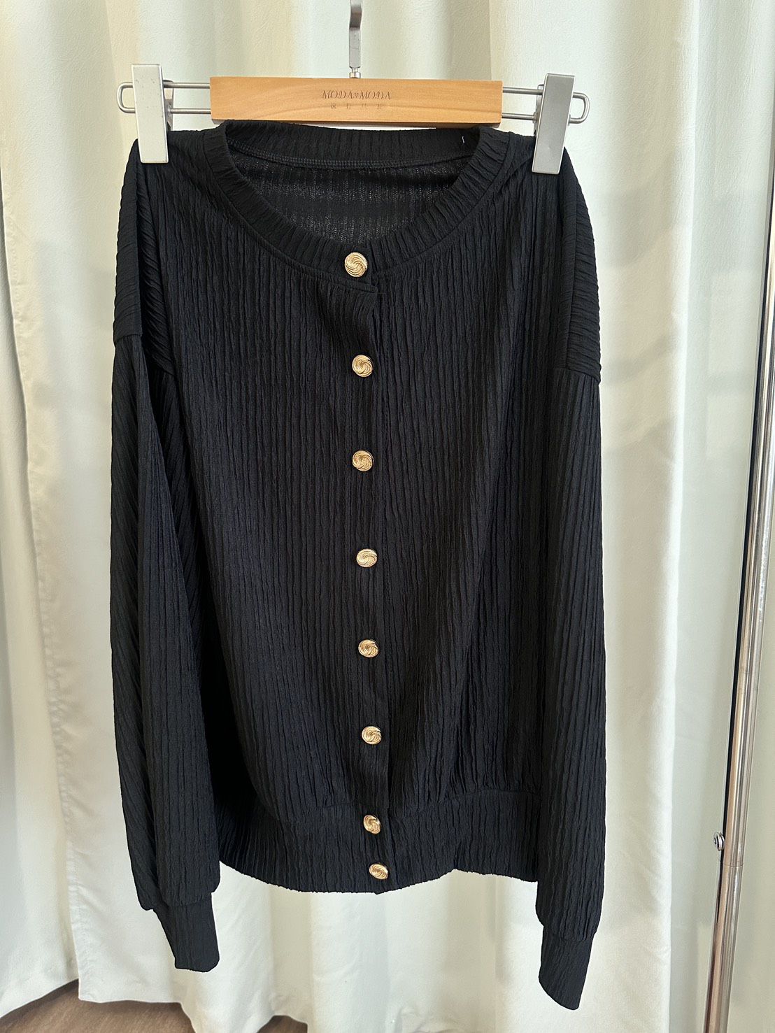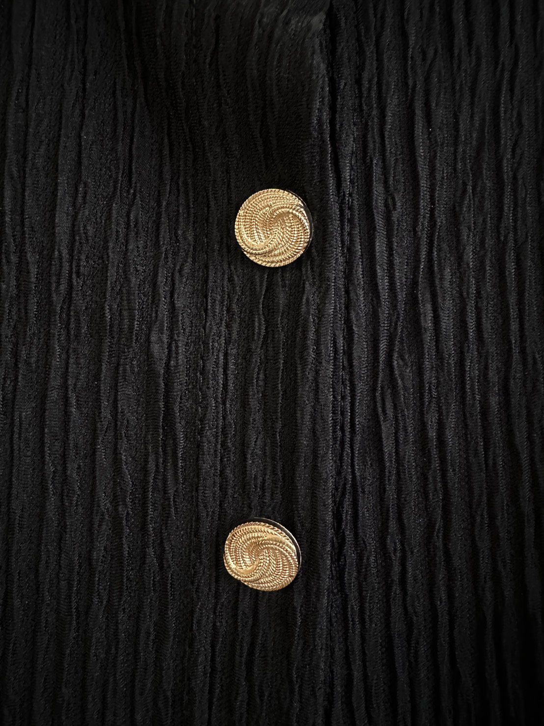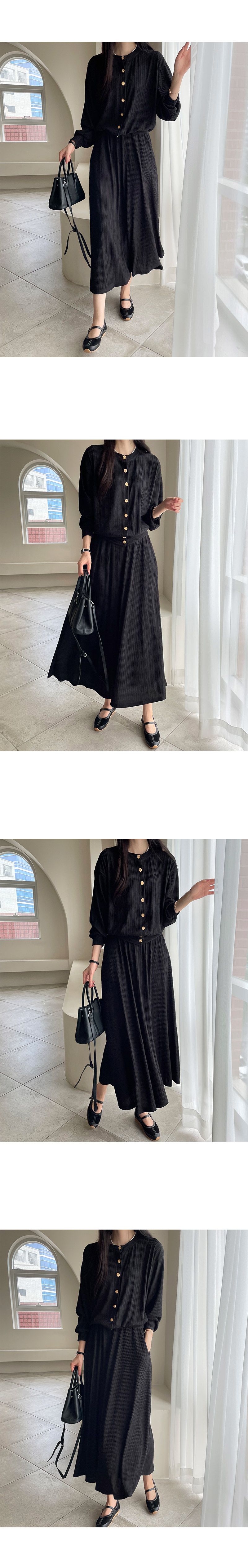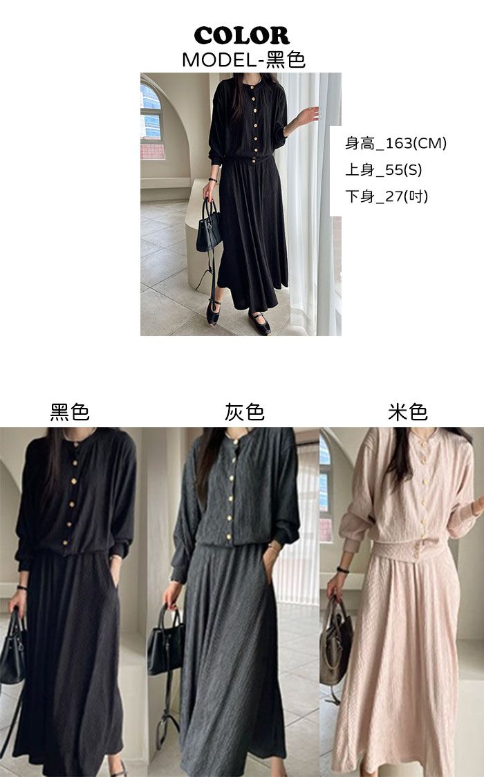 立體皺皺紋獨特不撞衫/裙襬飄逸走路有風/金色排釦更吸睛-休閒居家簡約百搭皺皺紋金釦口袋收腰開襟排釦A字裙素面圓領長袖上衣+鬆緊腰長裙套裝黑色灰色米色