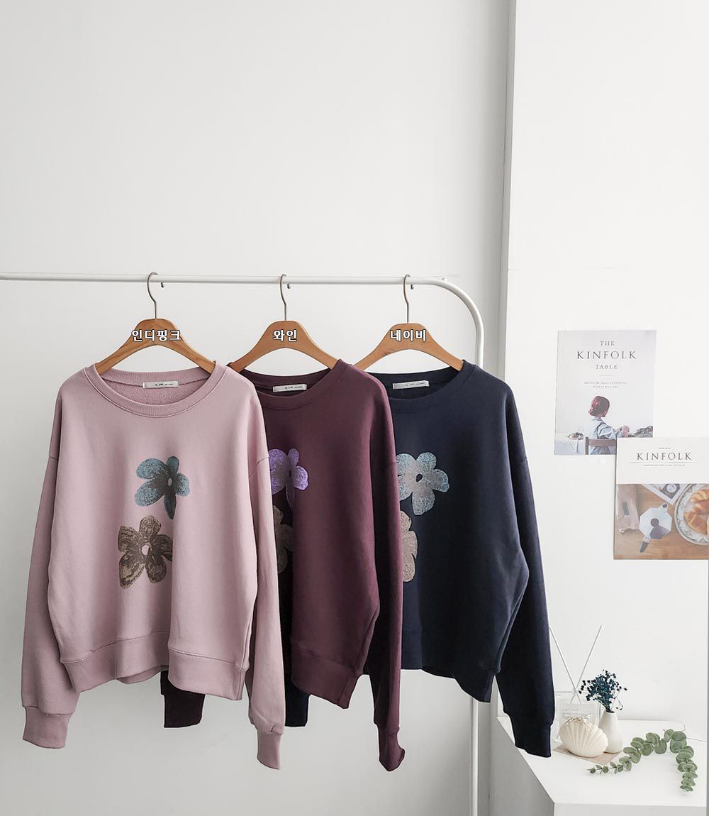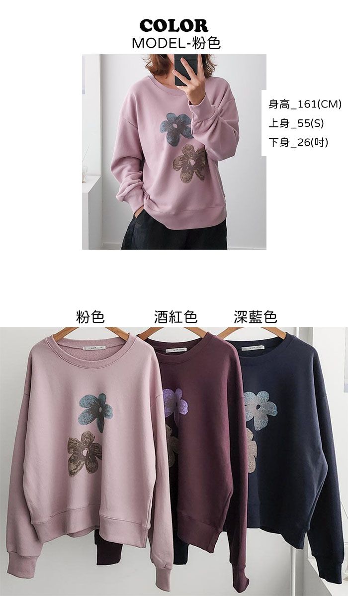 復古水洗低飽和度好顯白/純棉面料透氣又舒適/無限制身形-休閒居家簡約百搭復古花卉斑駁跳色花朵寬鬆圓領長袖上衣大學T粉色酒紅色深藍色