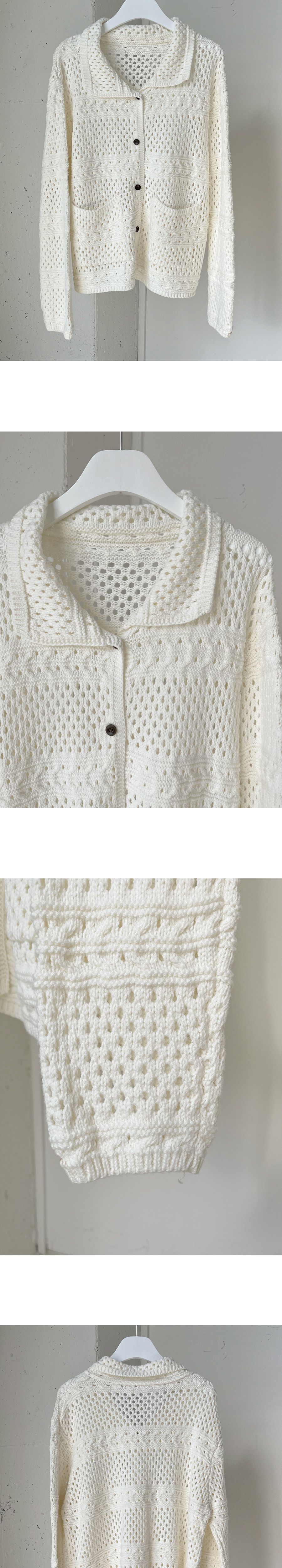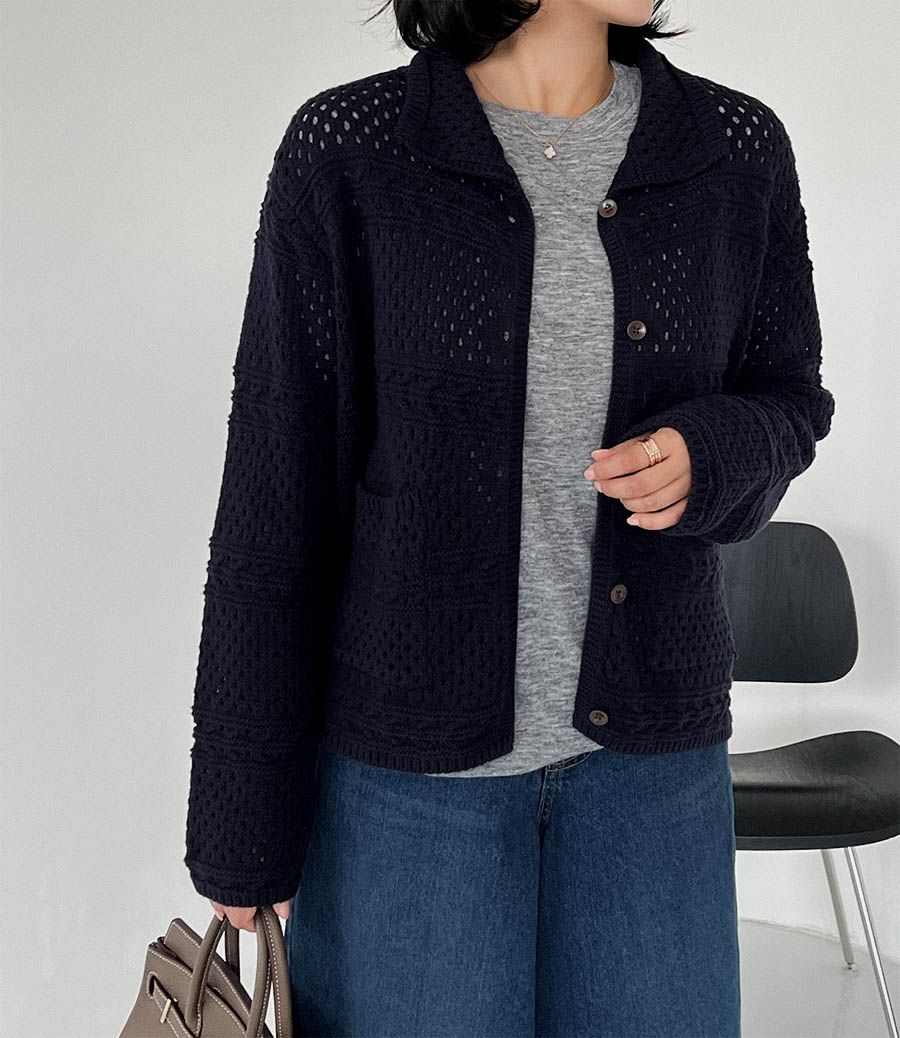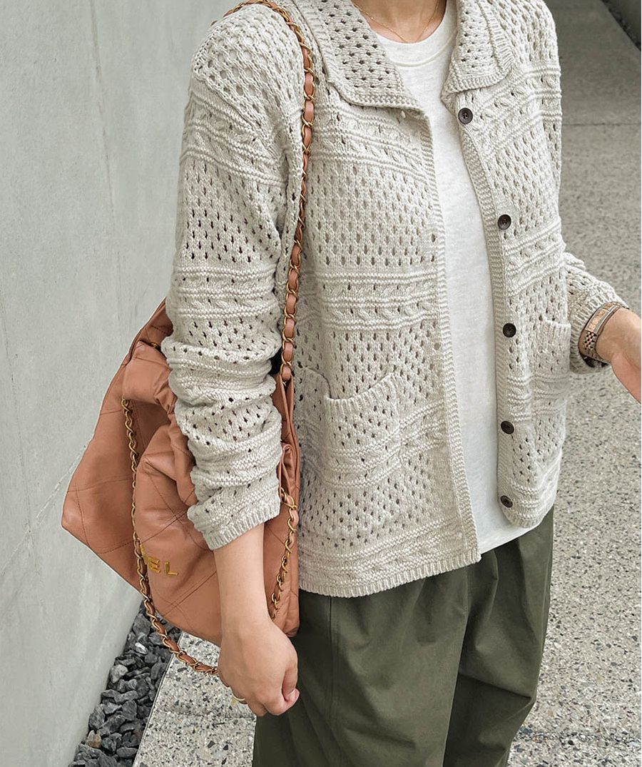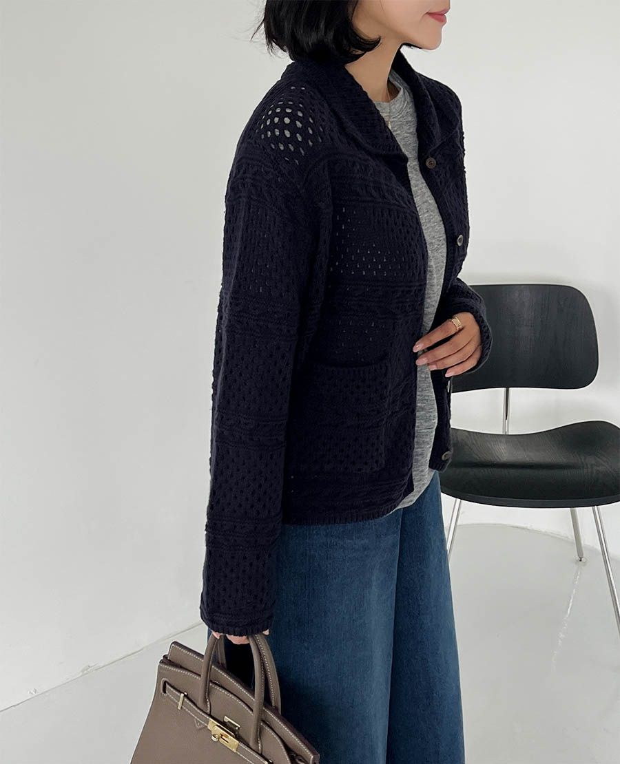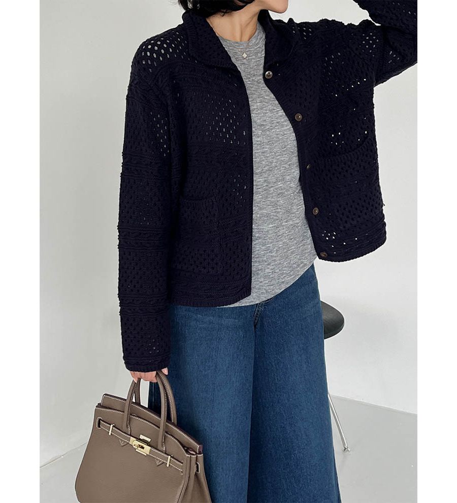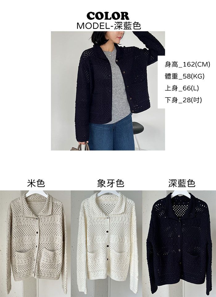 【C55556】韓國COJ 縷空雕花針織衫-素面翻領開襟排釦雙口袋長袖外套★★