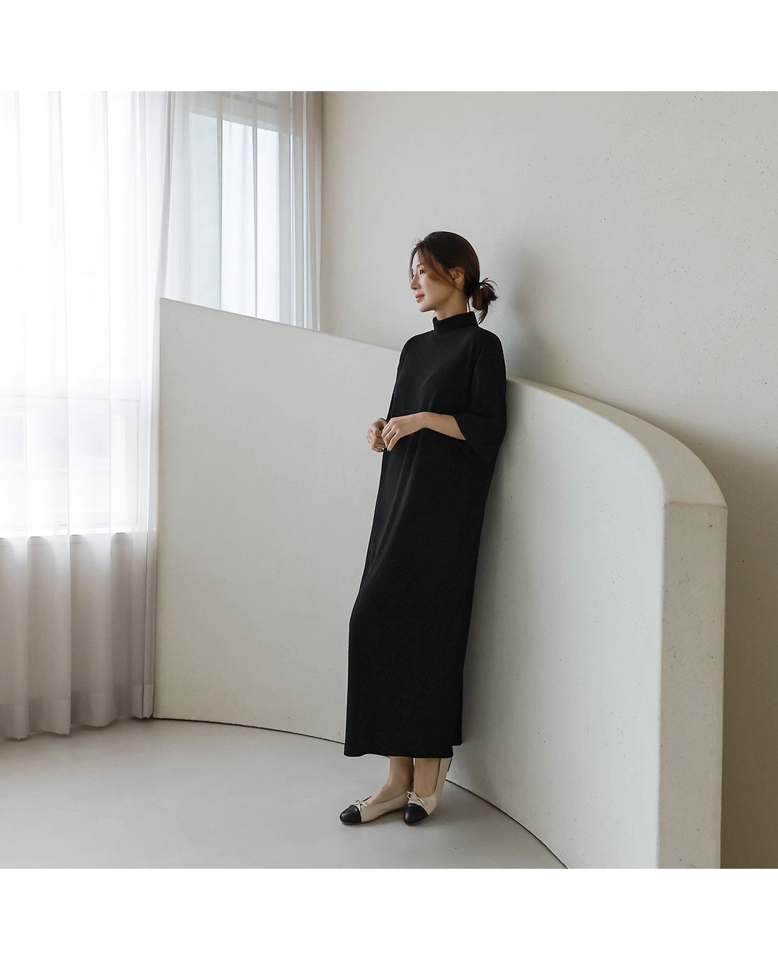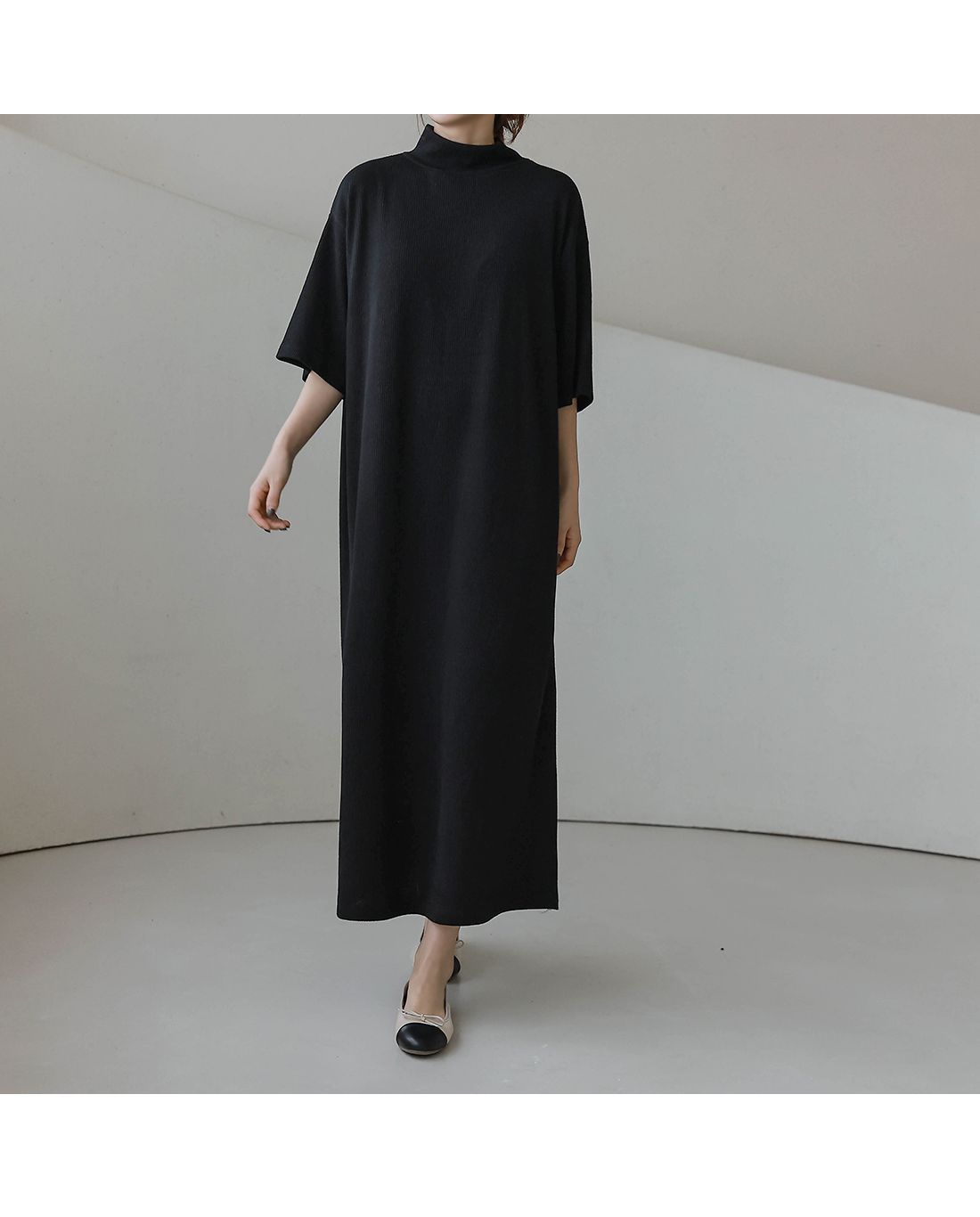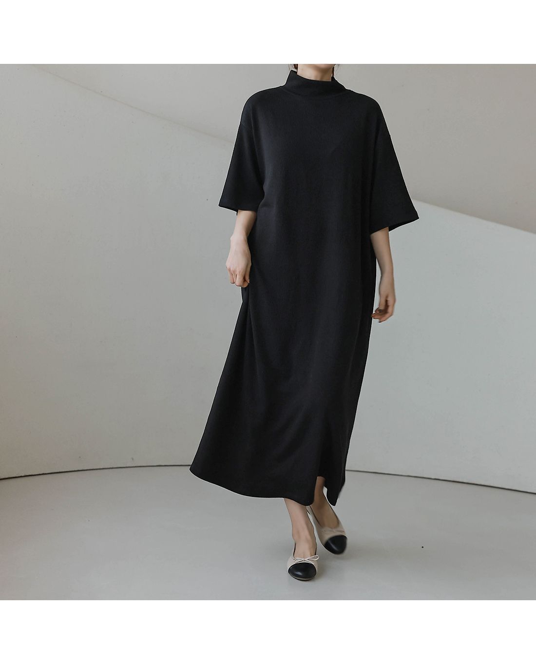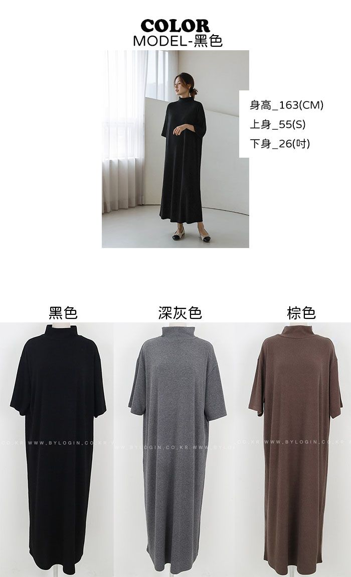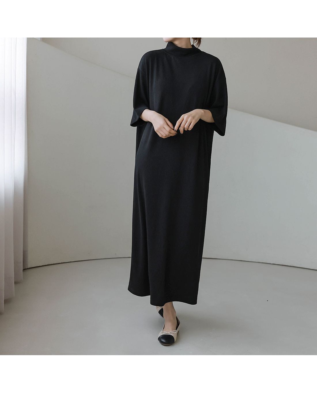 【C55573】韓國BLG 坑條立領洋裝-素面高領寬鬆直筒七分寬袖連身裙★★