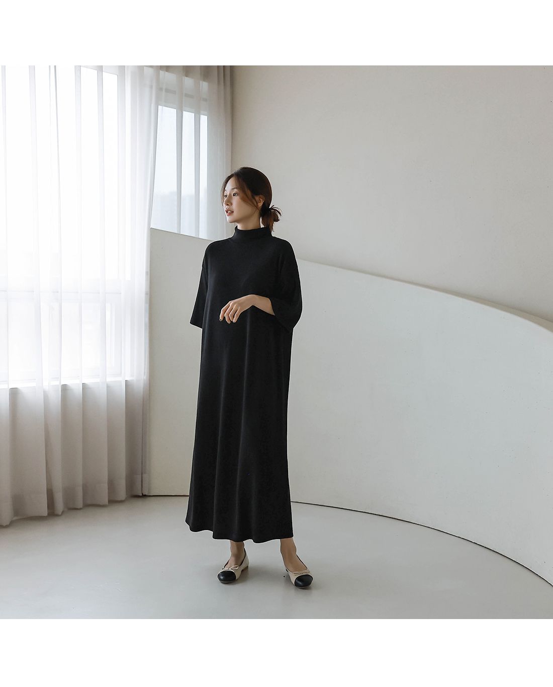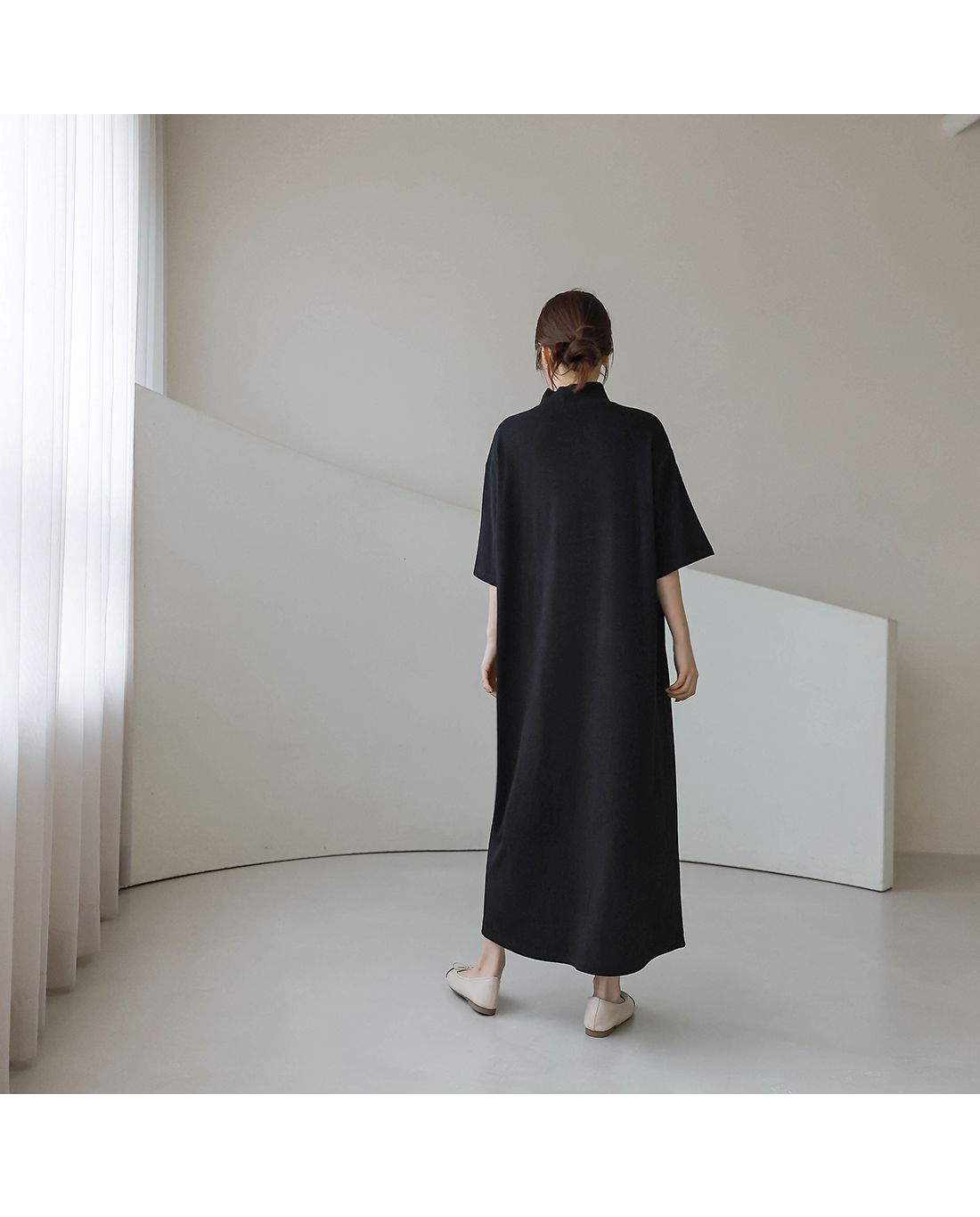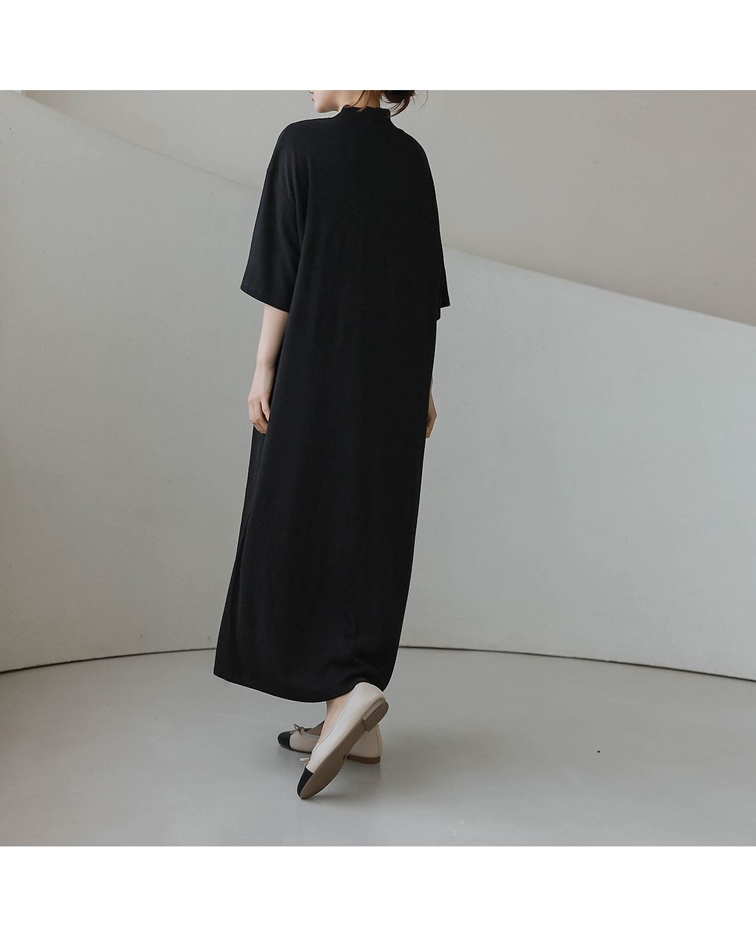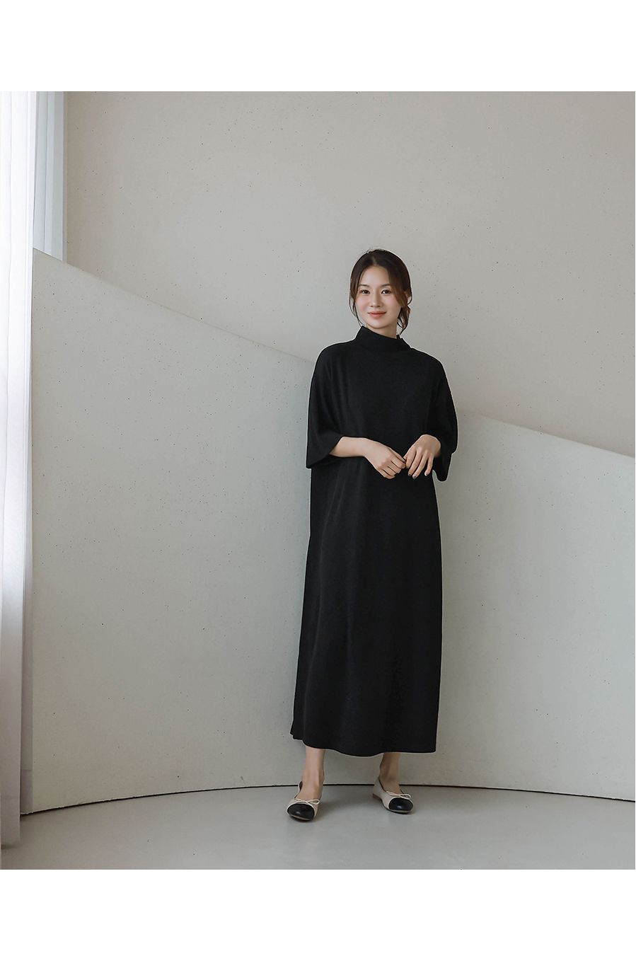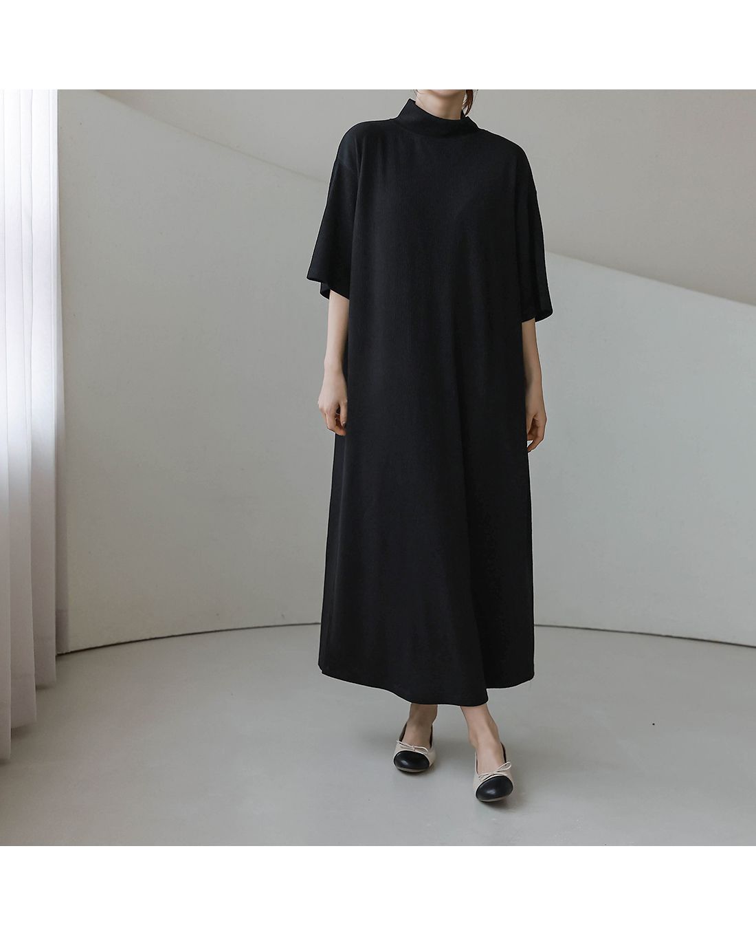 【C55573】韓國BLG 坑條立領洋裝-素面高領寬鬆直筒七分寬袖連身裙★★