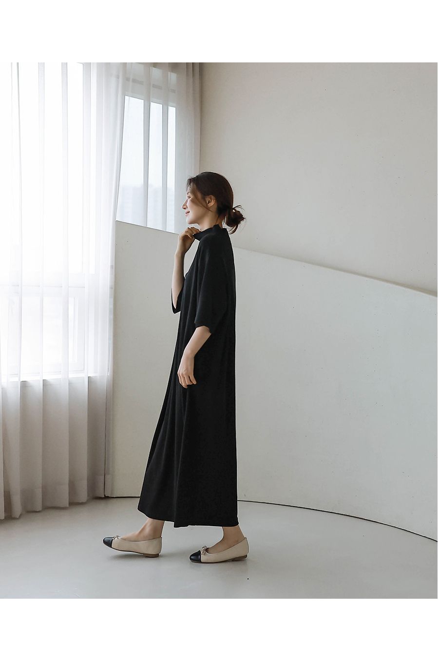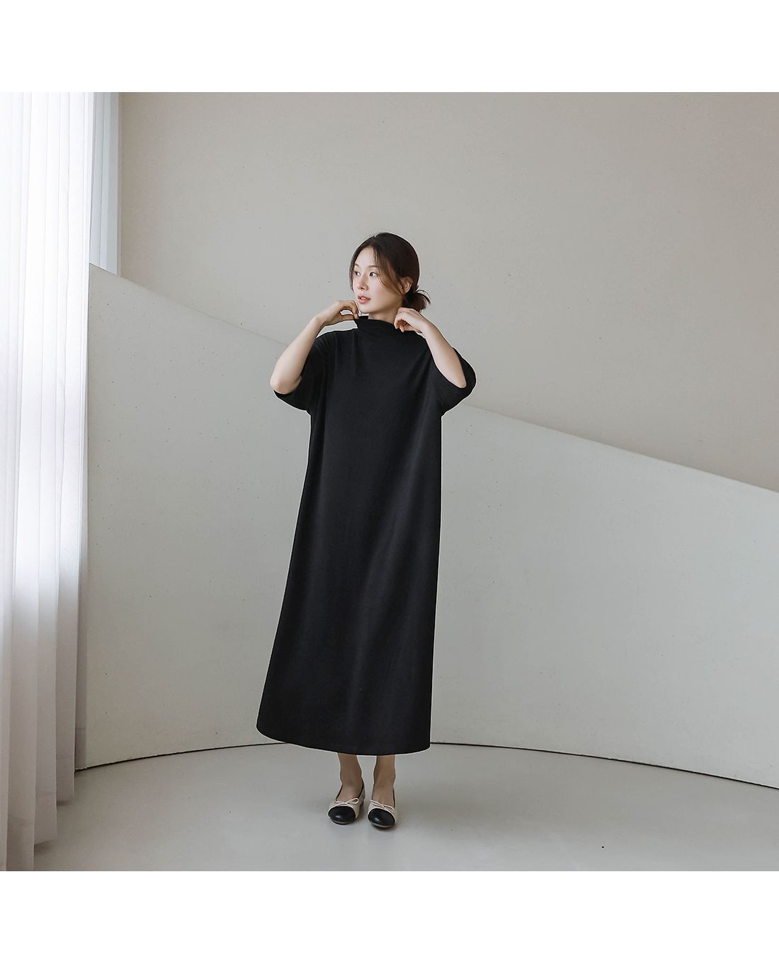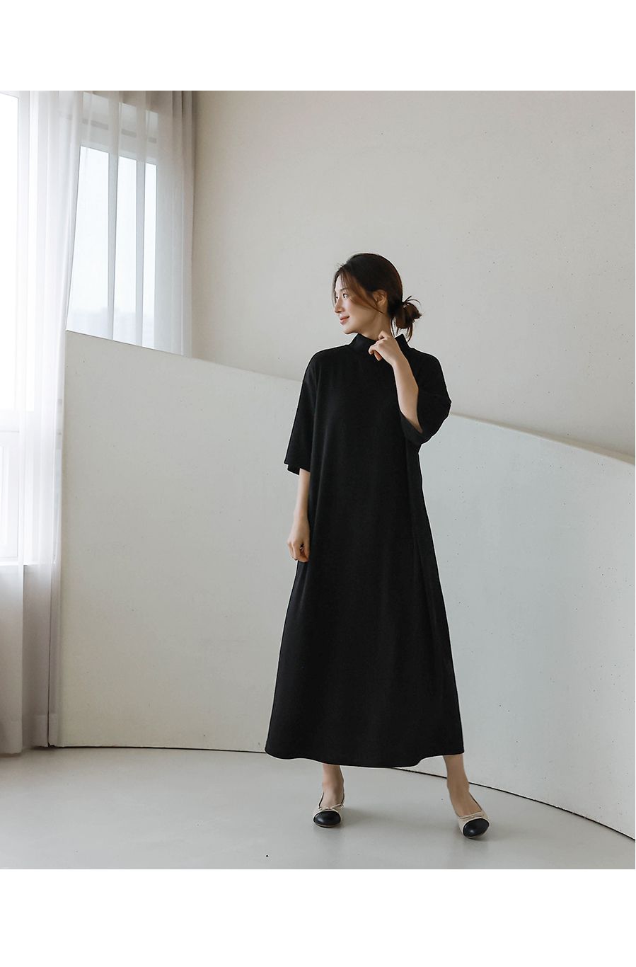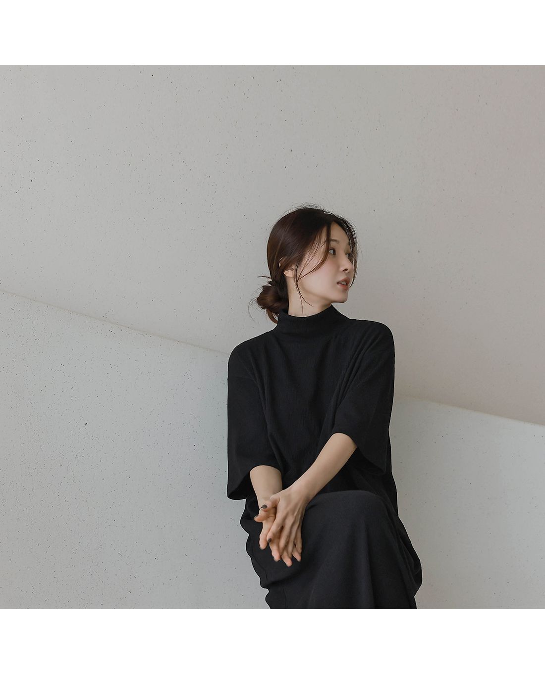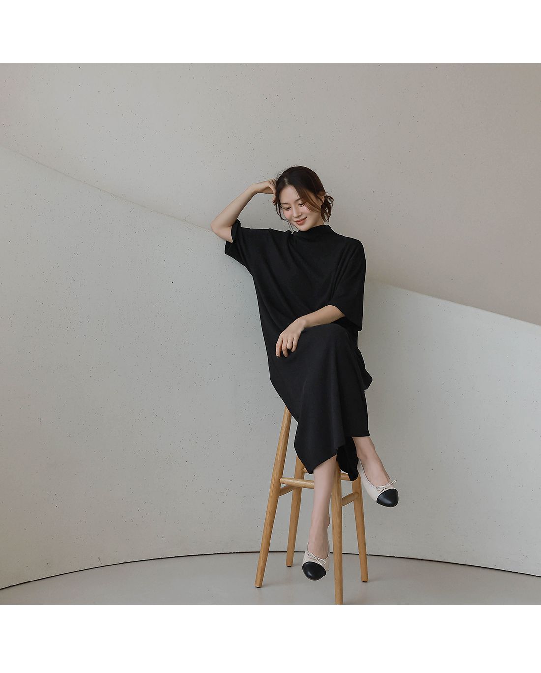 【C55573】韓國BLG 坑條立領洋裝-素面高領寬鬆直筒七分寬袖連身裙★★