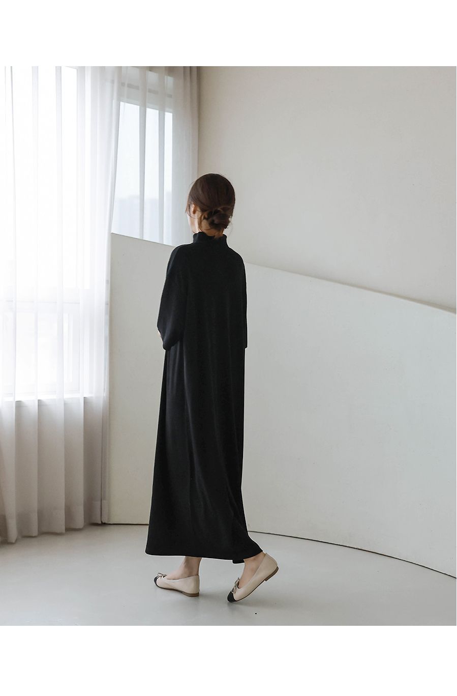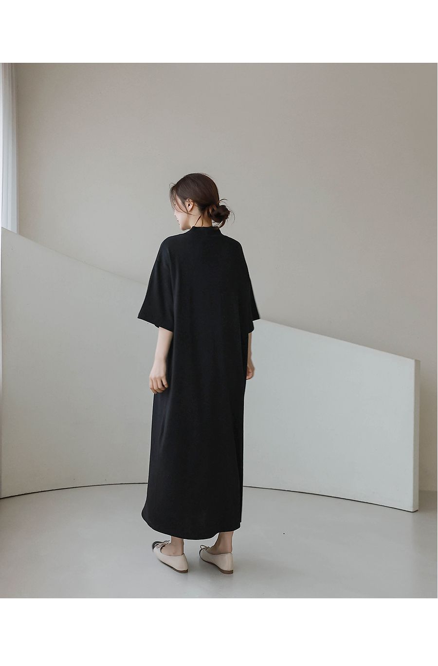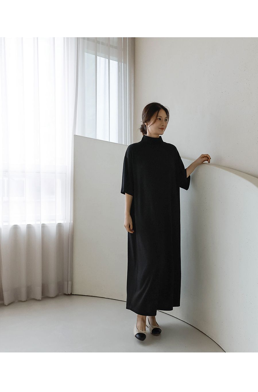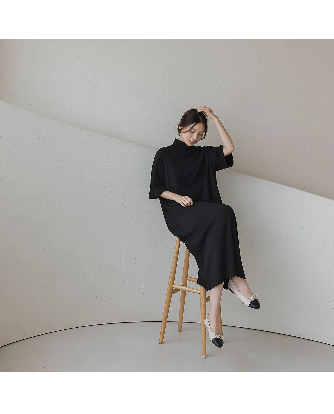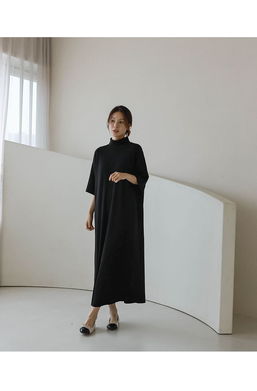 【C55573】韓國BLG 坑條立領洋裝-素面高領寬鬆直筒七分寬袖連身裙★★