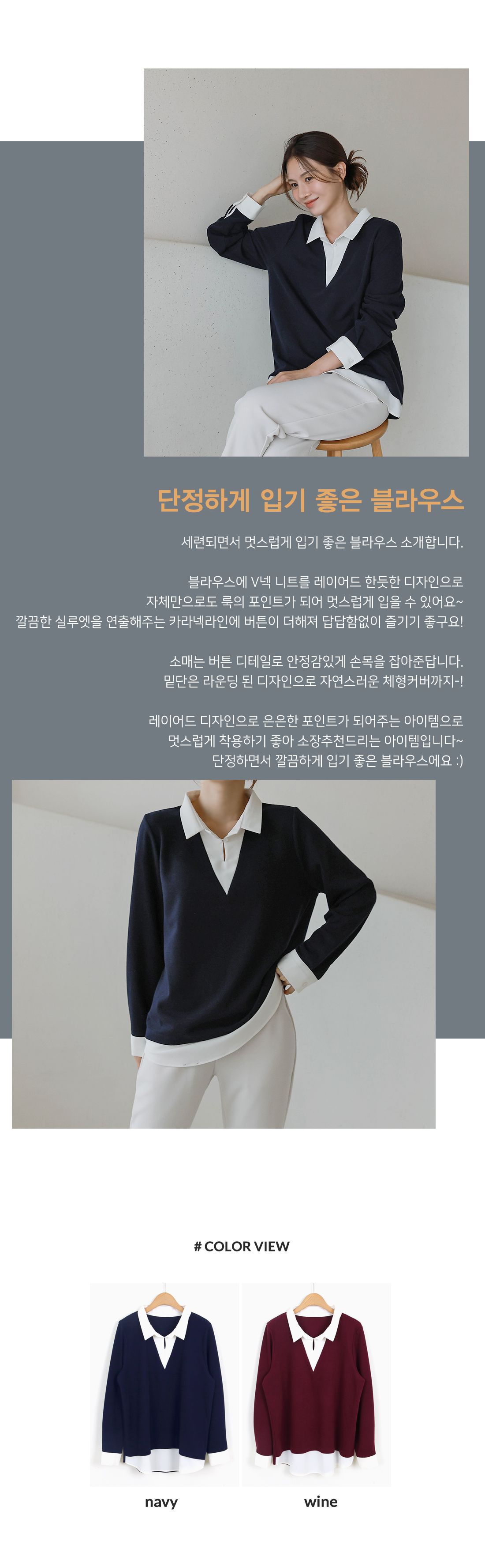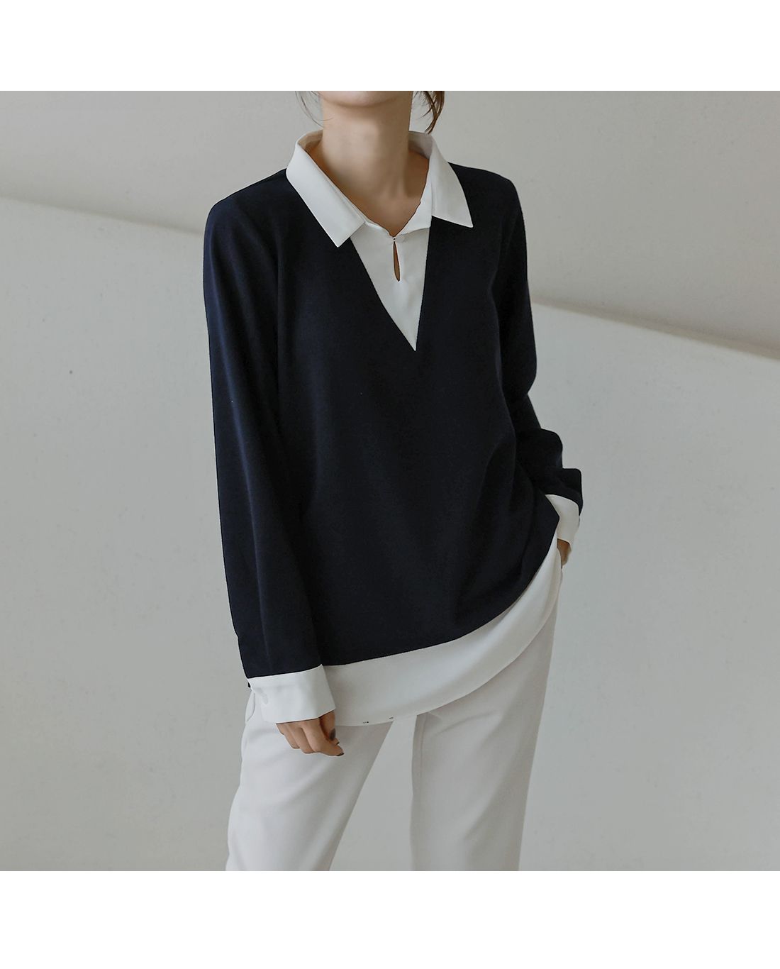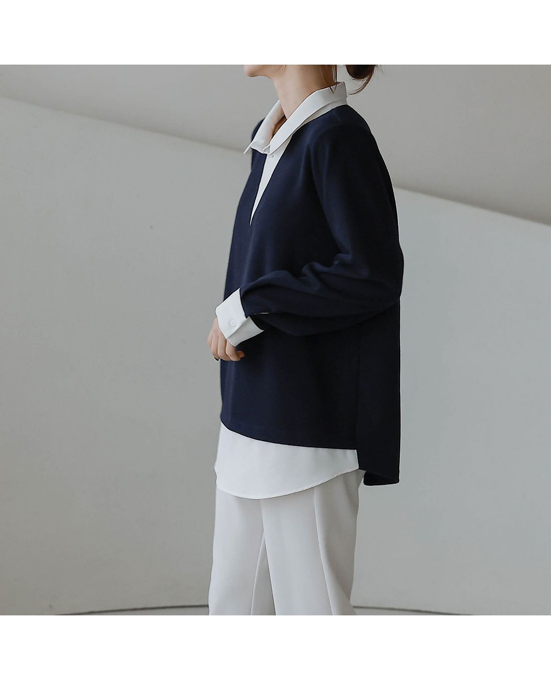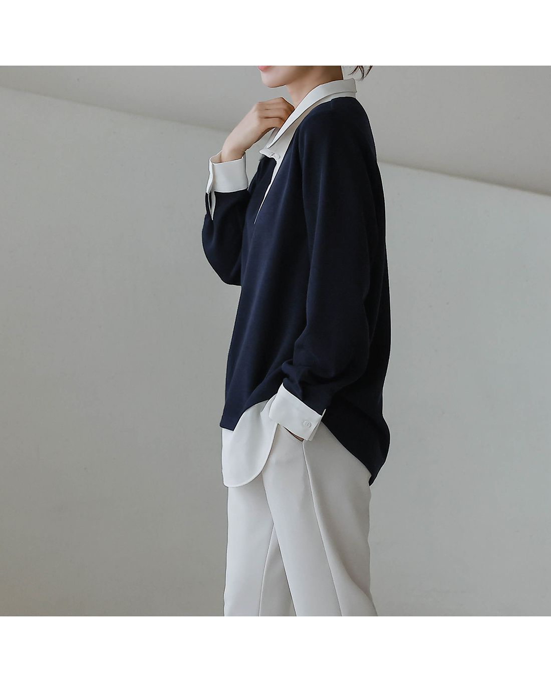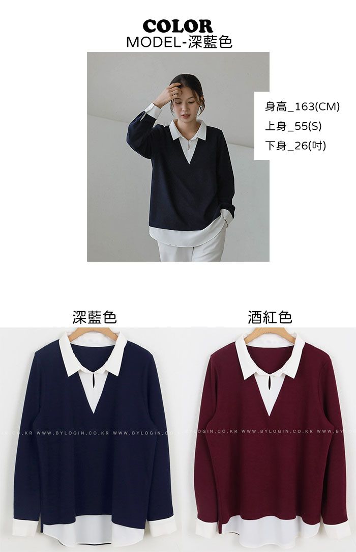 假兩件拼接/襯衫領/V領/單釦/弧形下襬/寬鬆長版 - 休閒居家OL上班族簡約百搭素面雪紡領針織衫針織上衣寬鬆大尺碼上衣長版上衣長袖上衣多尺寸LXL2XL深藍色酒紅色
