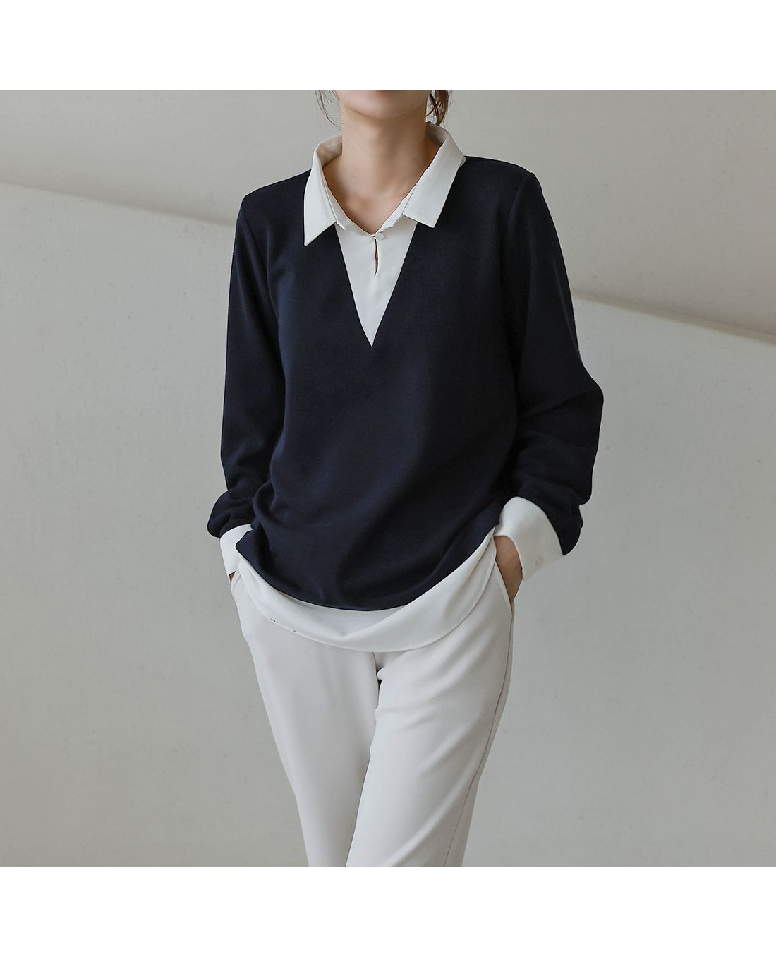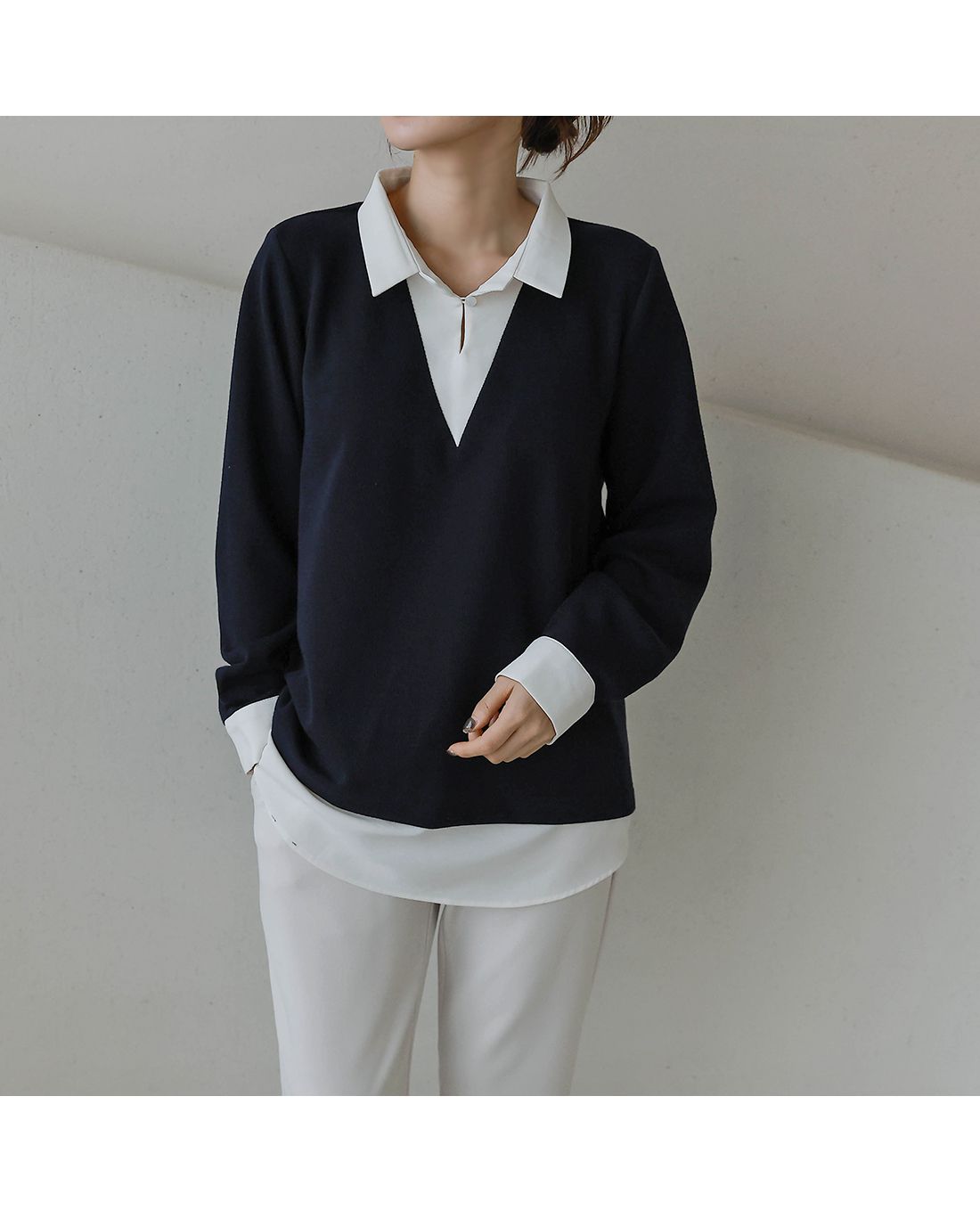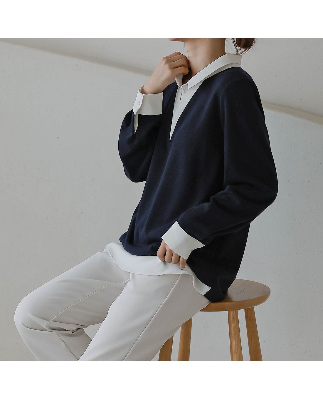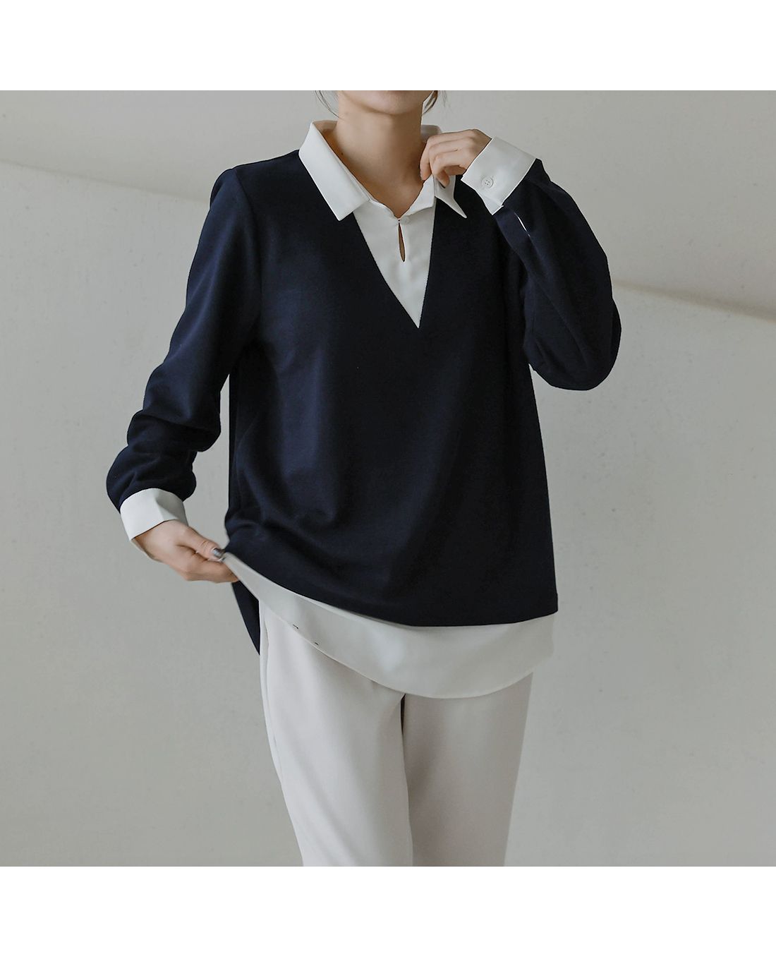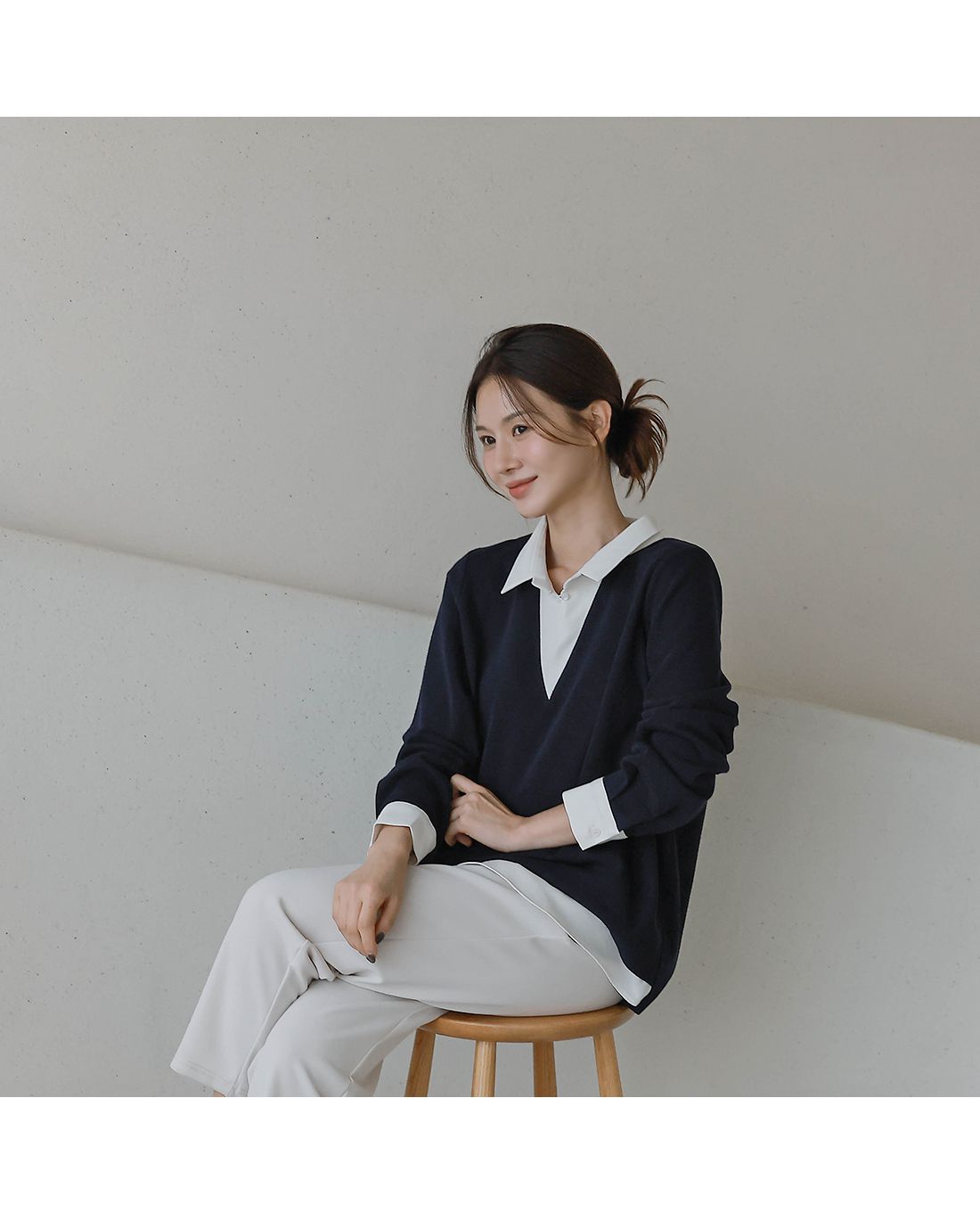 假兩件拼接/襯衫領/V領/單釦/弧形下襬/寬鬆長版 - 休閒居家OL上班族簡約百搭素面雪紡領針織衫針織上衣寬鬆大尺碼上衣長版上衣長袖上衣多尺寸LXL2XL深藍色酒紅色
