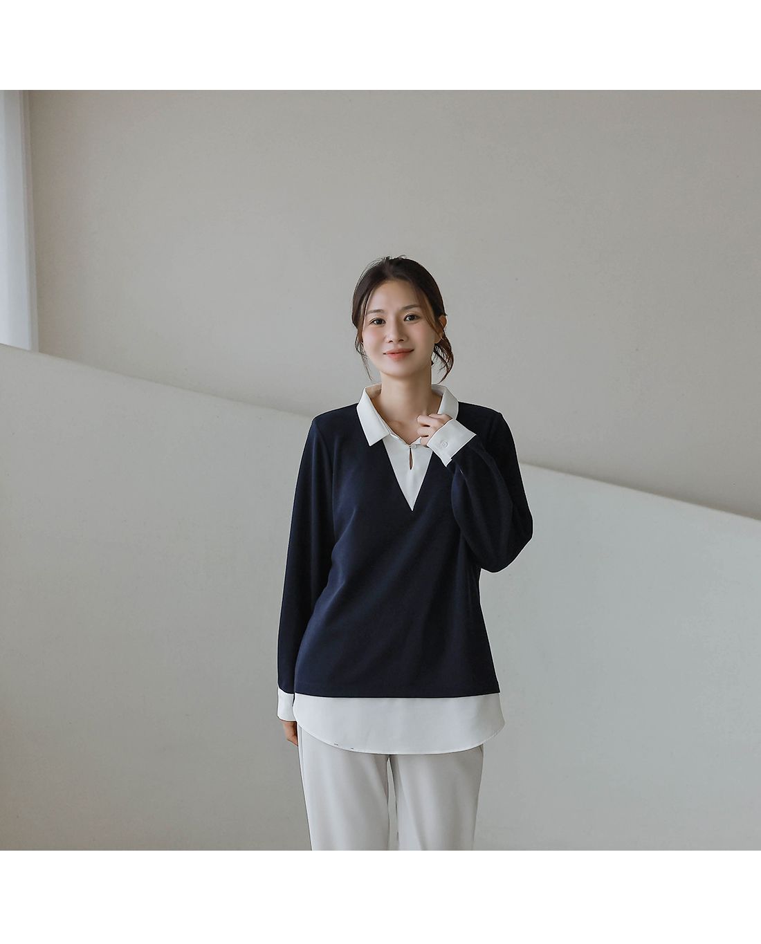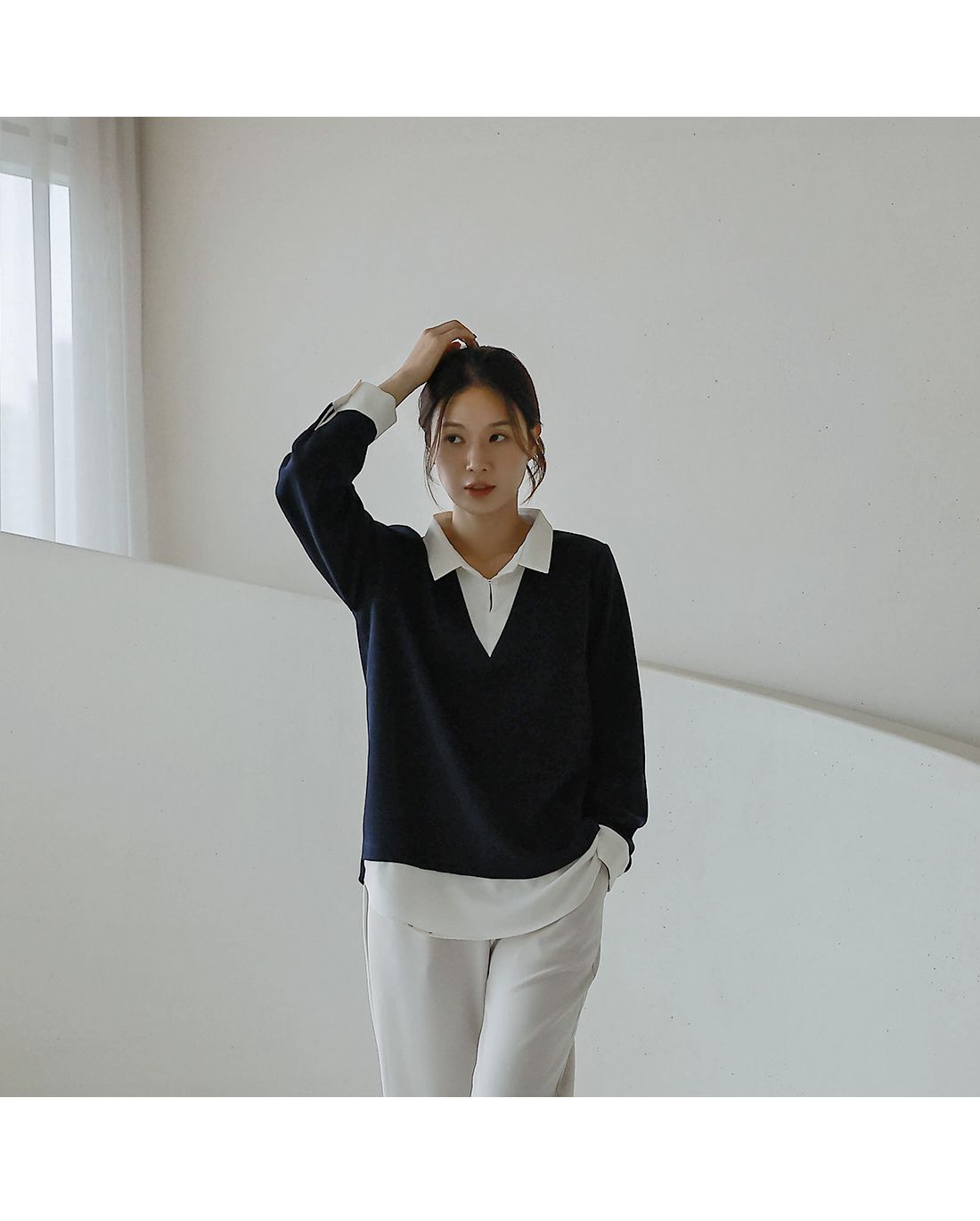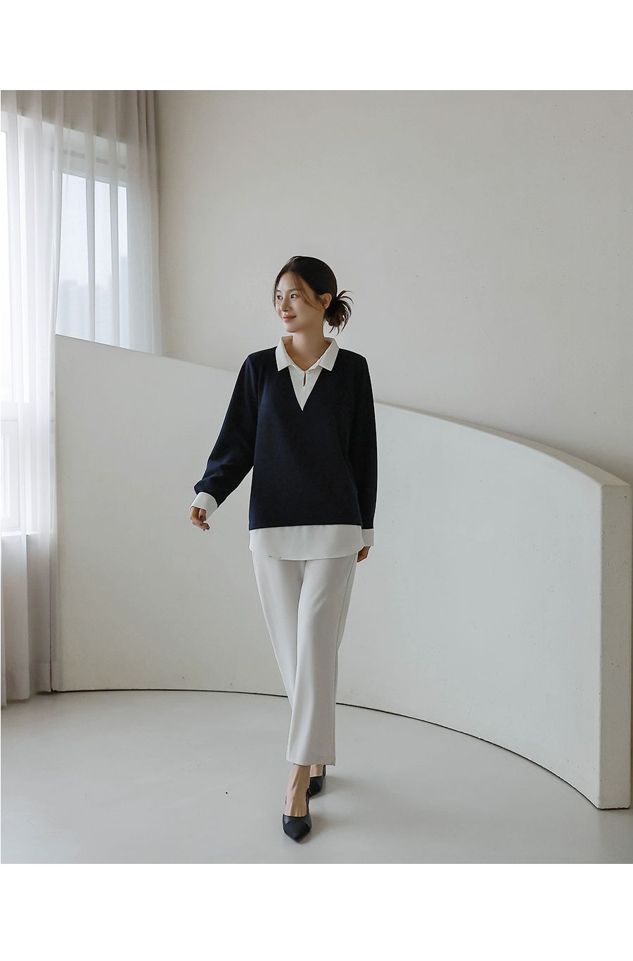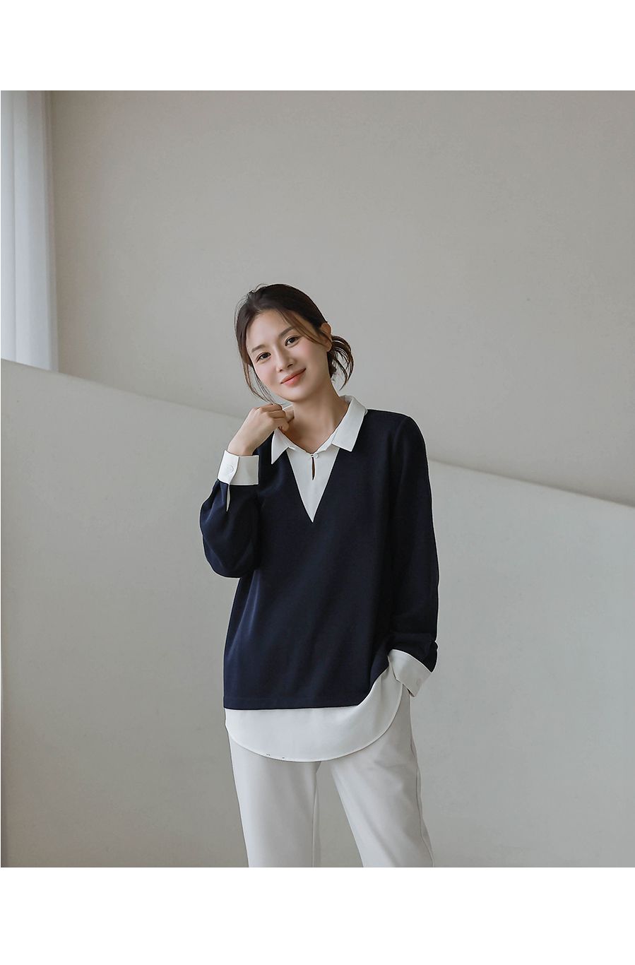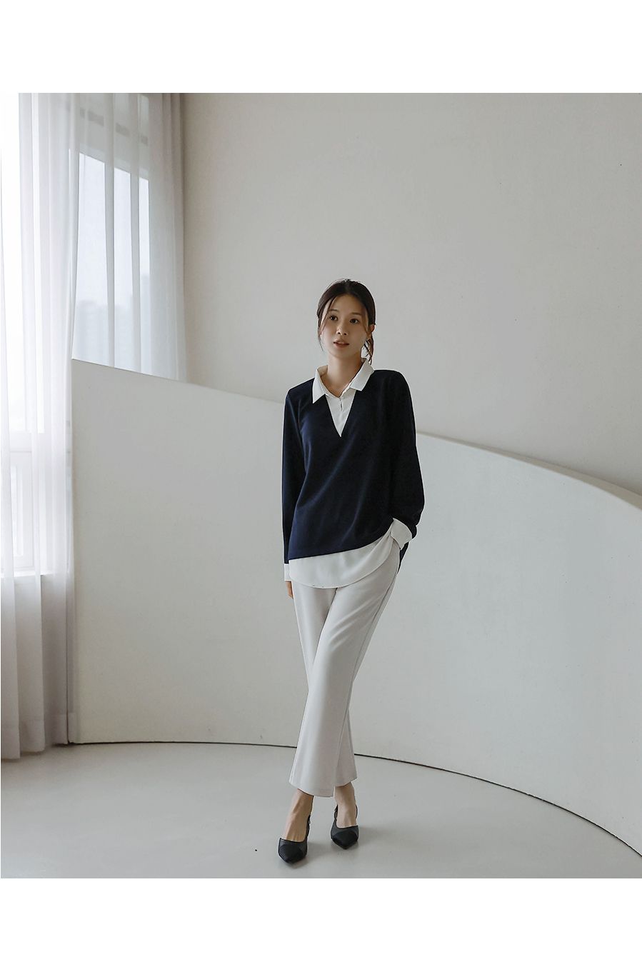 假兩件拼接/襯衫領/V領/單釦/弧形下襬/寬鬆長版 - 休閒居家OL上班族簡約百搭素面雪紡領針織衫針織上衣寬鬆大尺碼上衣長版上衣長袖上衣多尺寸LXL2XL深藍色酒紅色