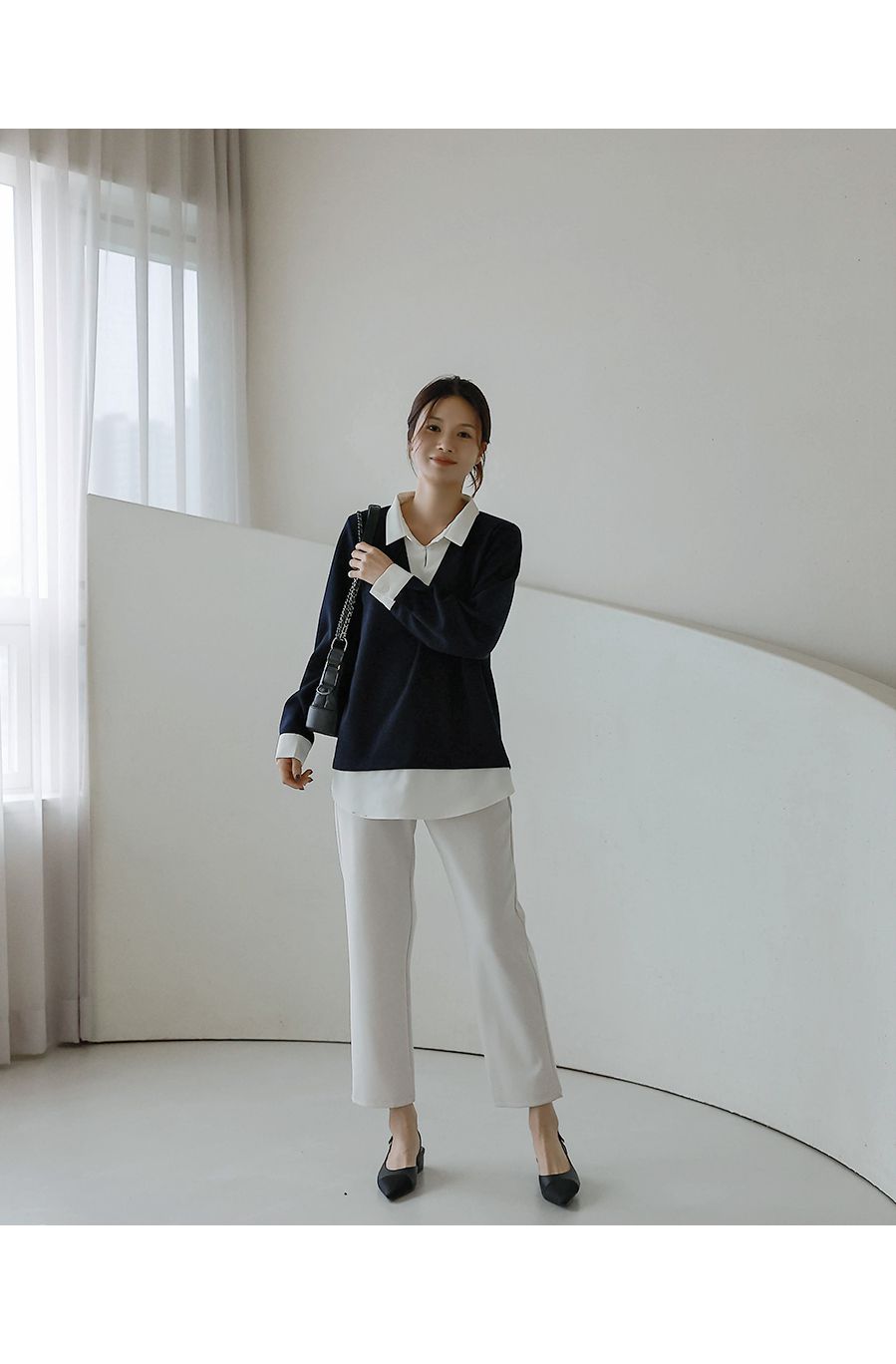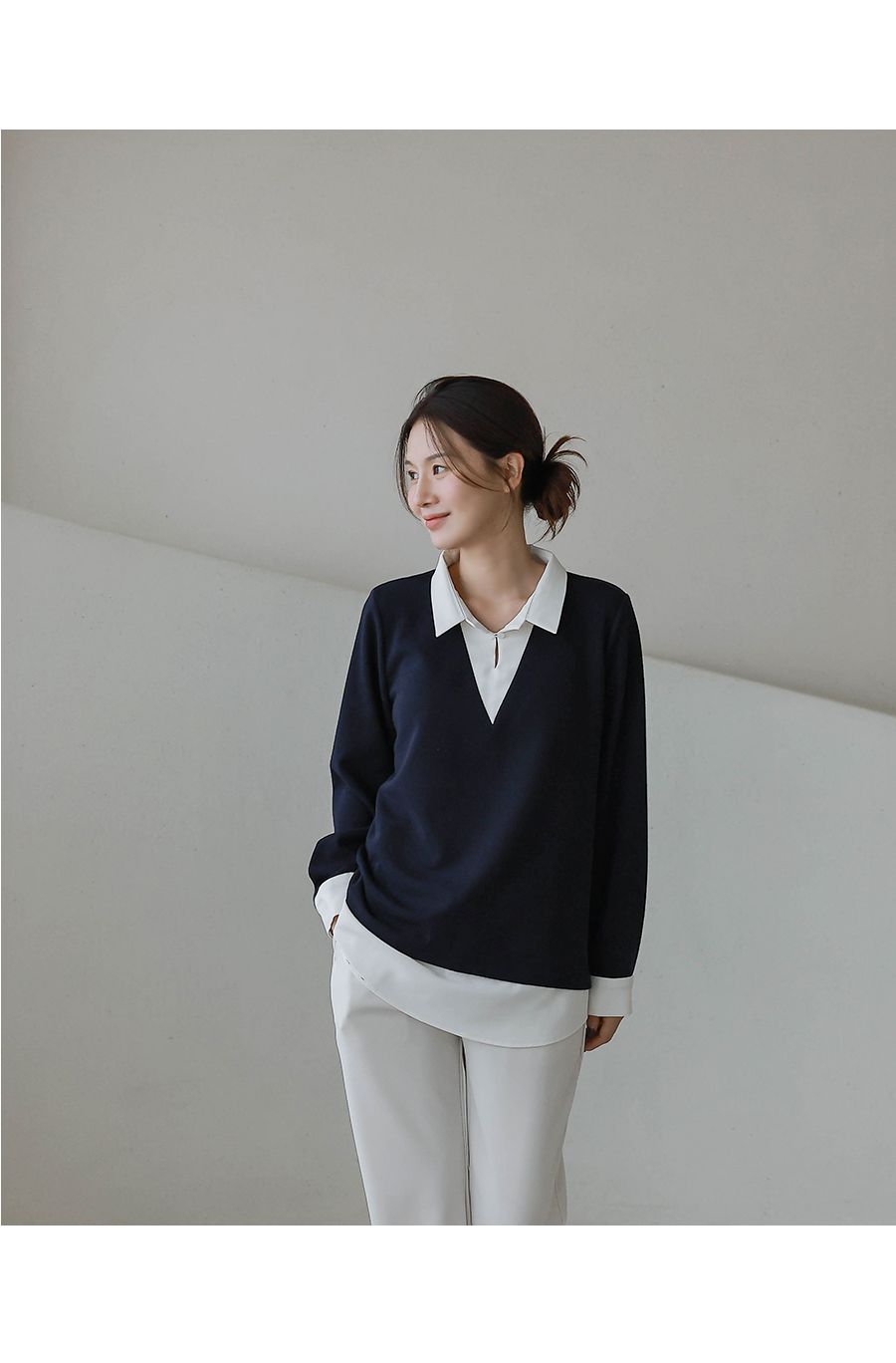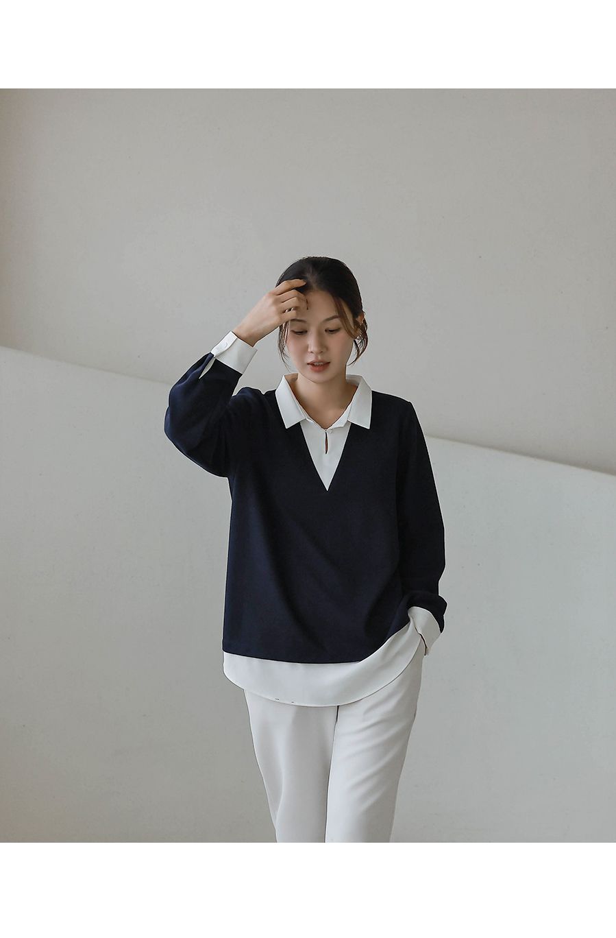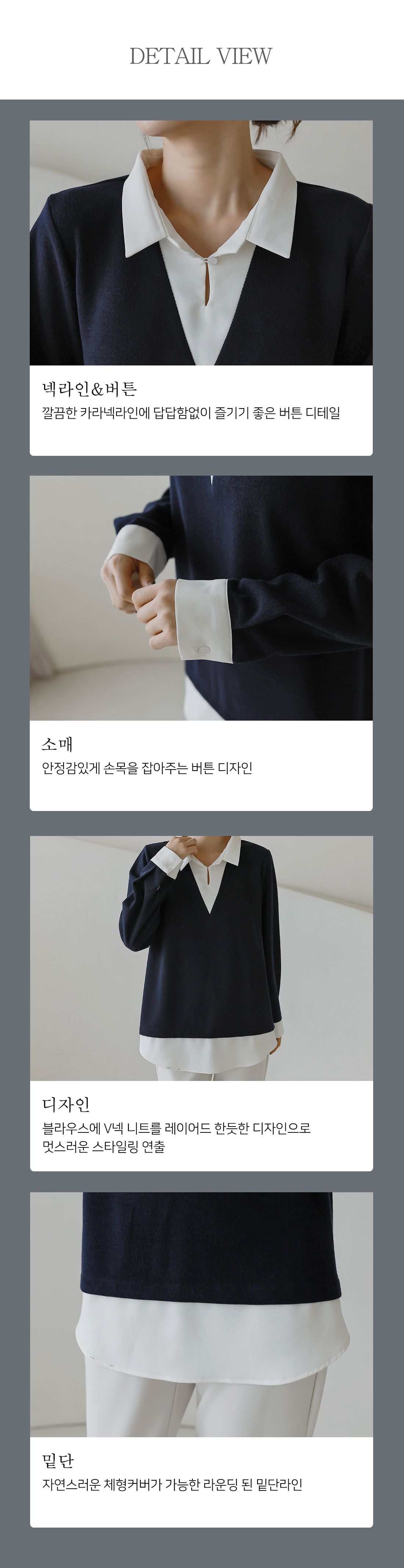 假兩件拼接/襯衫領/V領/單釦/弧形下襬/寬鬆長版 - 休閒居家OL上班族簡約百搭素面雪紡領針織衫針織上衣寬鬆大尺碼上衣長版上衣長袖上衣多尺寸LXL2XL深藍色酒紅色