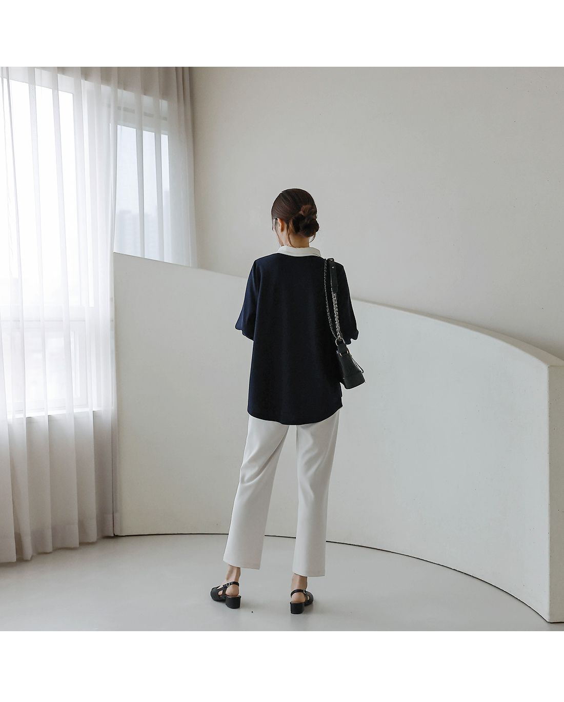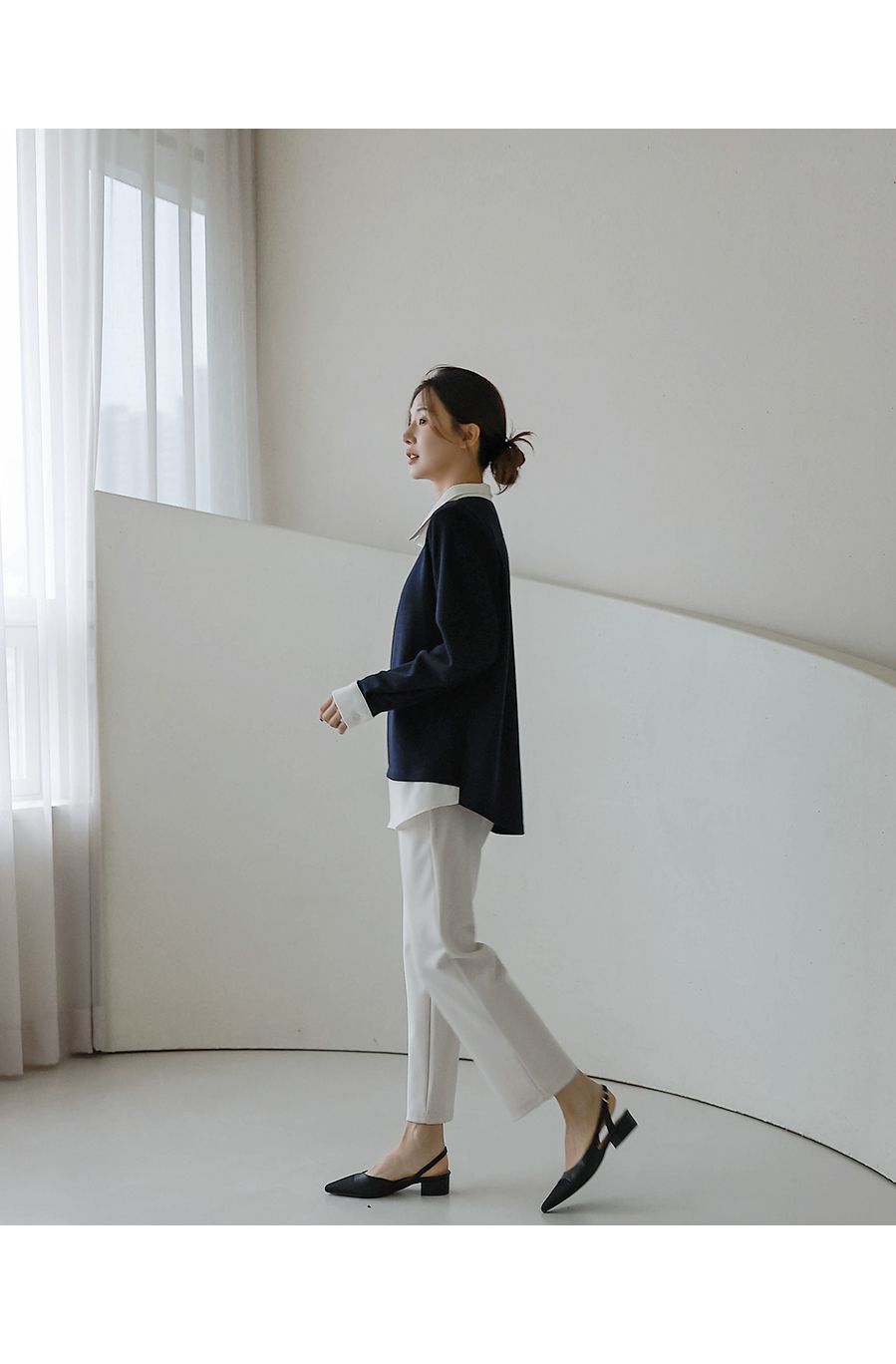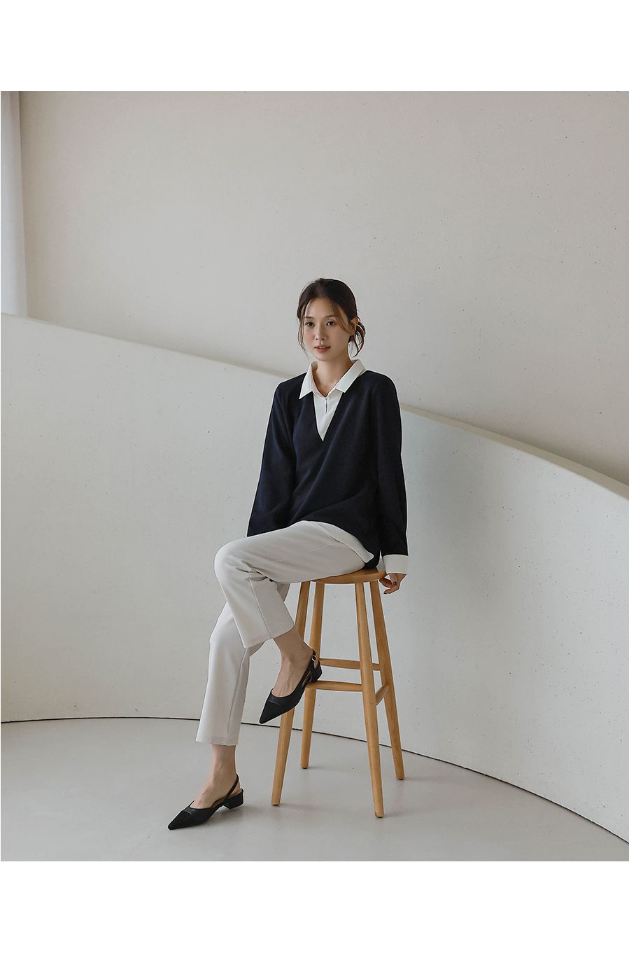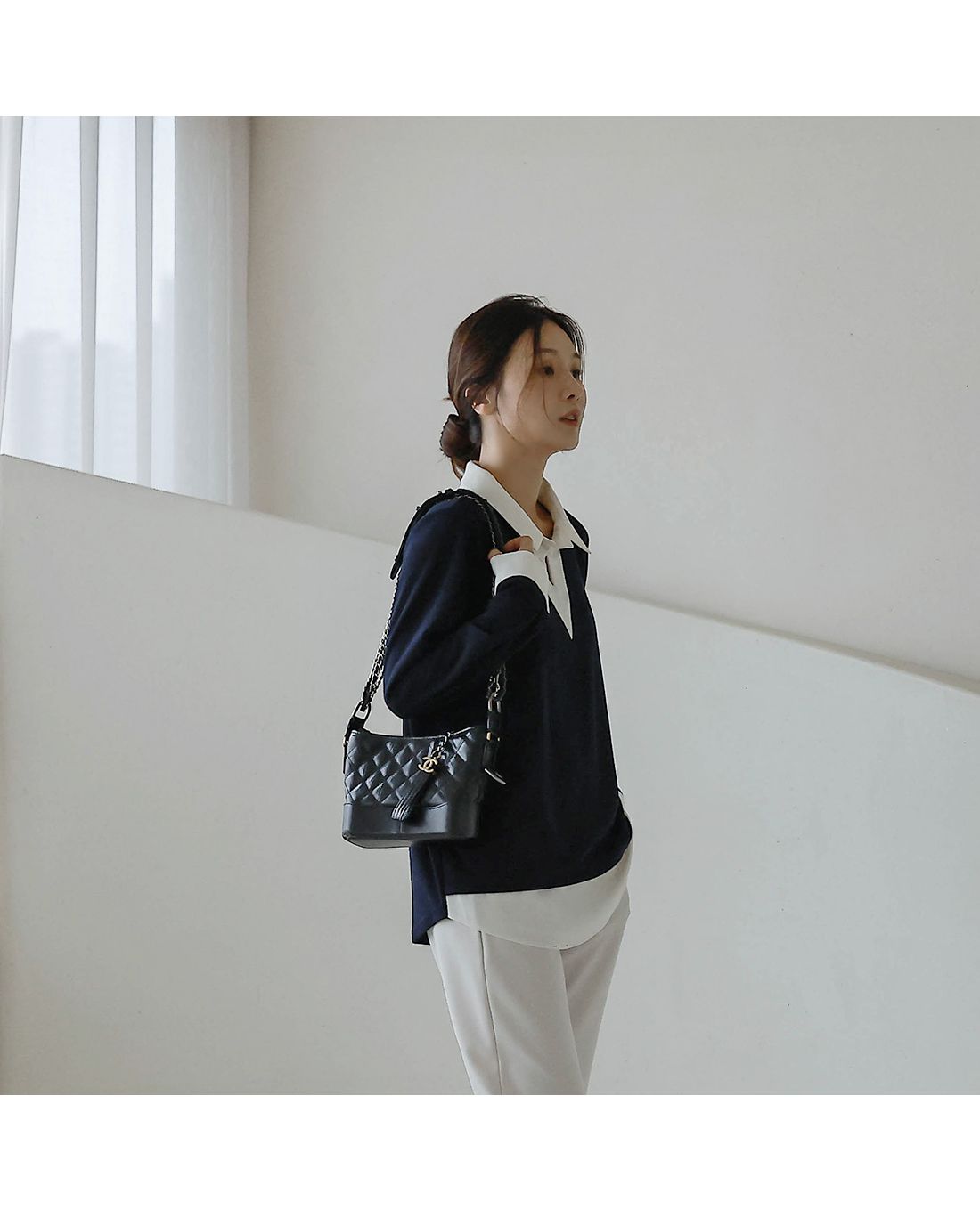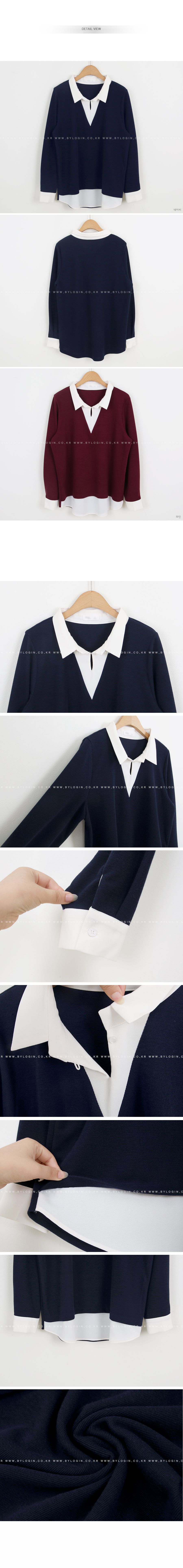 假兩件拼接/襯衫領/V領/單釦/弧形下襬/寬鬆長版 - 休閒居家OL上班族簡約百搭素面雪紡領針織衫針織上衣寬鬆大尺碼上衣長版上衣長袖上衣多尺寸LXL2XL深藍色酒紅色