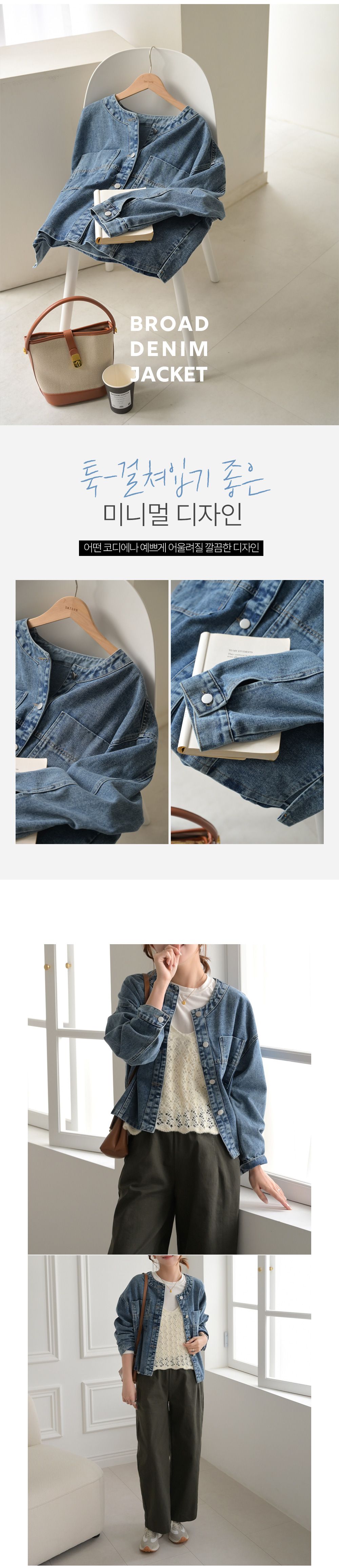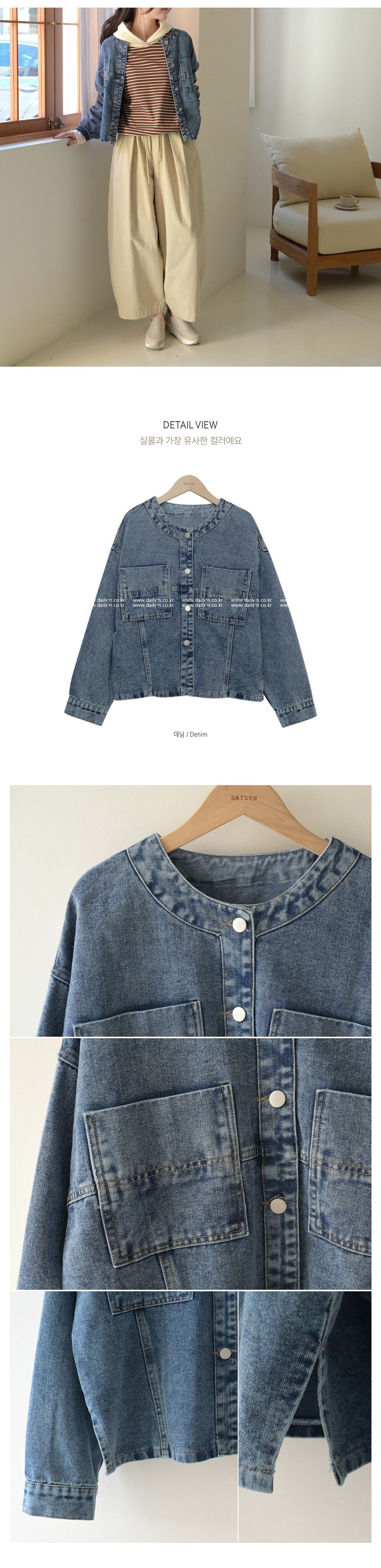 雙口袋/大口袋/切割車線/側開衩/圓領/開襟排釦/金屬釦/寬鬆短版 - 休閒居家簡約百搭素面圓弧領牛仔外套寬鬆大尺碼外套短版外套長袖外套藍色