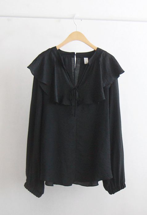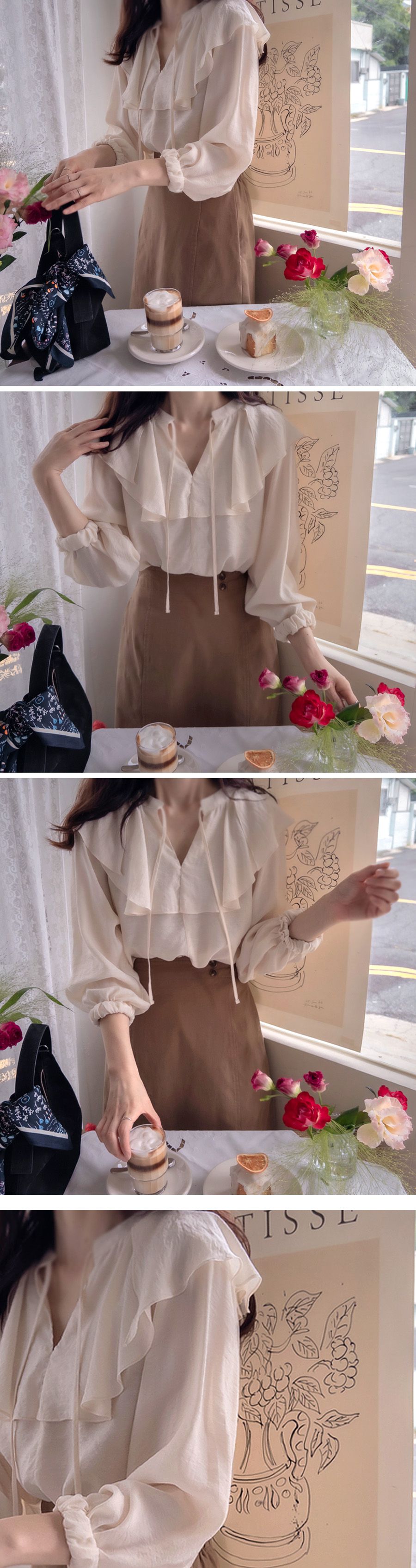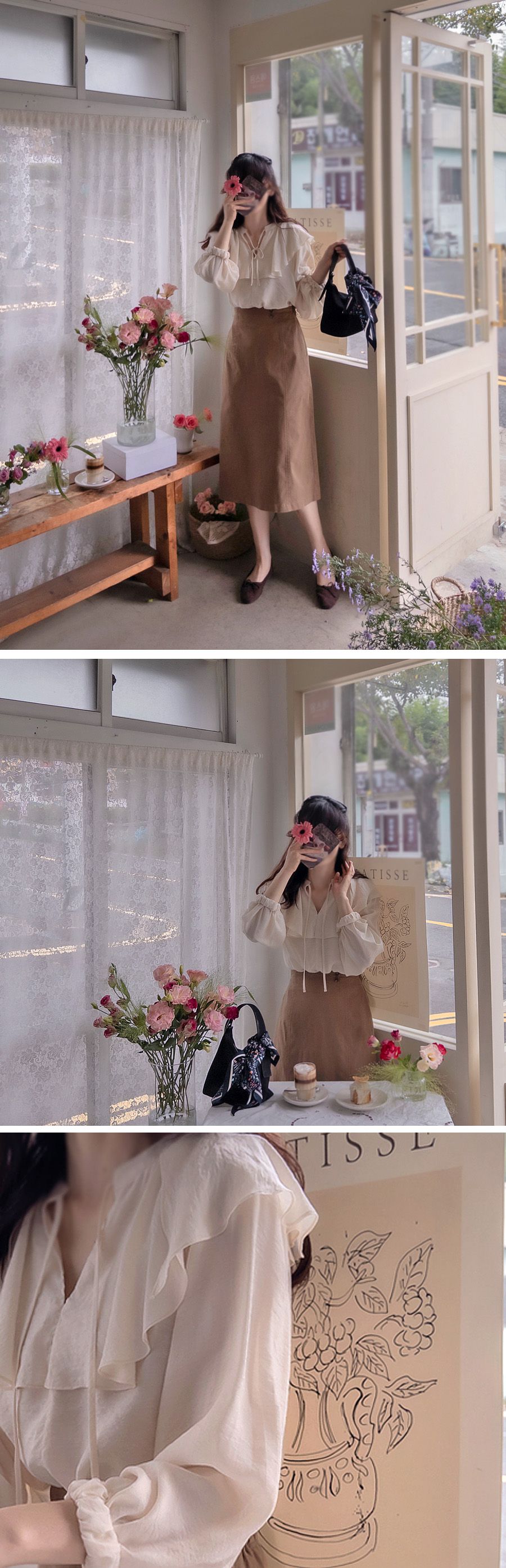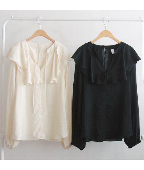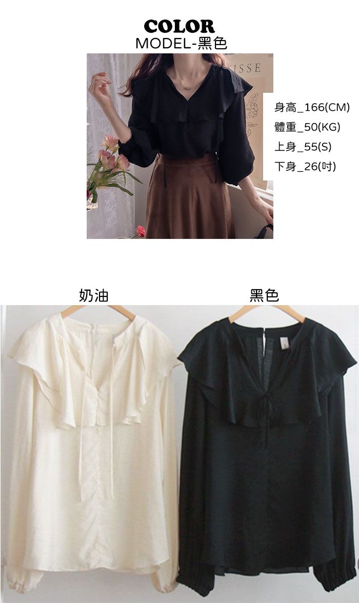 荷葉領/花瓣領/花邊領/綁帶V領/後領單釦/公主袖/寬袖/束口袖 - 休閒居家渡假婚禮OL上班族簡約百搭素面綁帶荷葉領襯衫上衣長袖上衣奶油色黑色