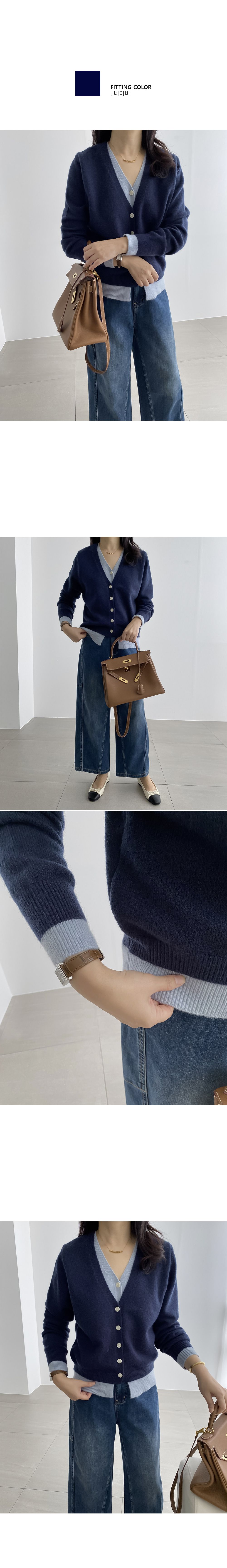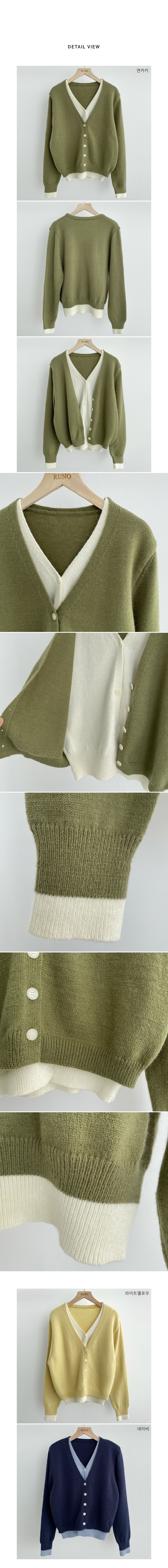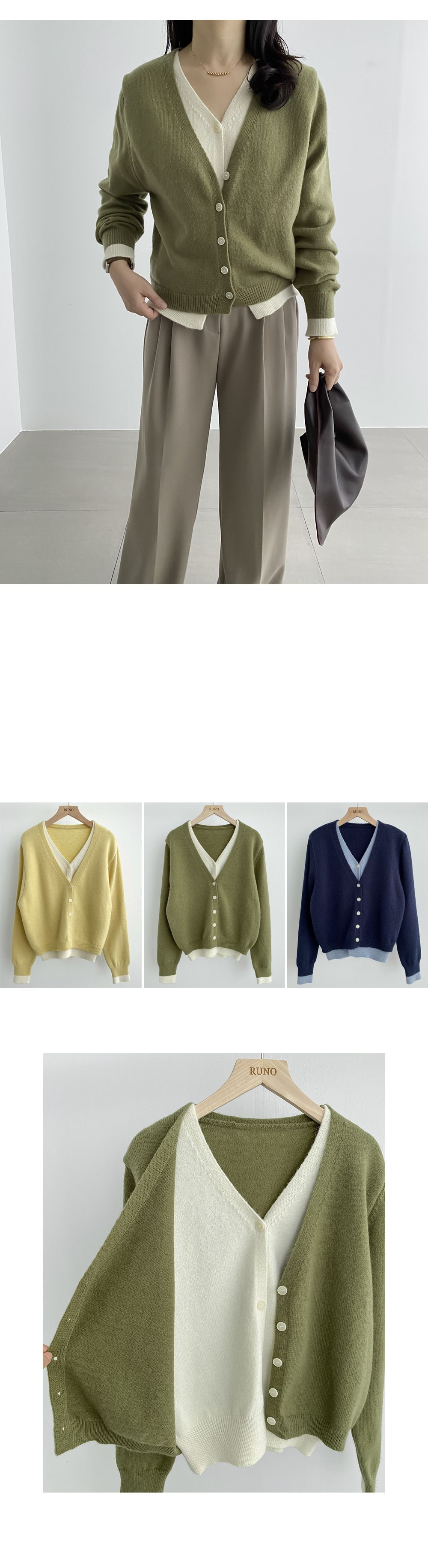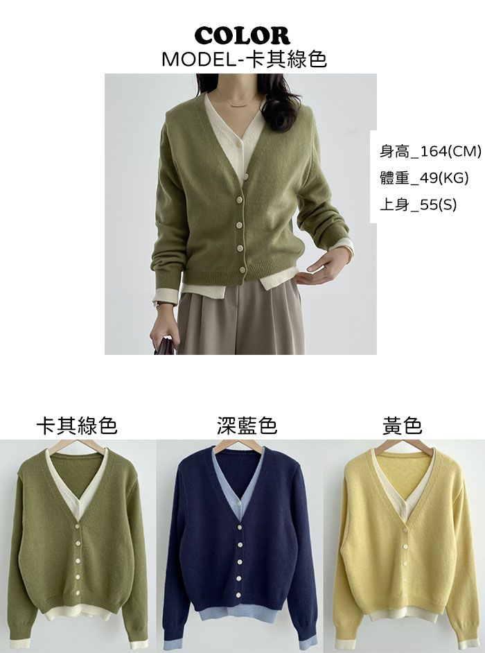 跳色/假兩件拼接/V領/開襟排釦(可開)/蓬鬆中厚面料/好氣色 - 休閒居家OL上班族簡約百搭素面雙層撞色針織衫針織上衣長袖上衣長袖外套針織外套卡其綠色深藍色黃色
