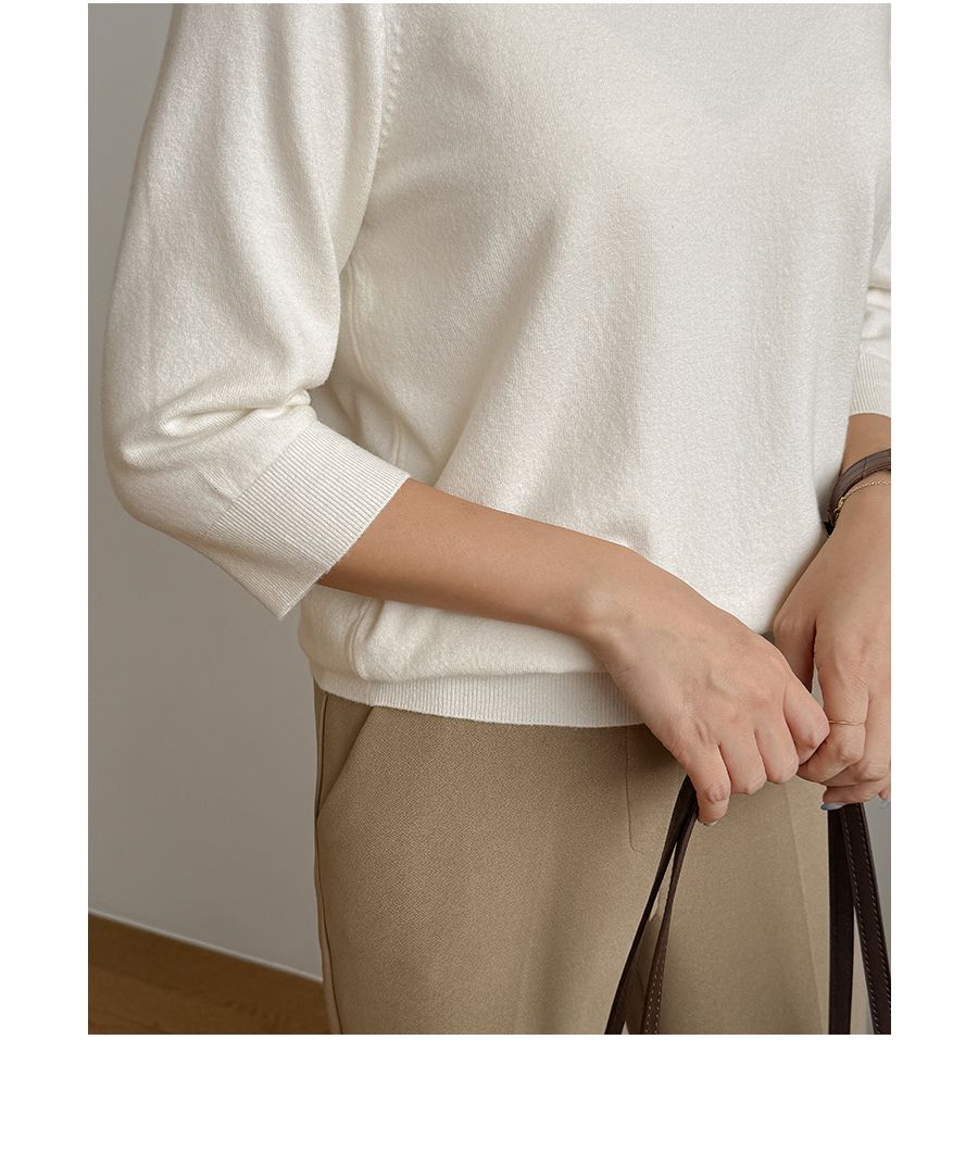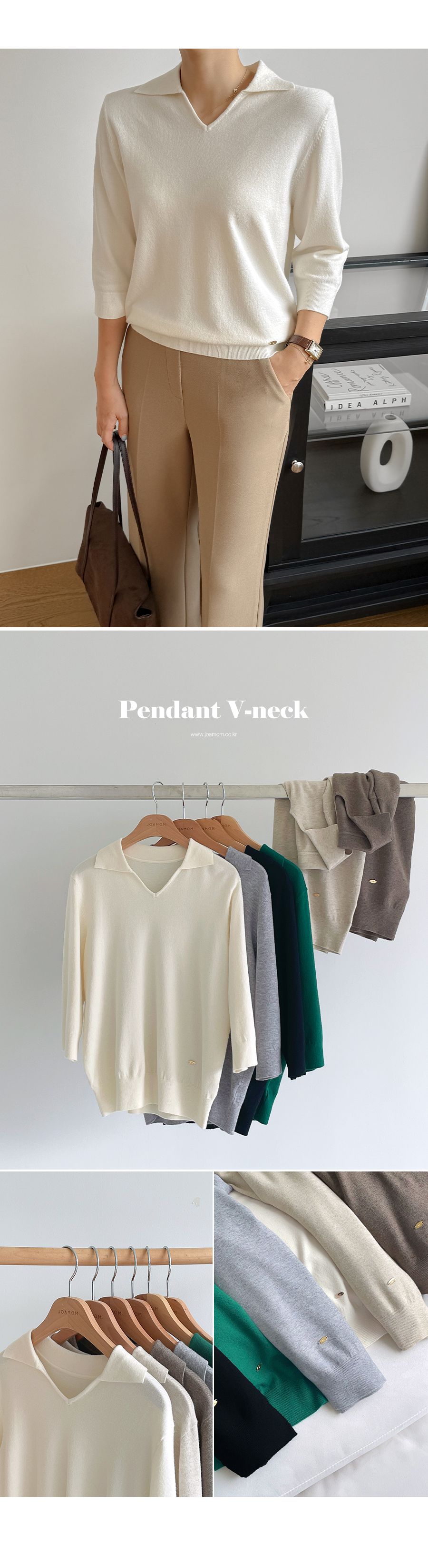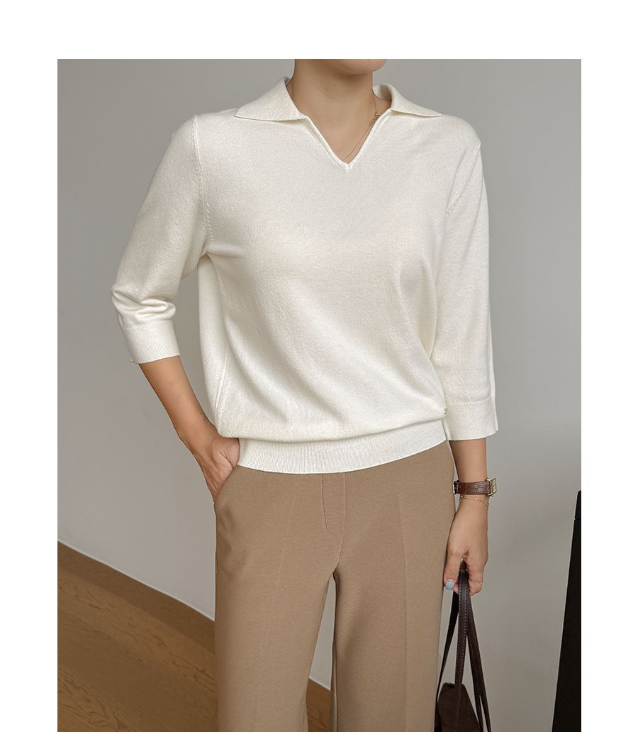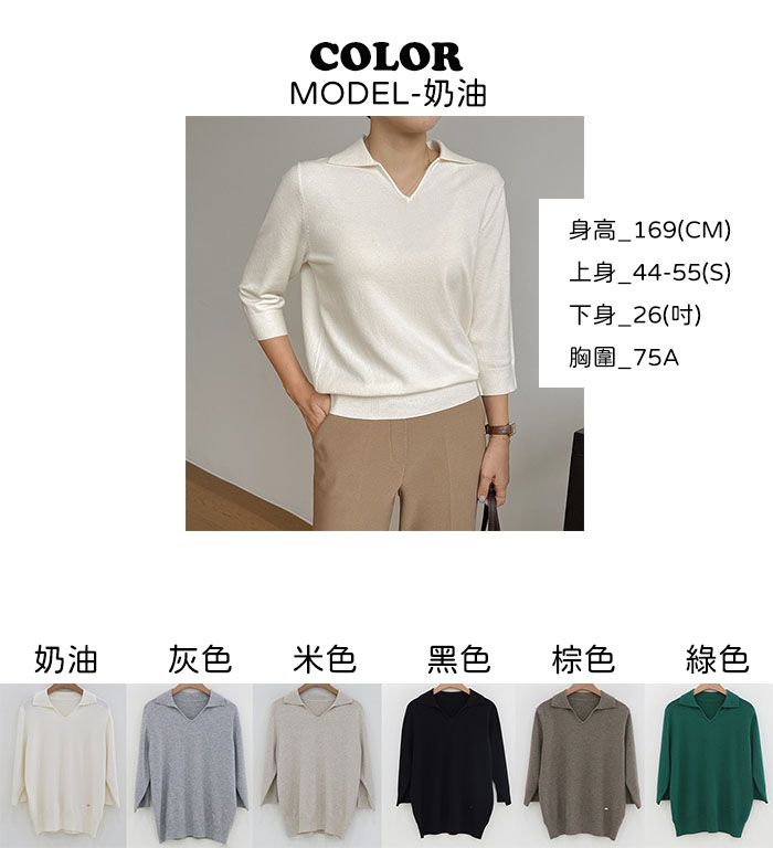 親膚柔軟/翻領/V領/金屬LOGO標 - 休閒居家OL上班族簡約百搭素面翻領針織衫針織上衣七分袖上衣奶油色灰色米色黑色棕色綠色