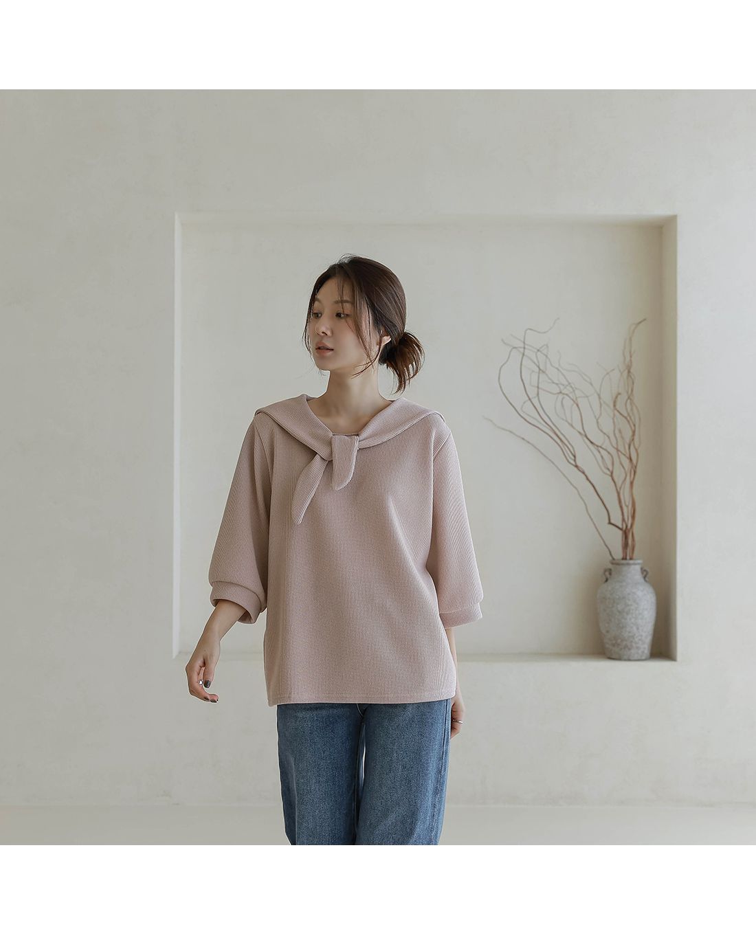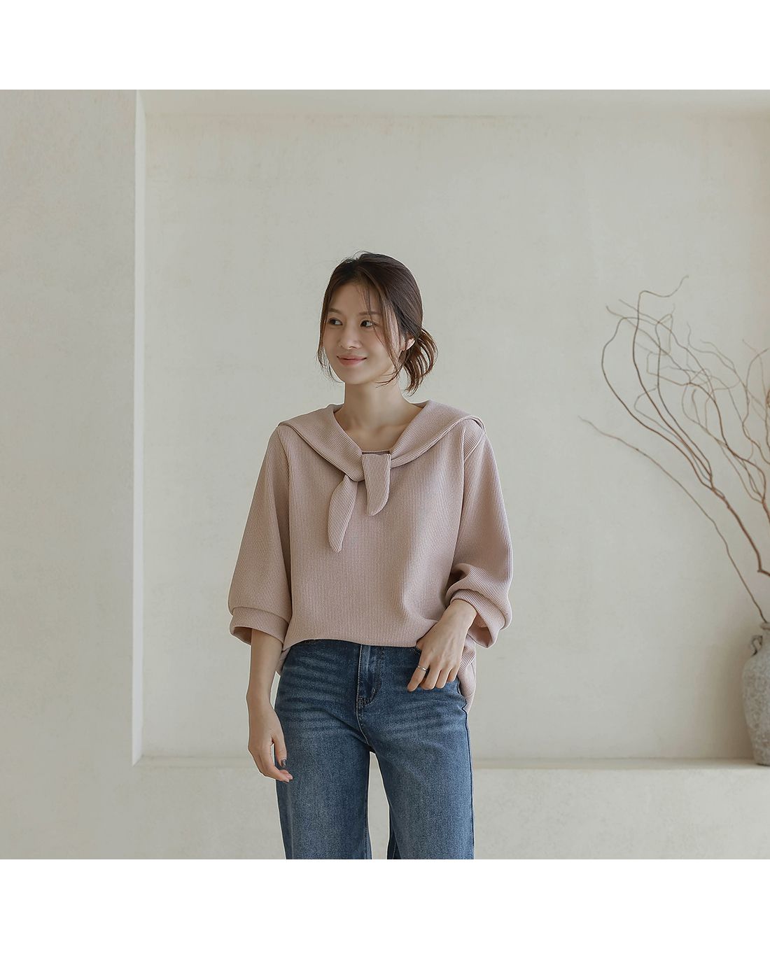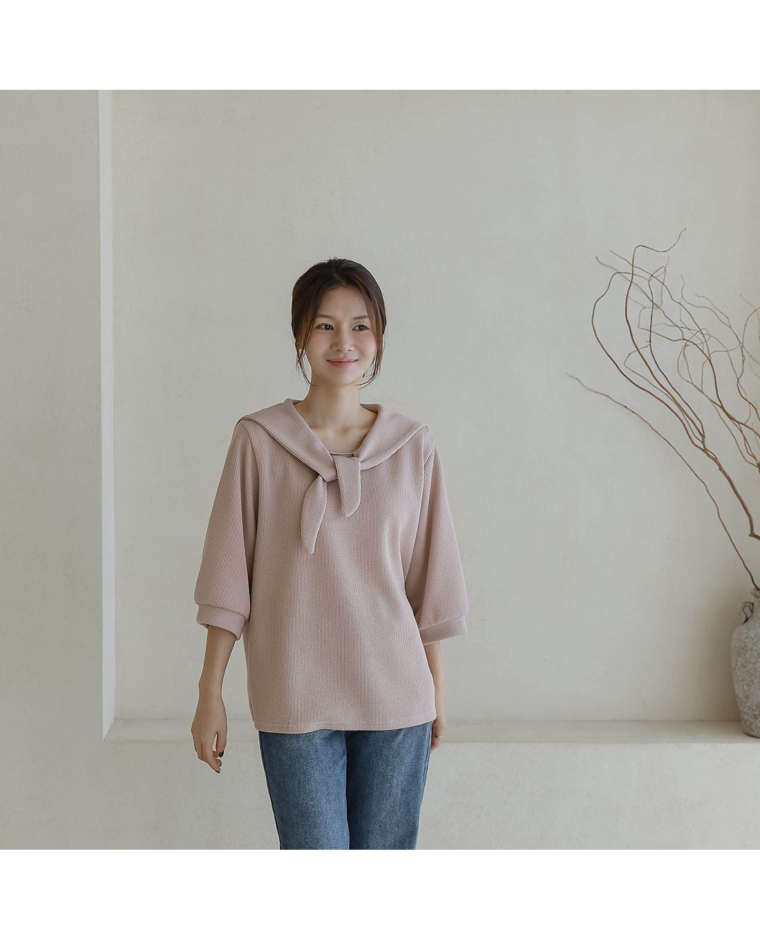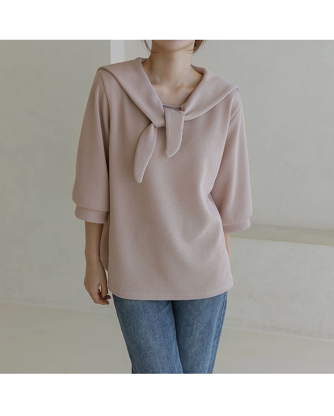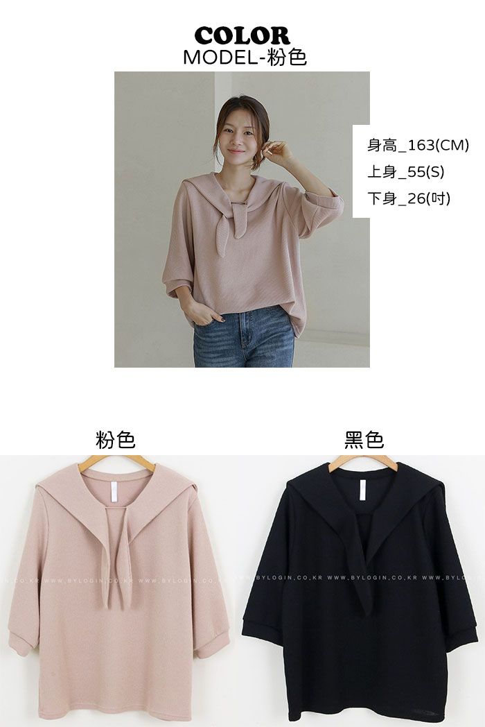 【C55608】韓國BLG 綁結水手領上衣-坑條素面好氣色V領七分袖寬袖★★