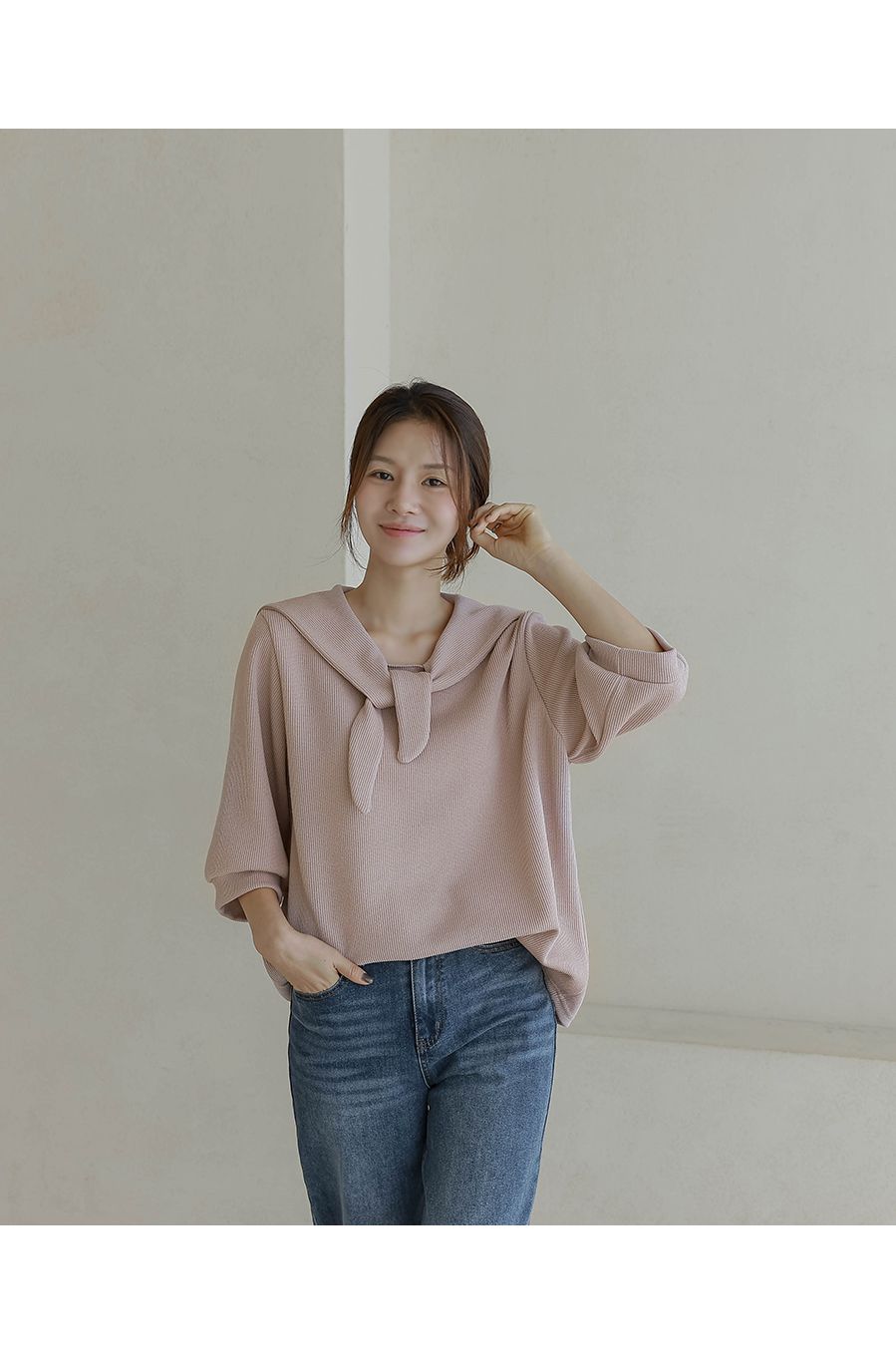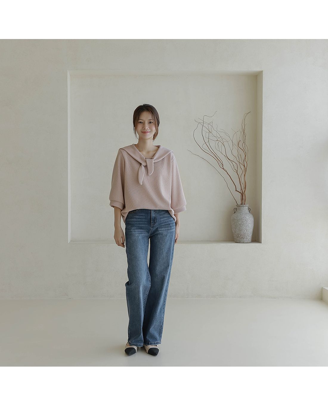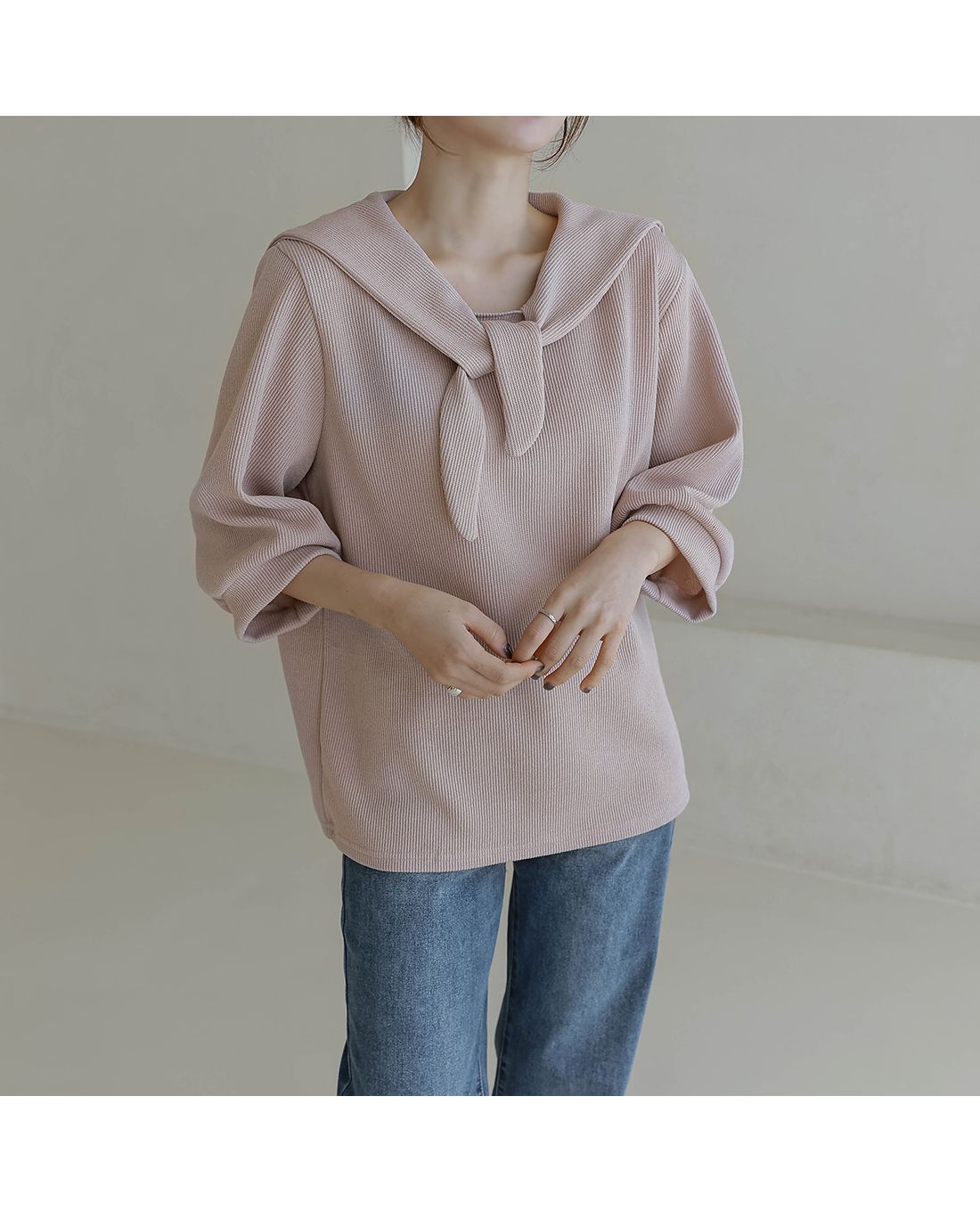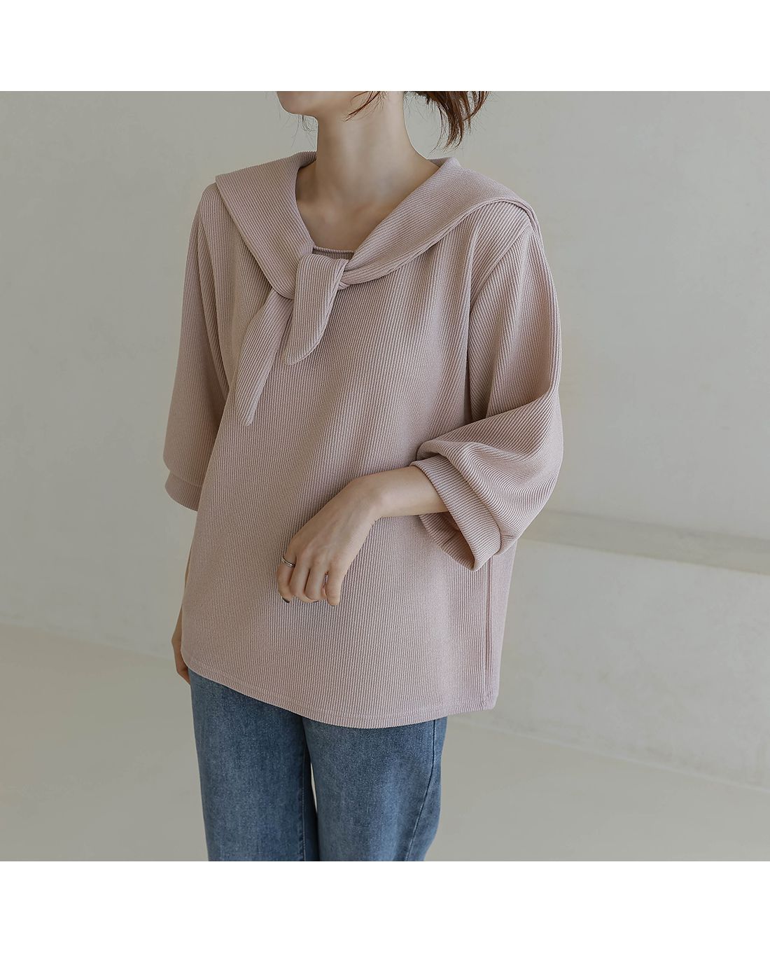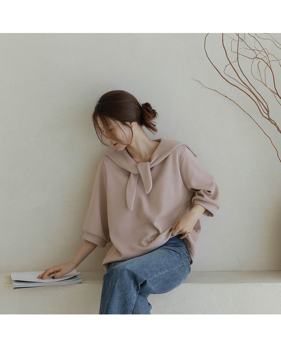 【C55608】韓國BLG 綁結水手領上衣-坑條素面好氣色V領七分袖寬袖★★
